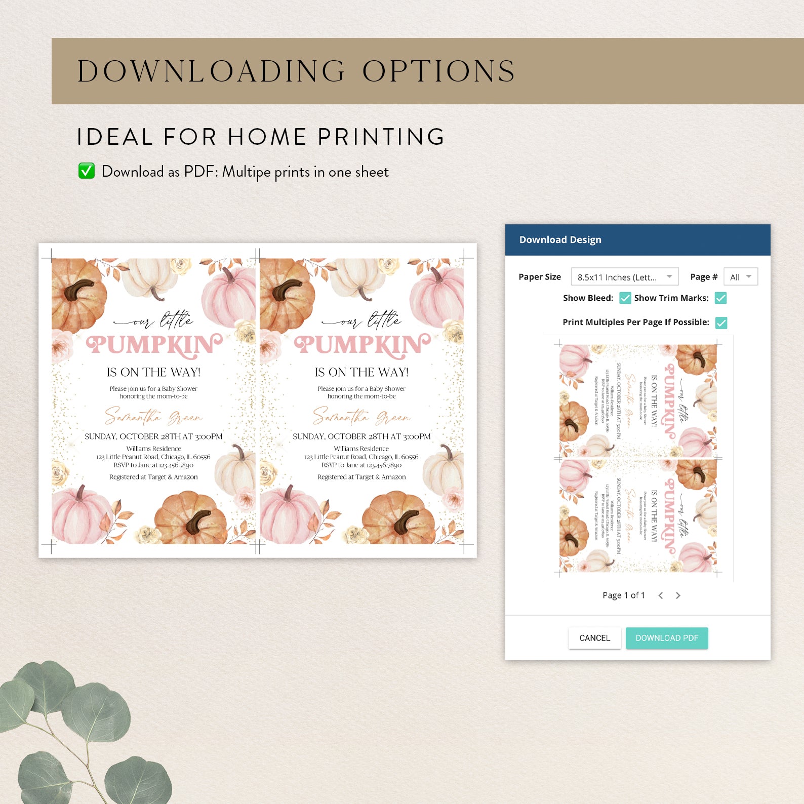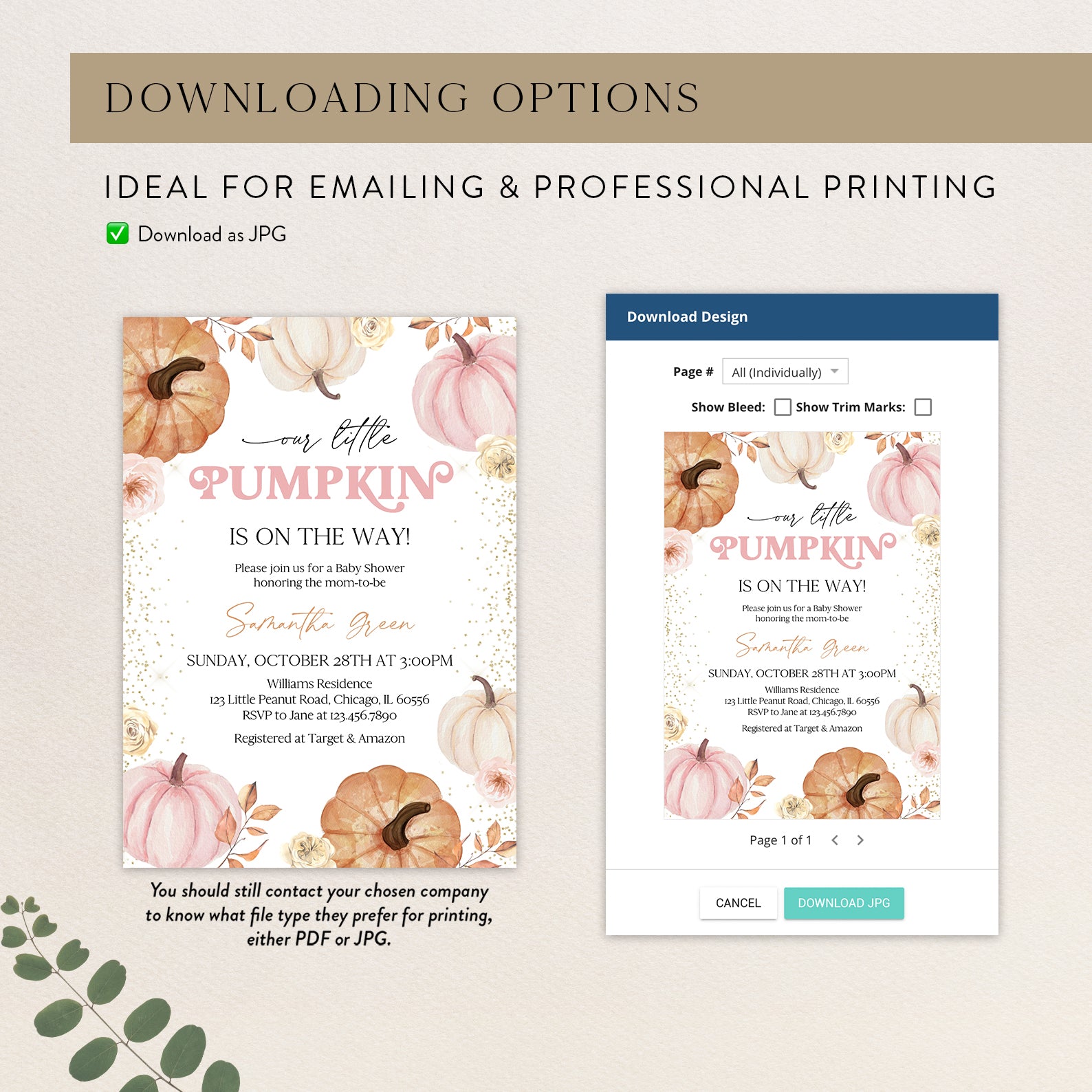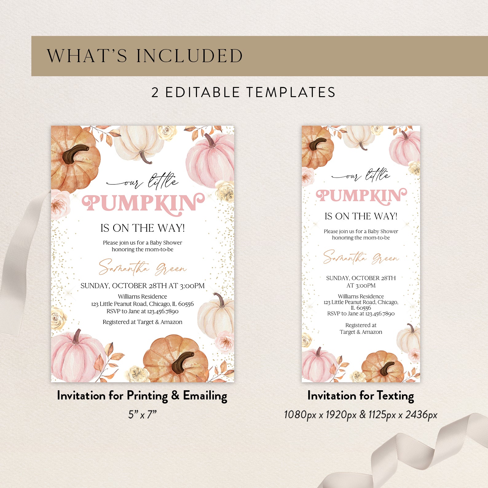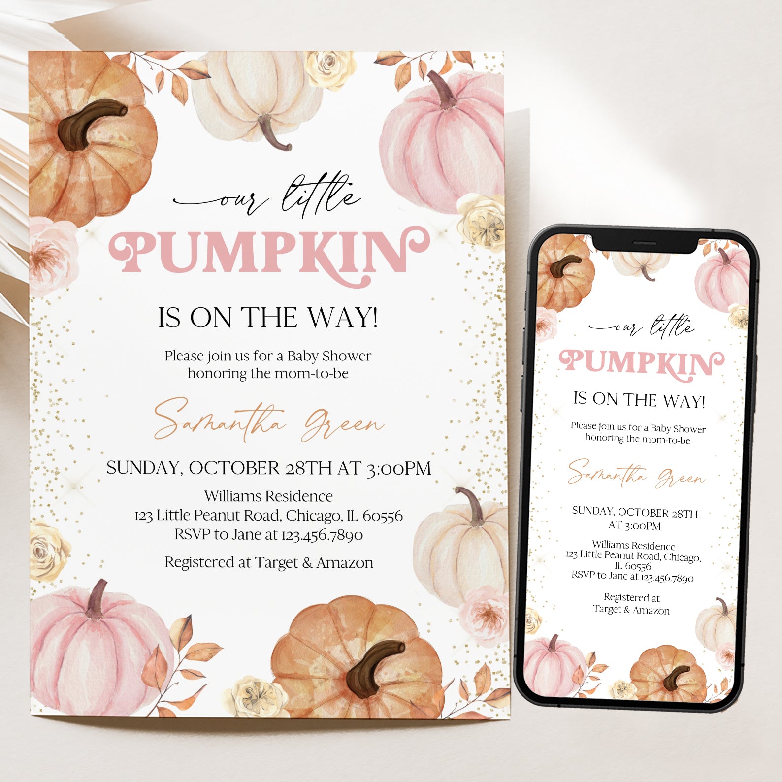 - Purchase this Little Pumpkin Baby Shower Invite: Watercolor Pumpkins & Gold template
