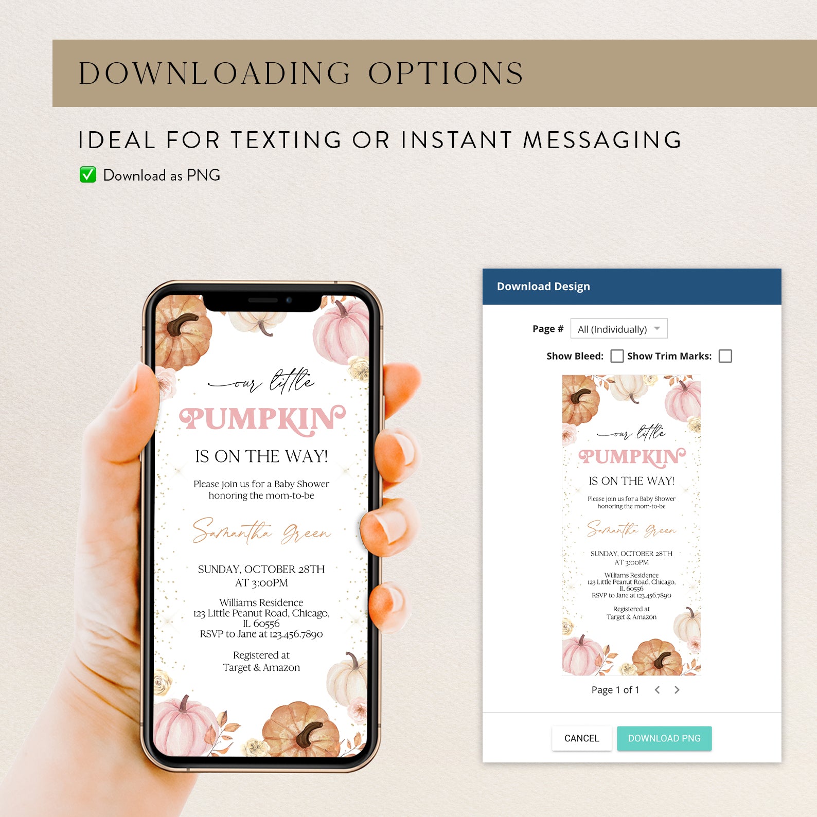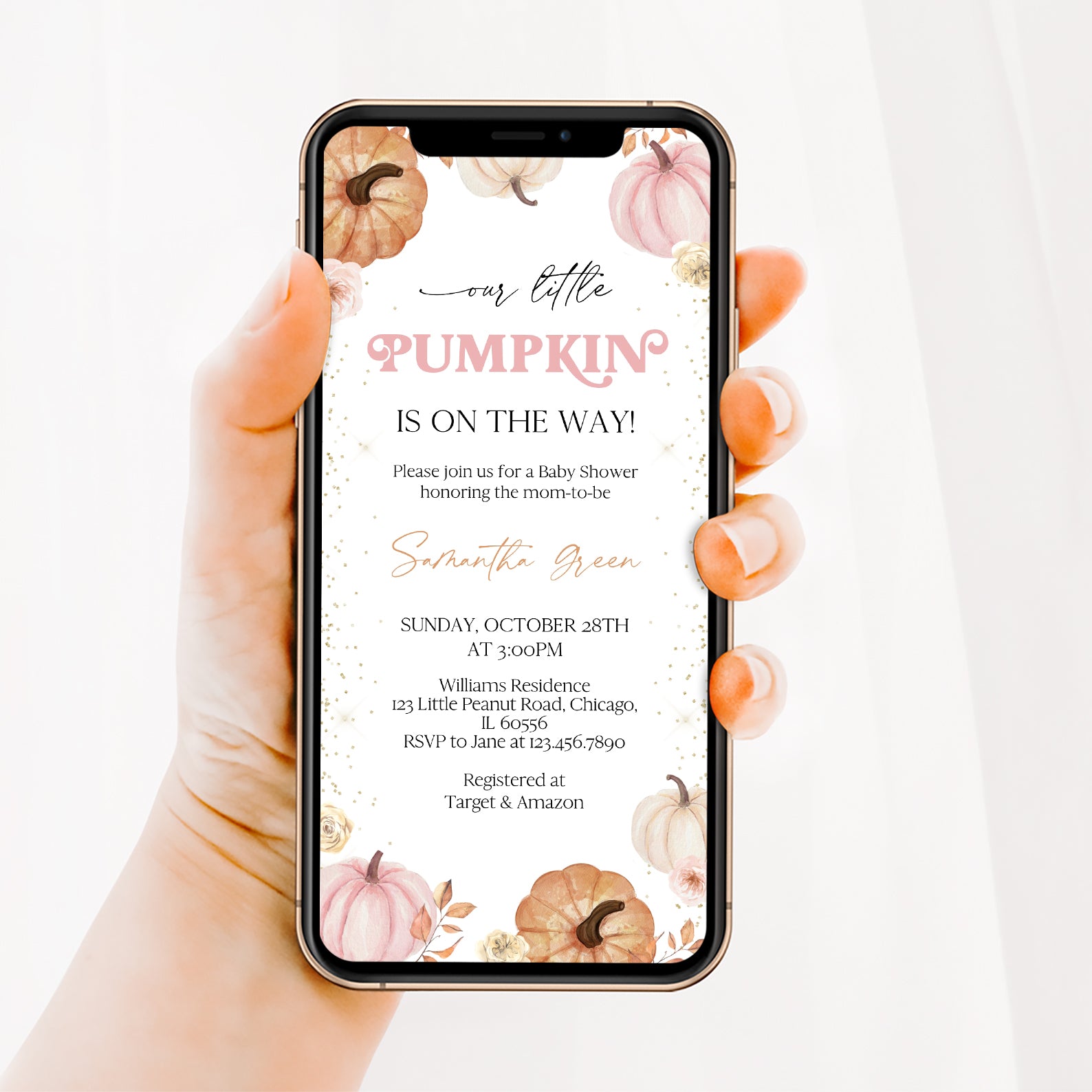 Celebrate the upcoming arrival of your little one with our charming fall baby shower digital invitation. Adorned with delightful watercolor pumpkins in soft pink and vibrant orange, this invitation features elegant roses and autumn leaves, all beautifully accented with shimmering gold on both sides. Perfect for a cozy autumn gathering, it sets the tone for a memorable celebration filled with love and warmth.