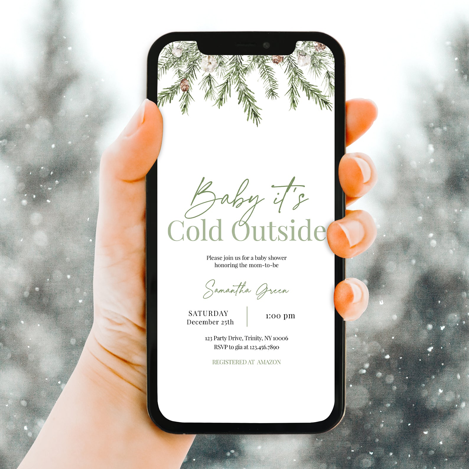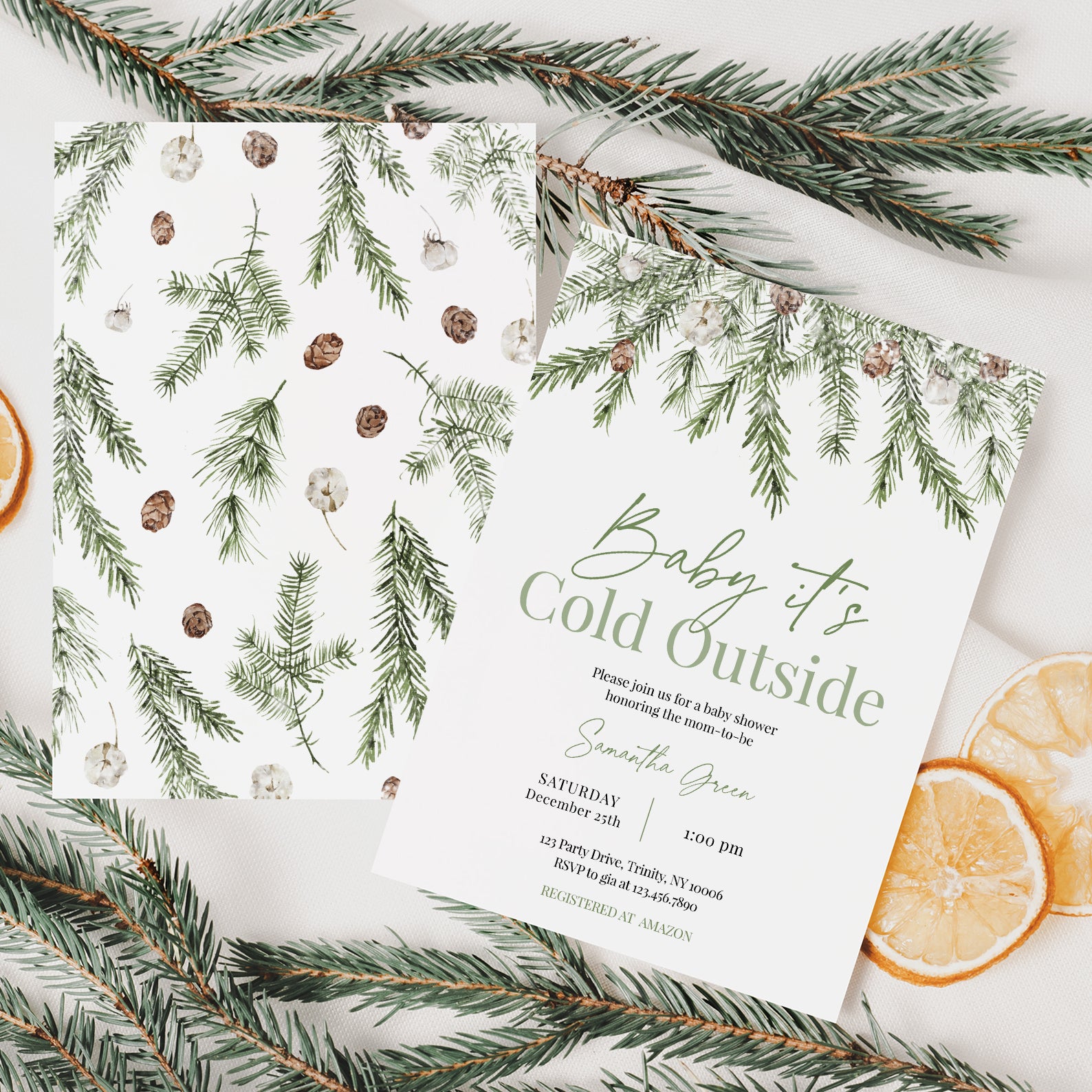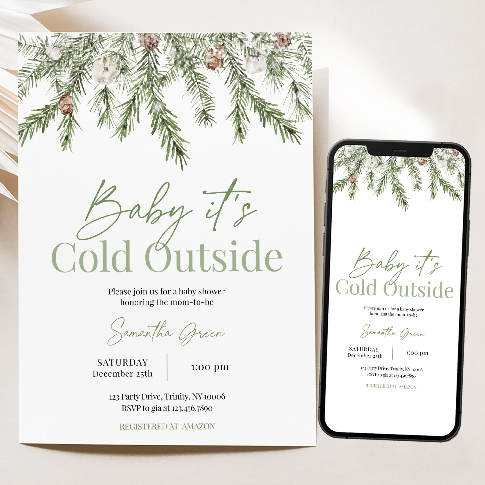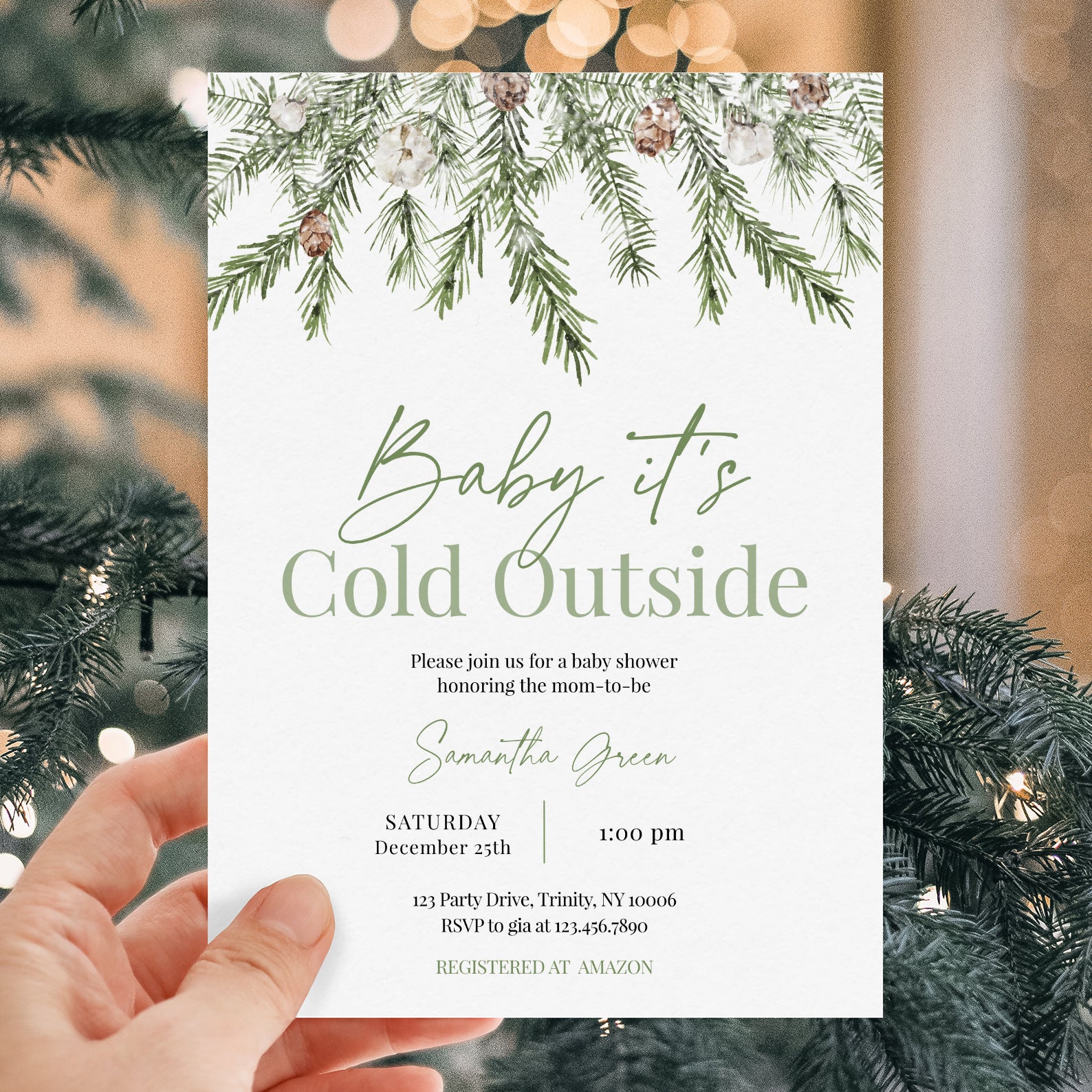 - Purchase this Minimalist Winter Baby Shower Invite: Green Christmas Theme template