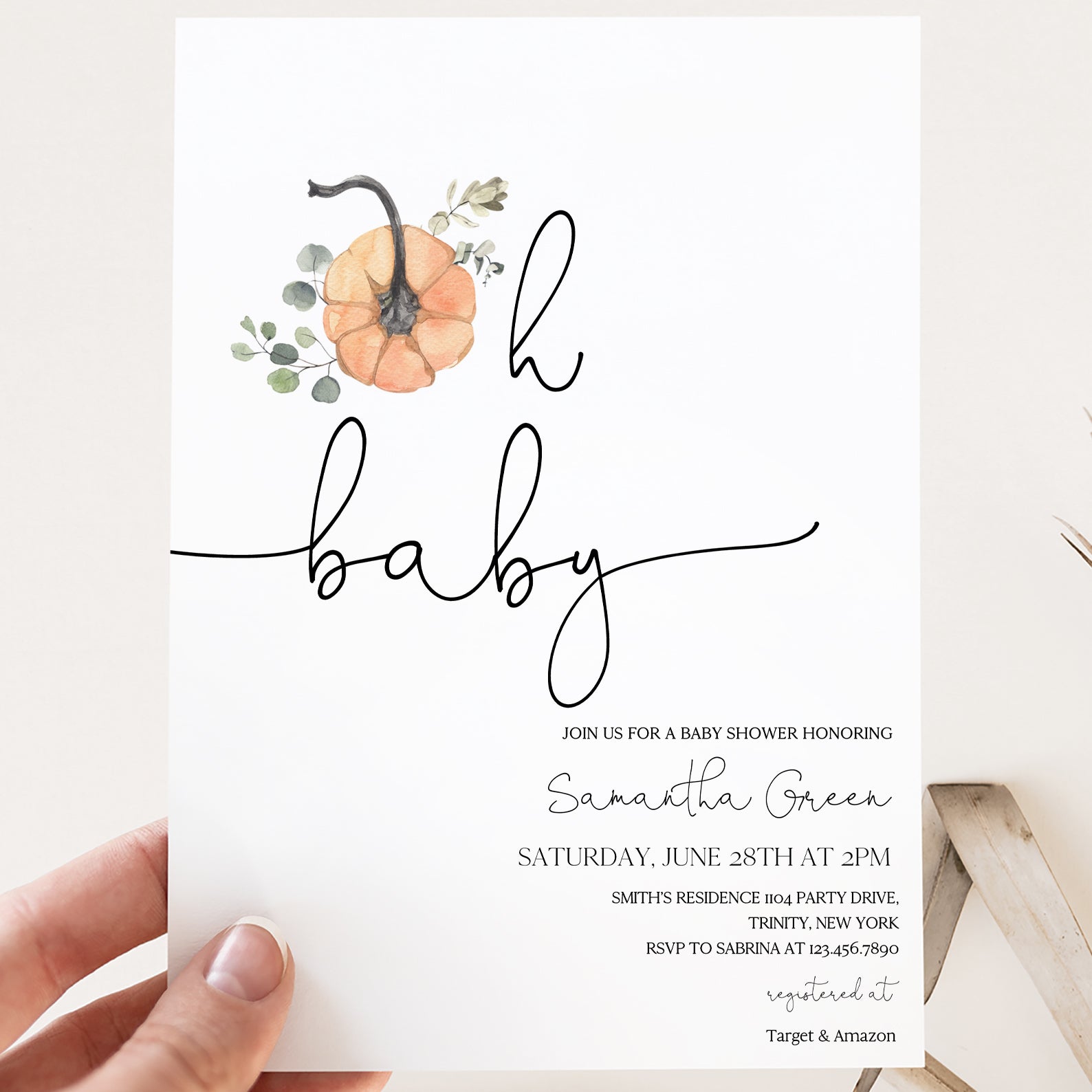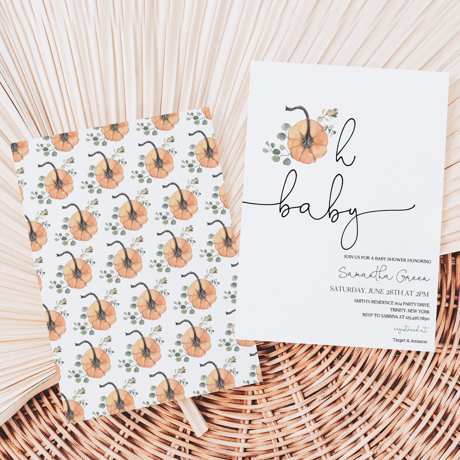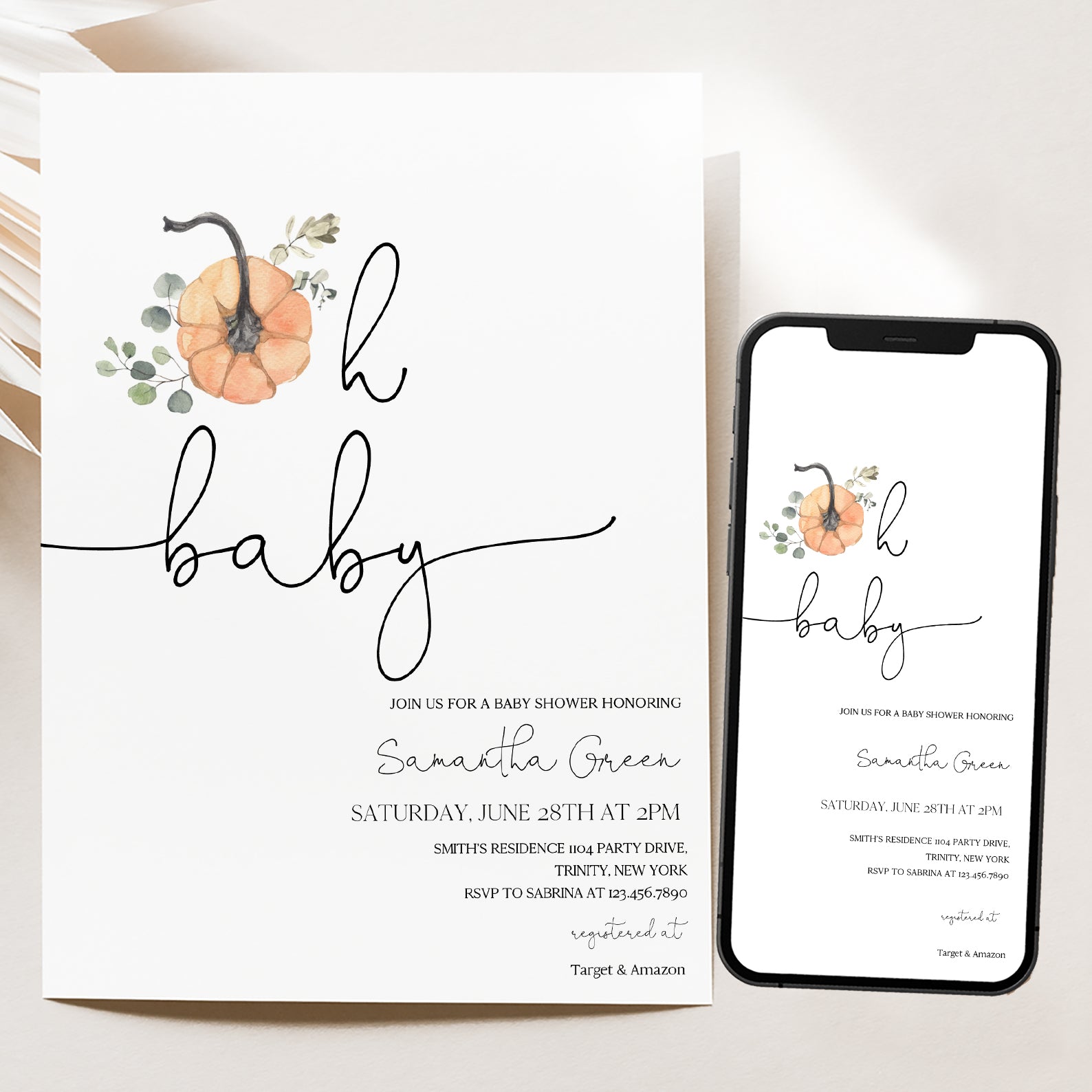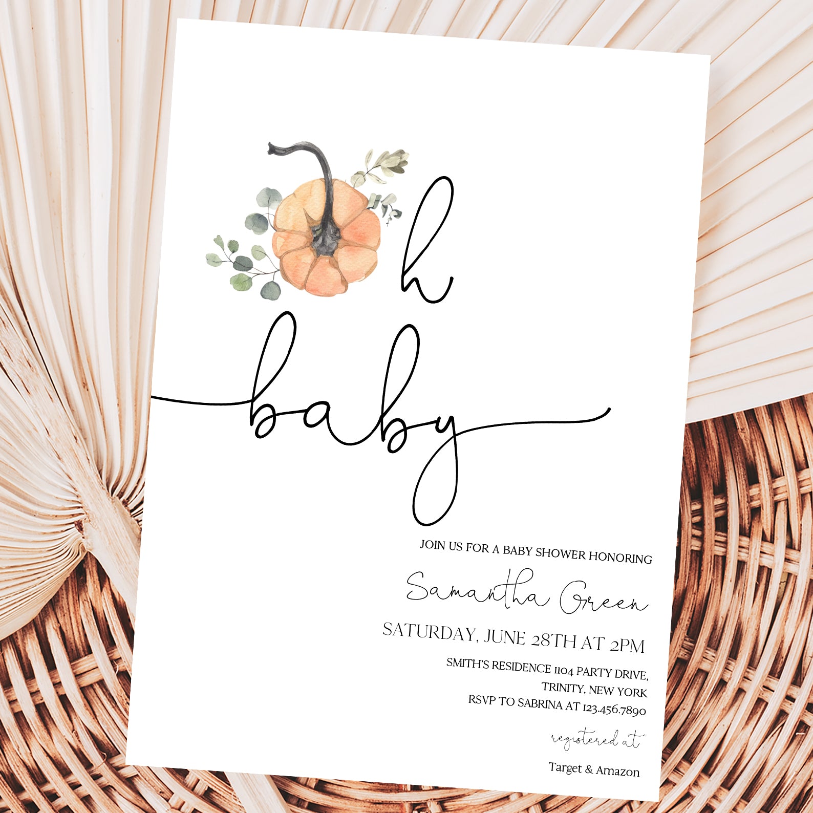 - Purchase this ‘Oh Baby’ Minimalist Fall Baby Shower Invite with Pumpkin template