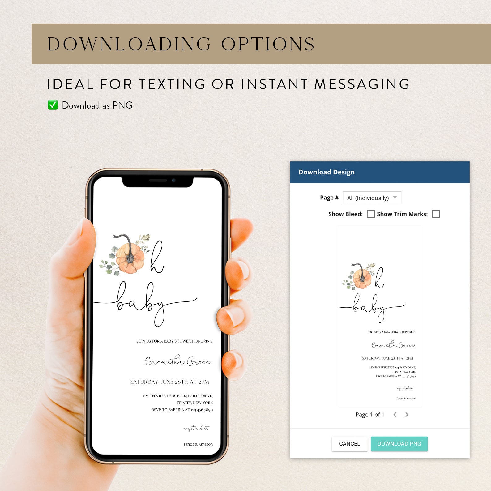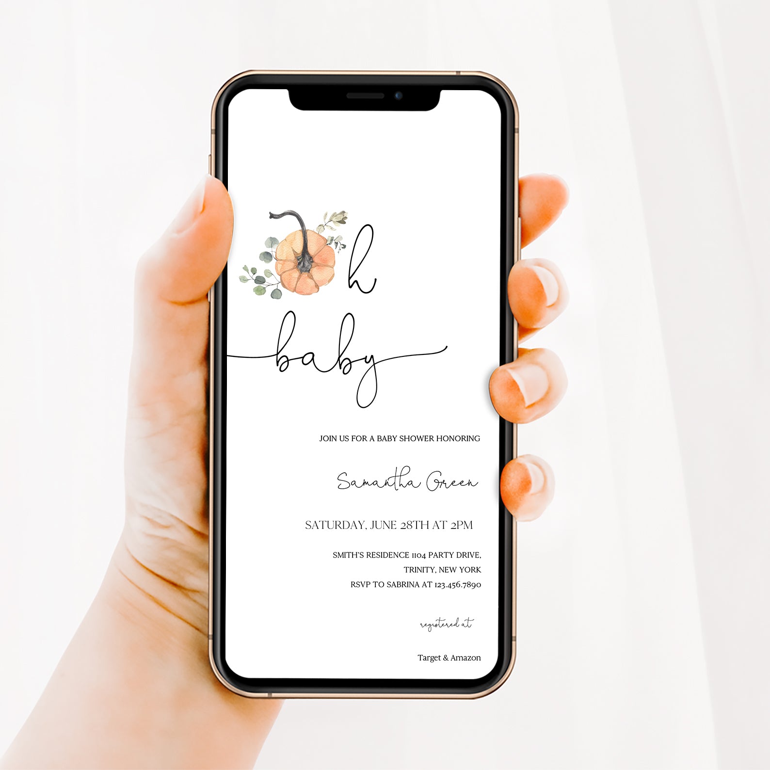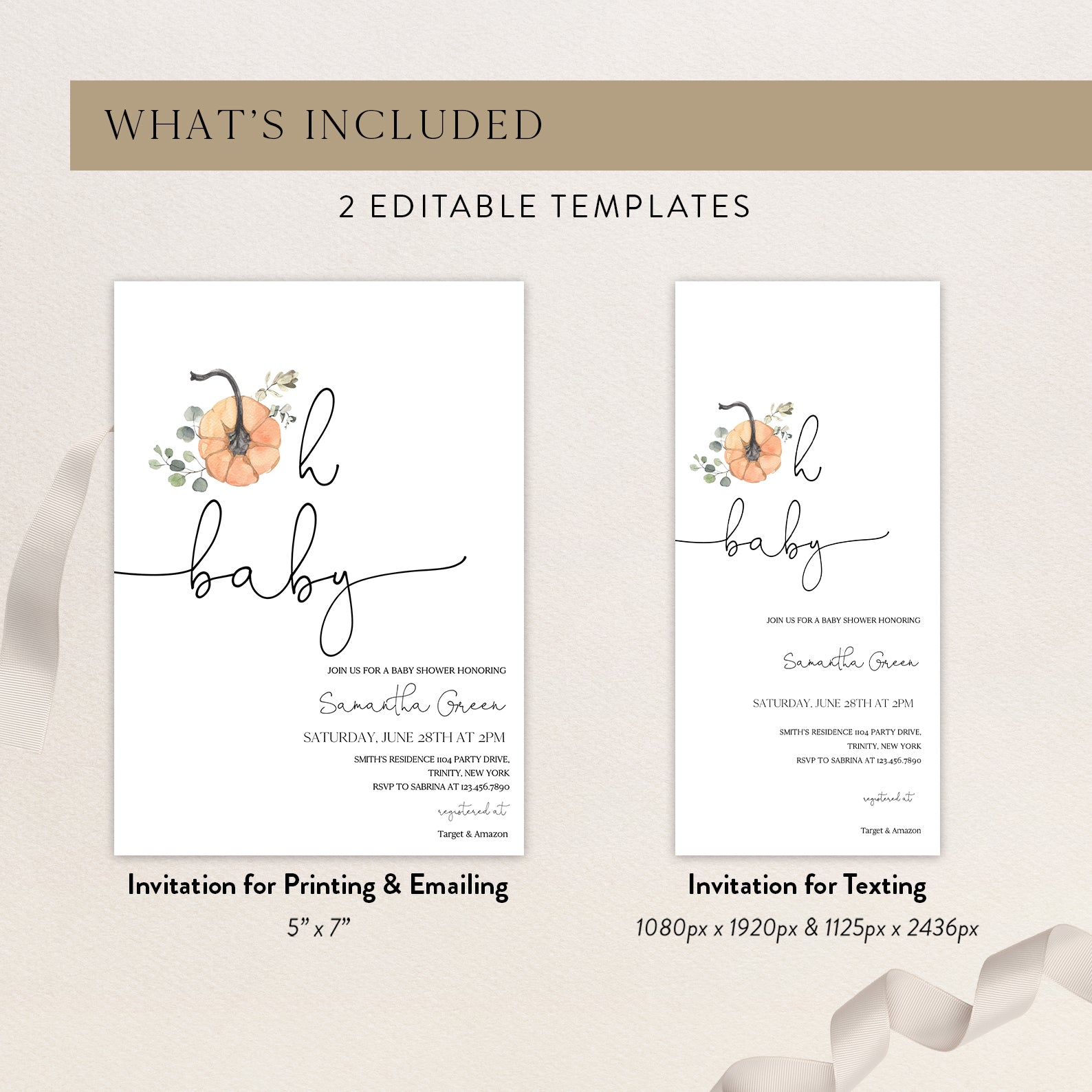 - Purchase this ‘Oh Baby’ Minimalist Fall Baby Shower Invite with Pumpkin template
