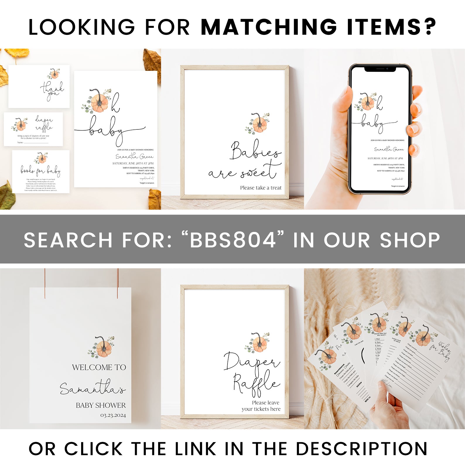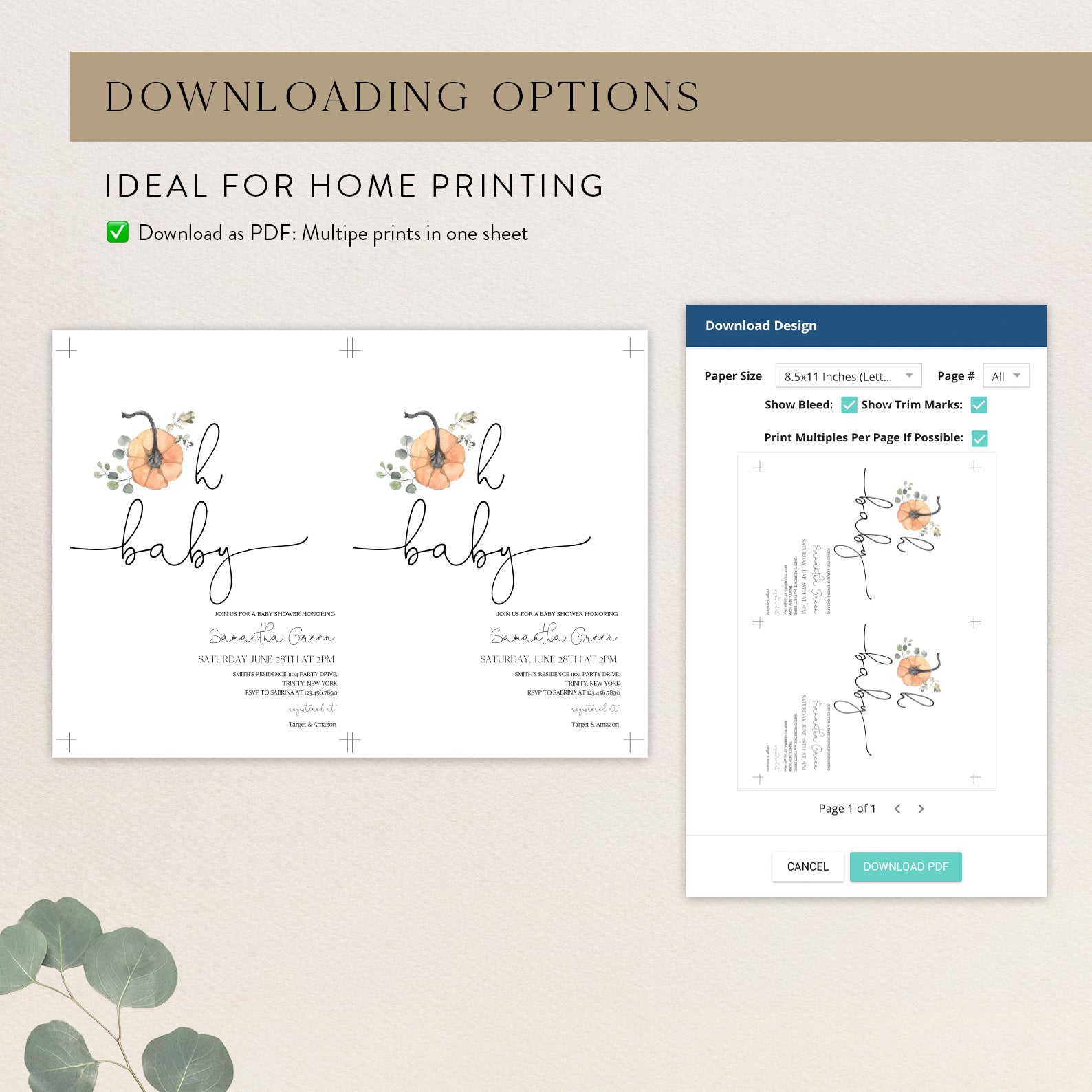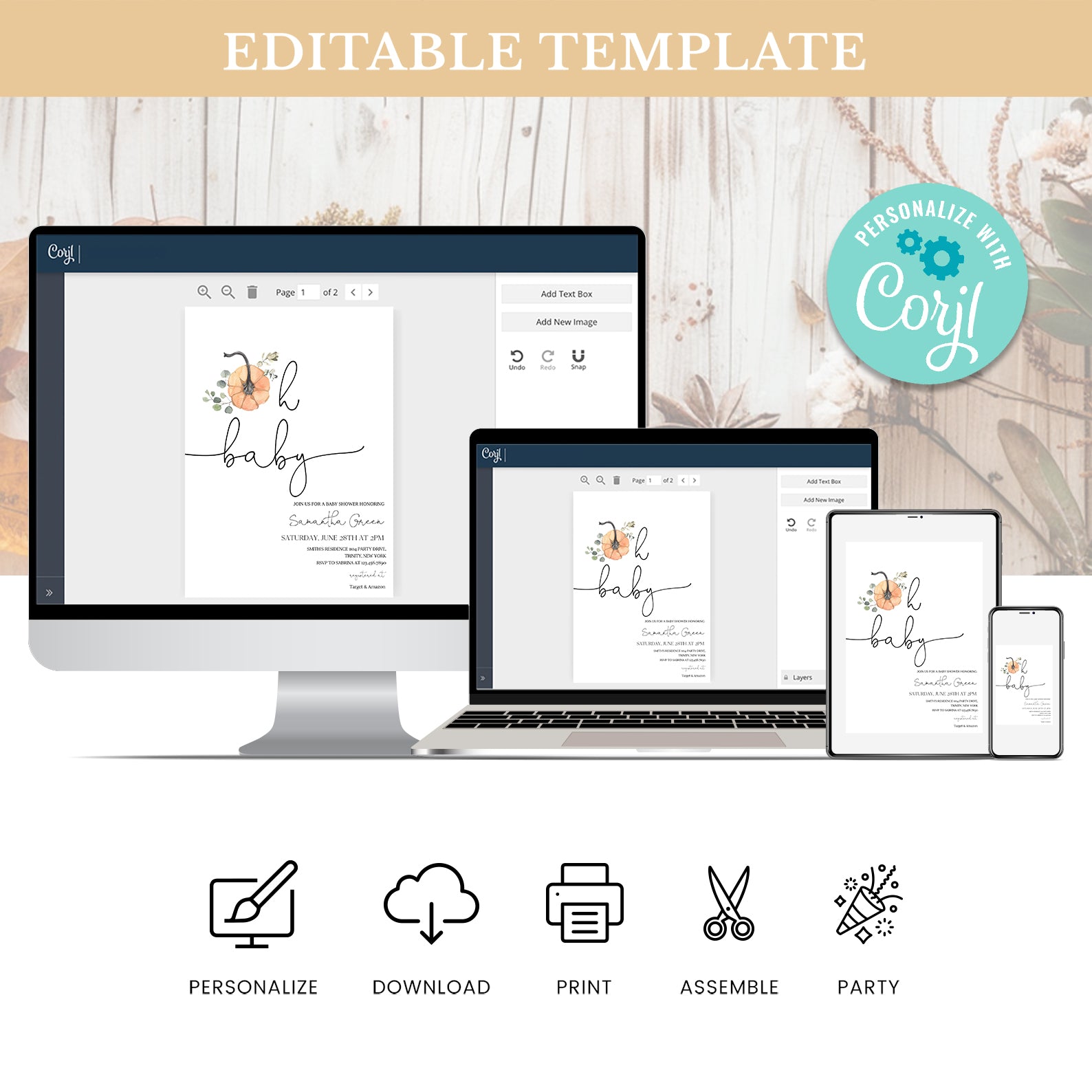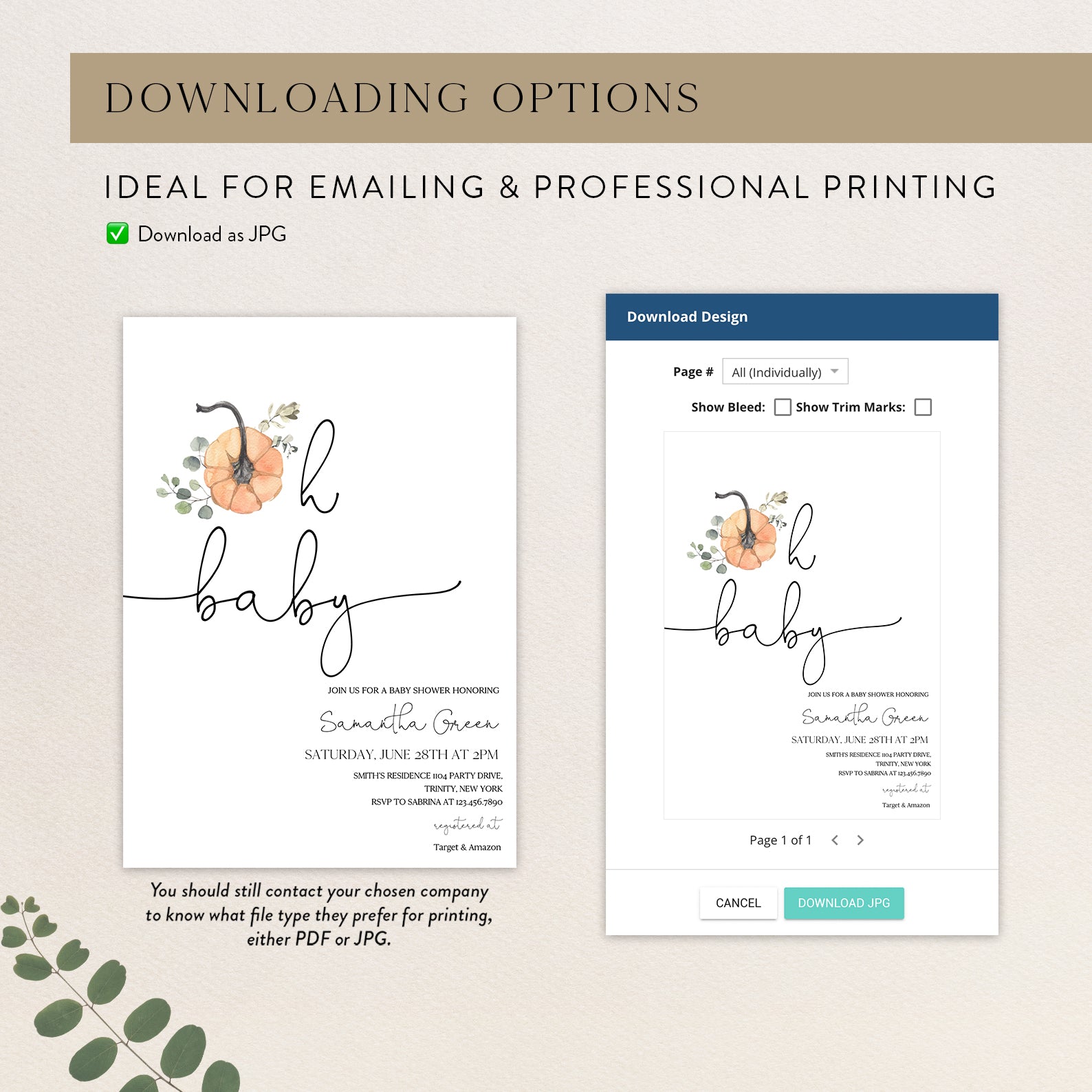 - Purchase this ‘Oh Baby’ Minimalist Fall Baby Shower Invite with Pumpkin template