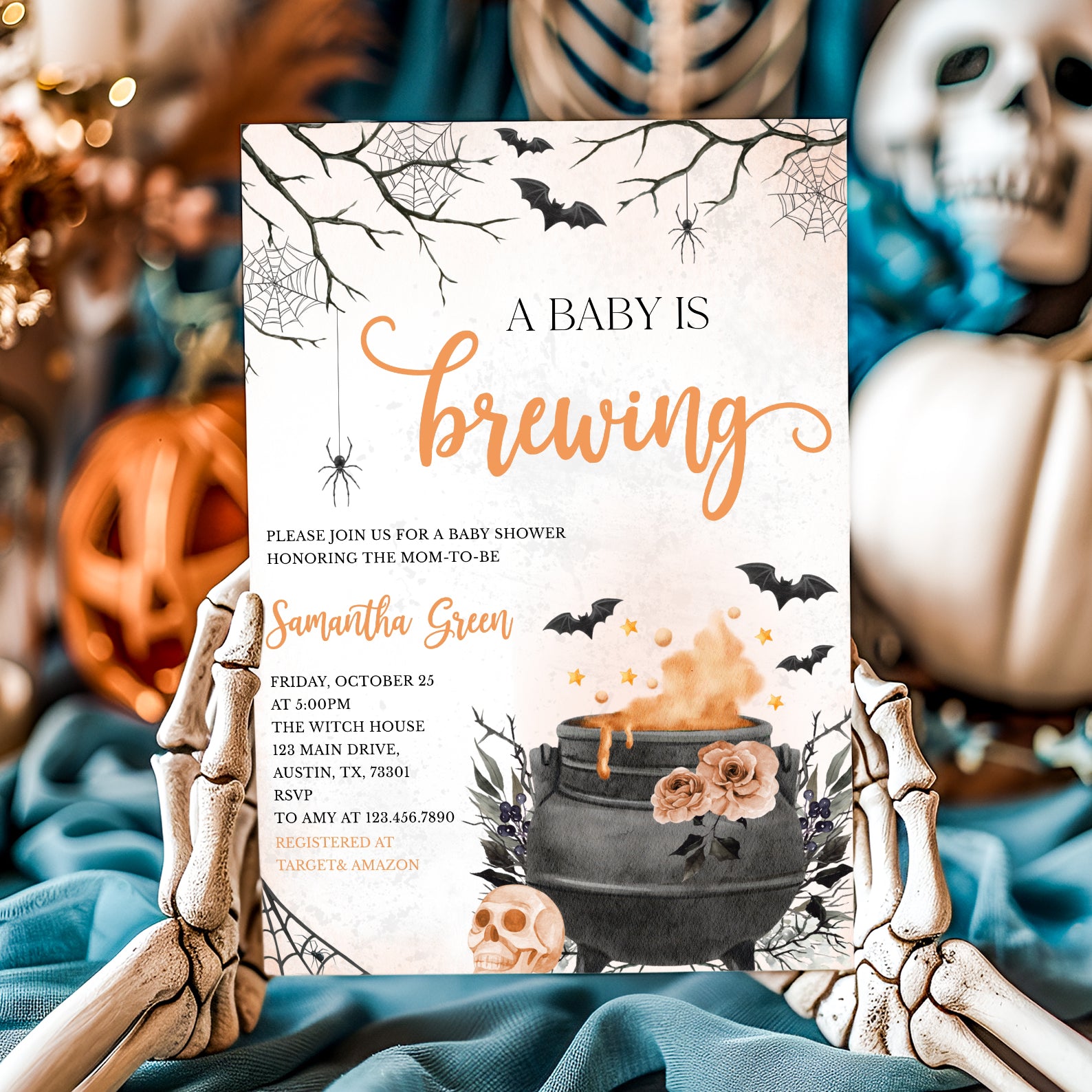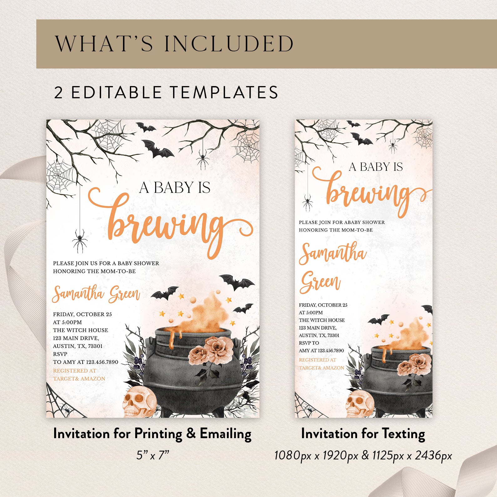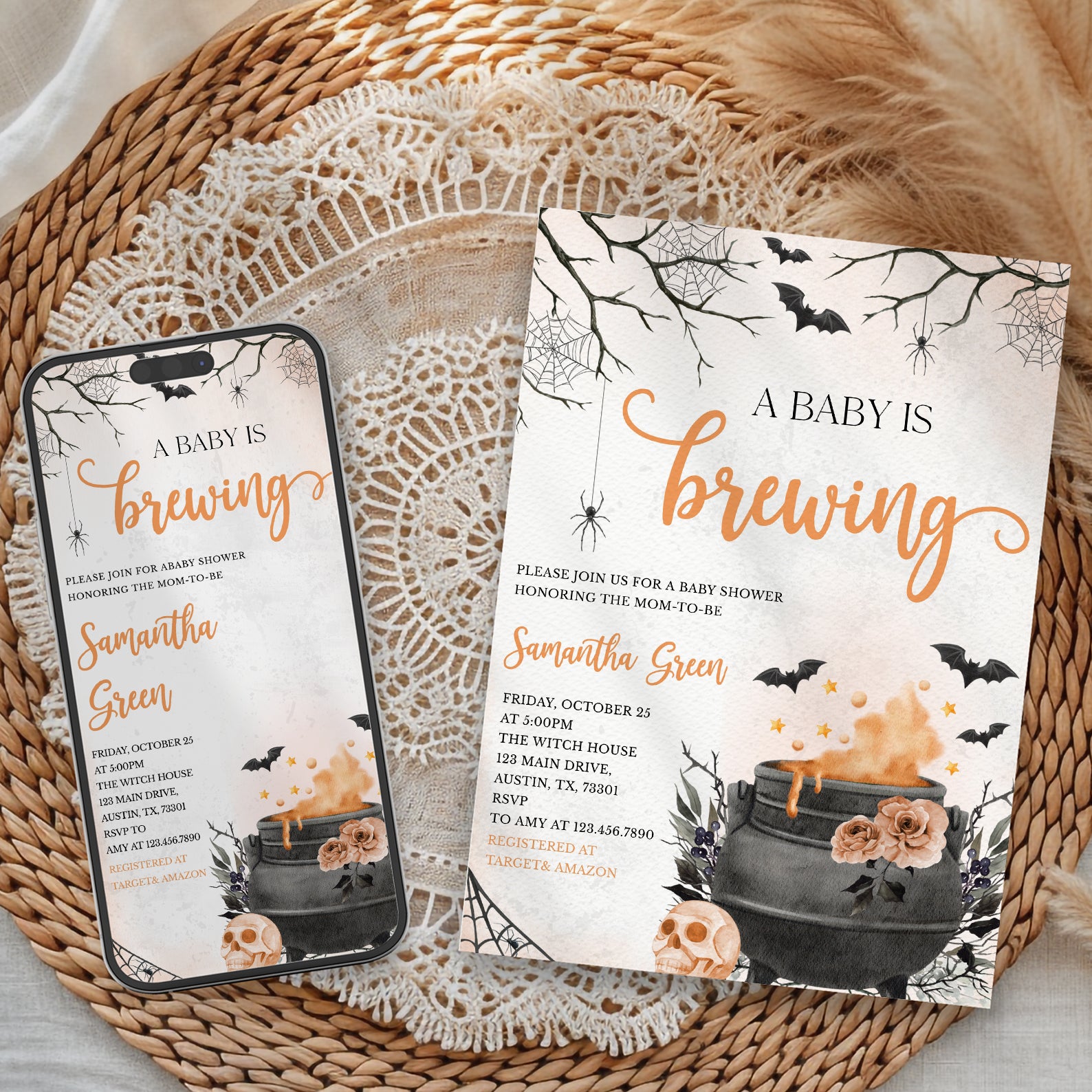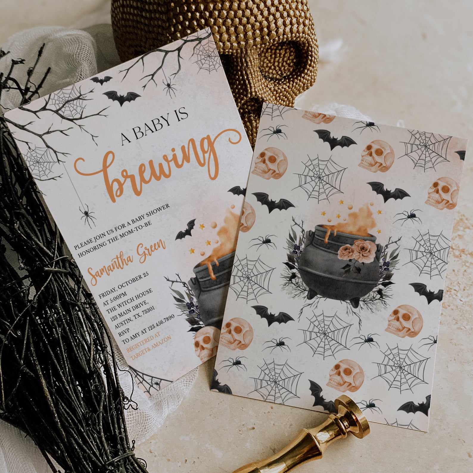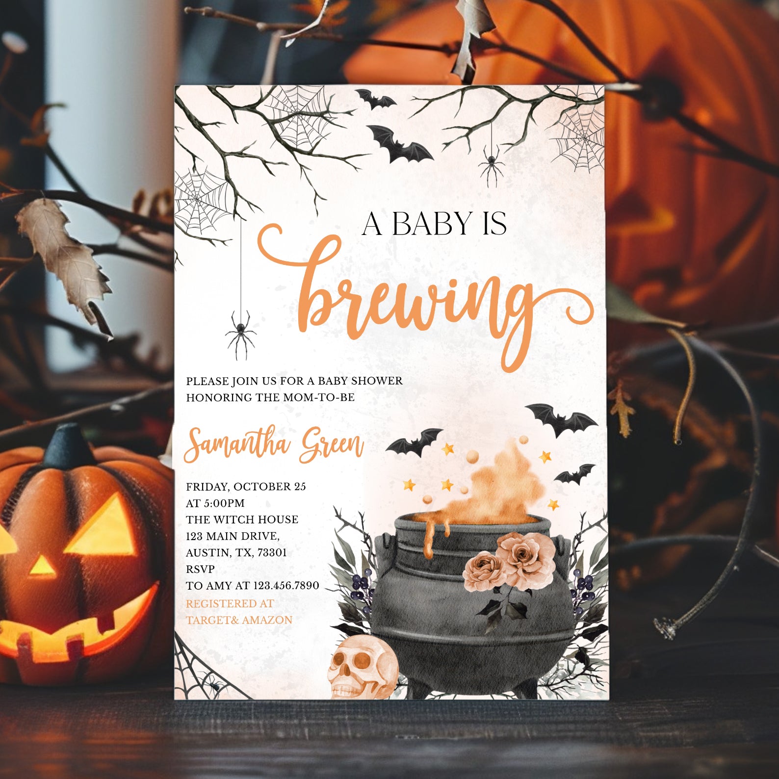 - Purchase this Orange Digital Invite: 'A Baby is Brewing' with Spooky Cauldron Fun template
