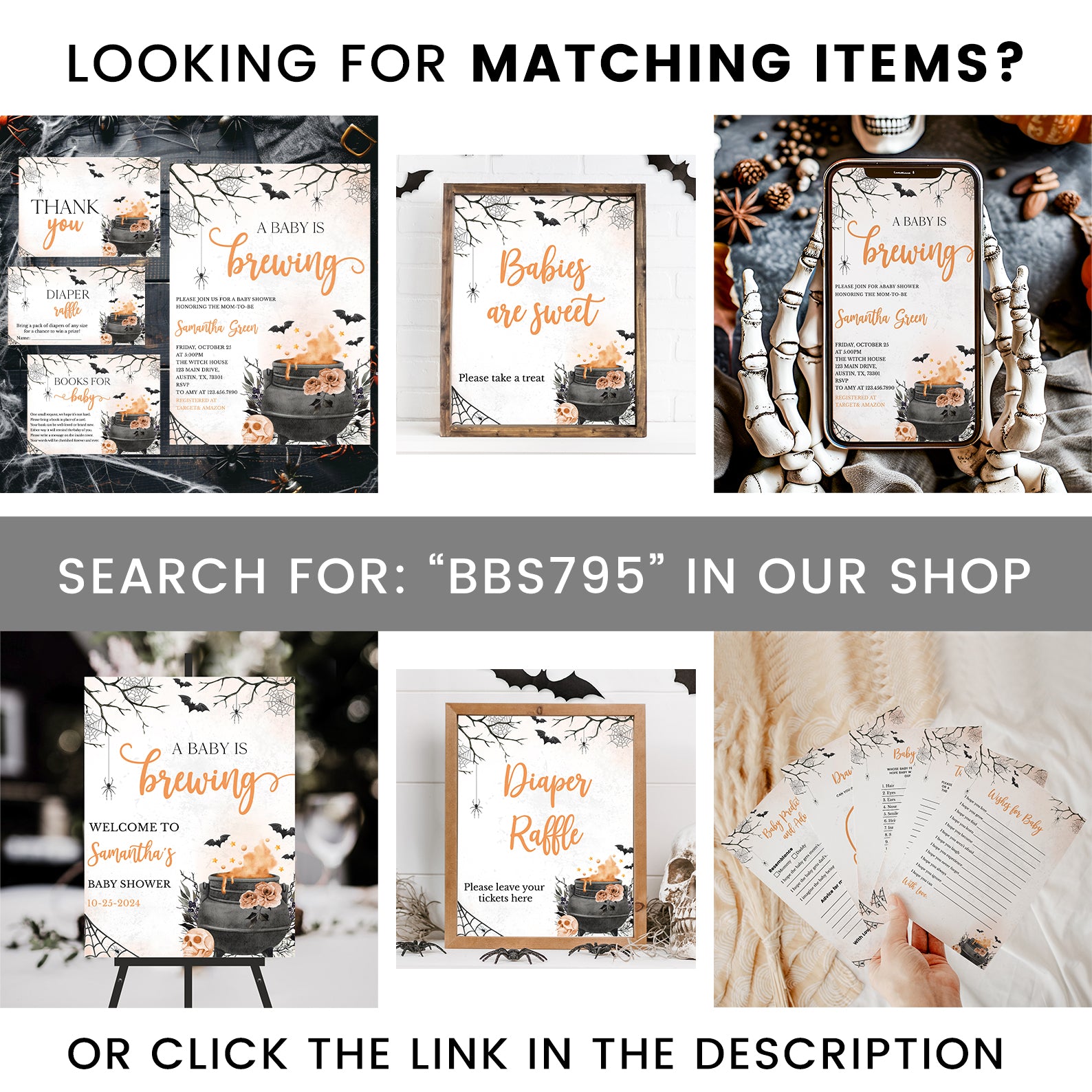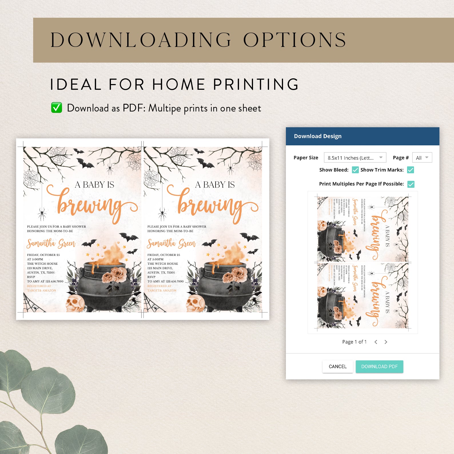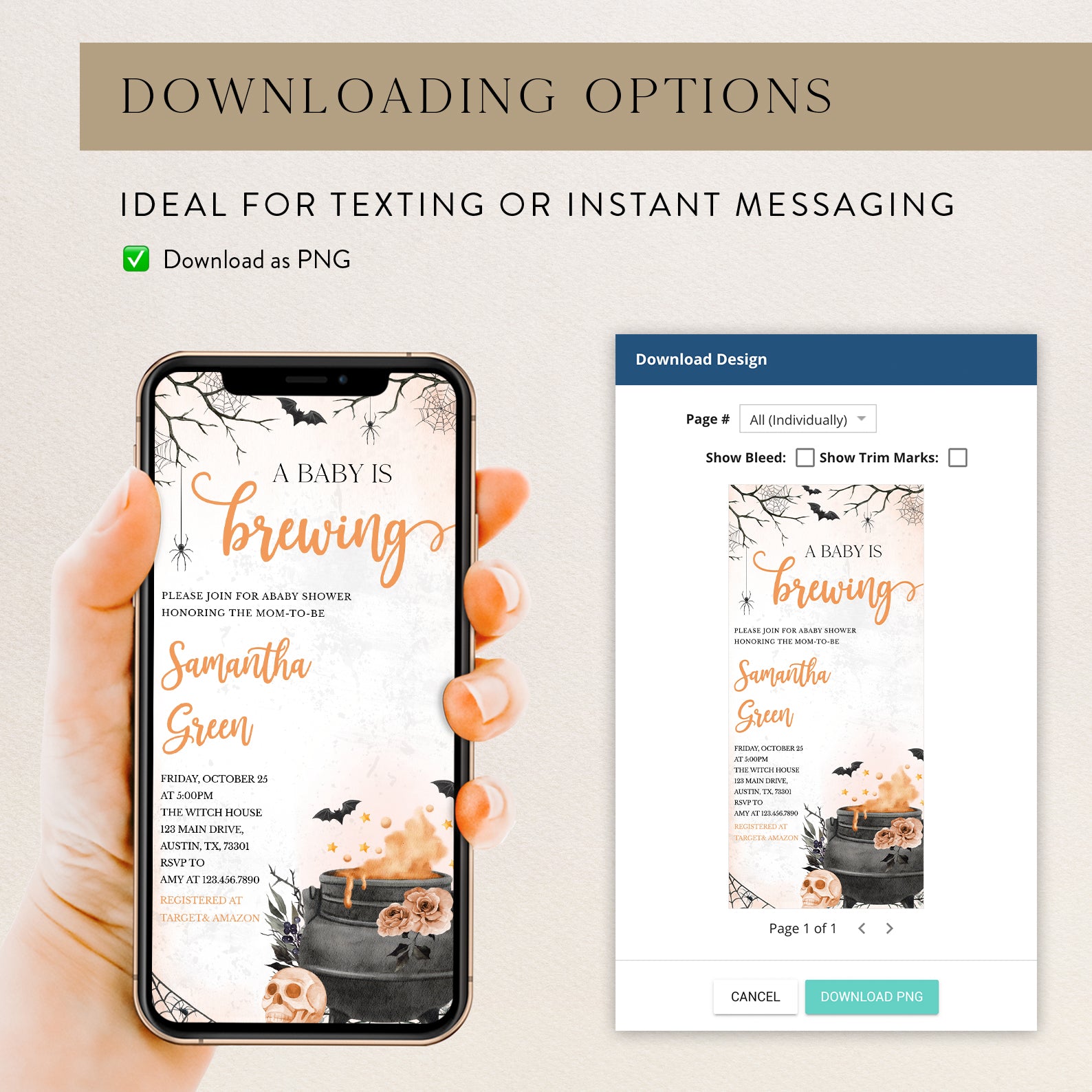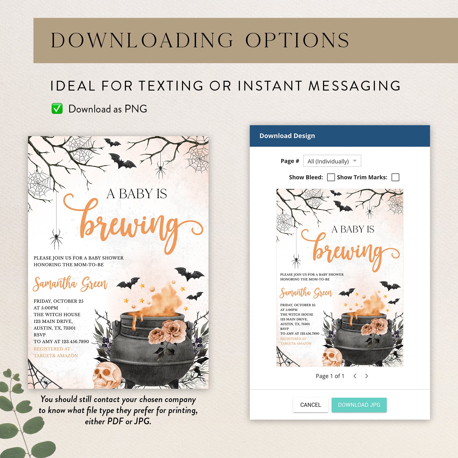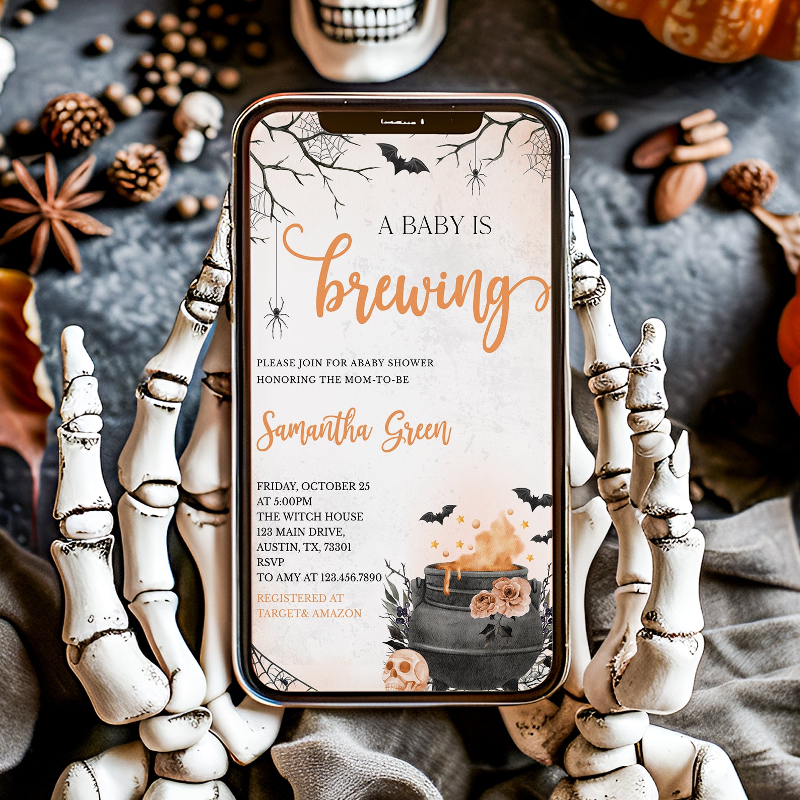 - Purchase this Orange Digital Invite: 'A Baby is Brewing' with Spooky Cauldron Fun template