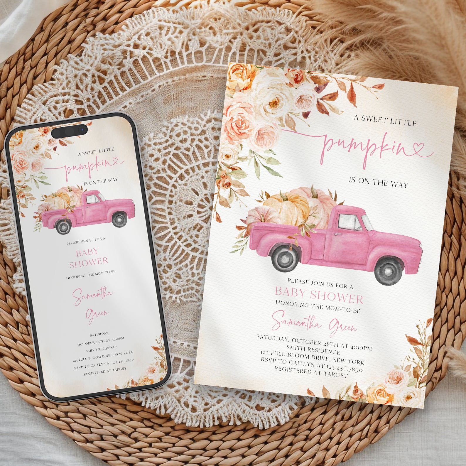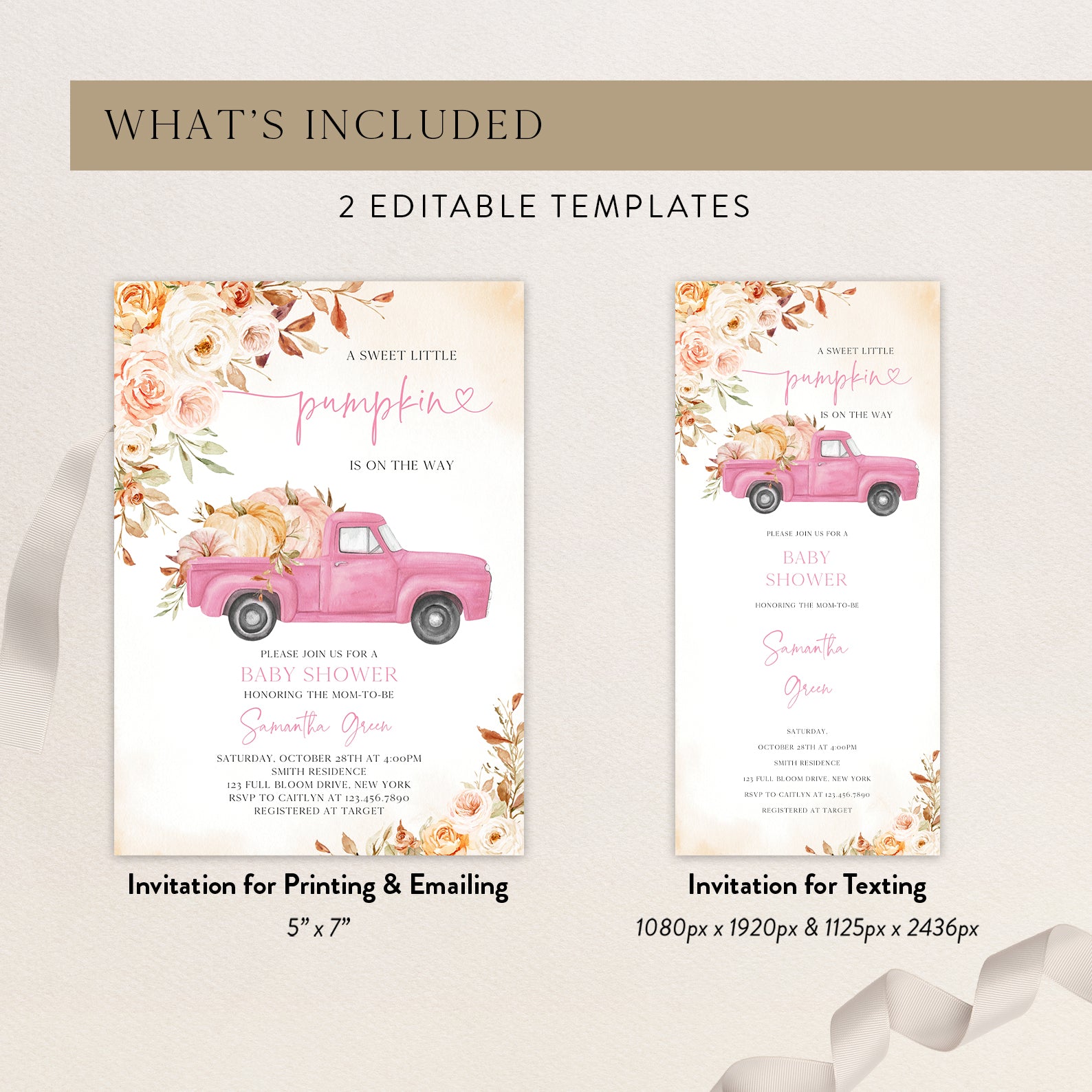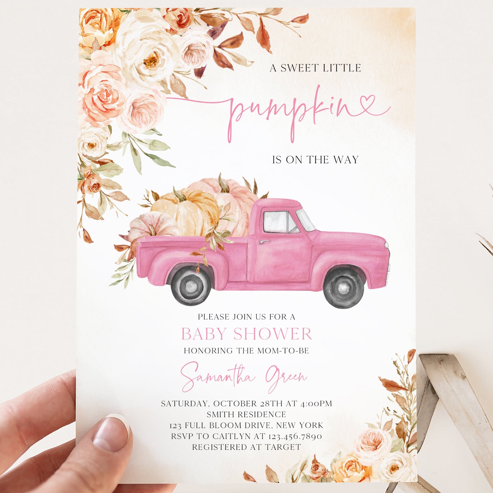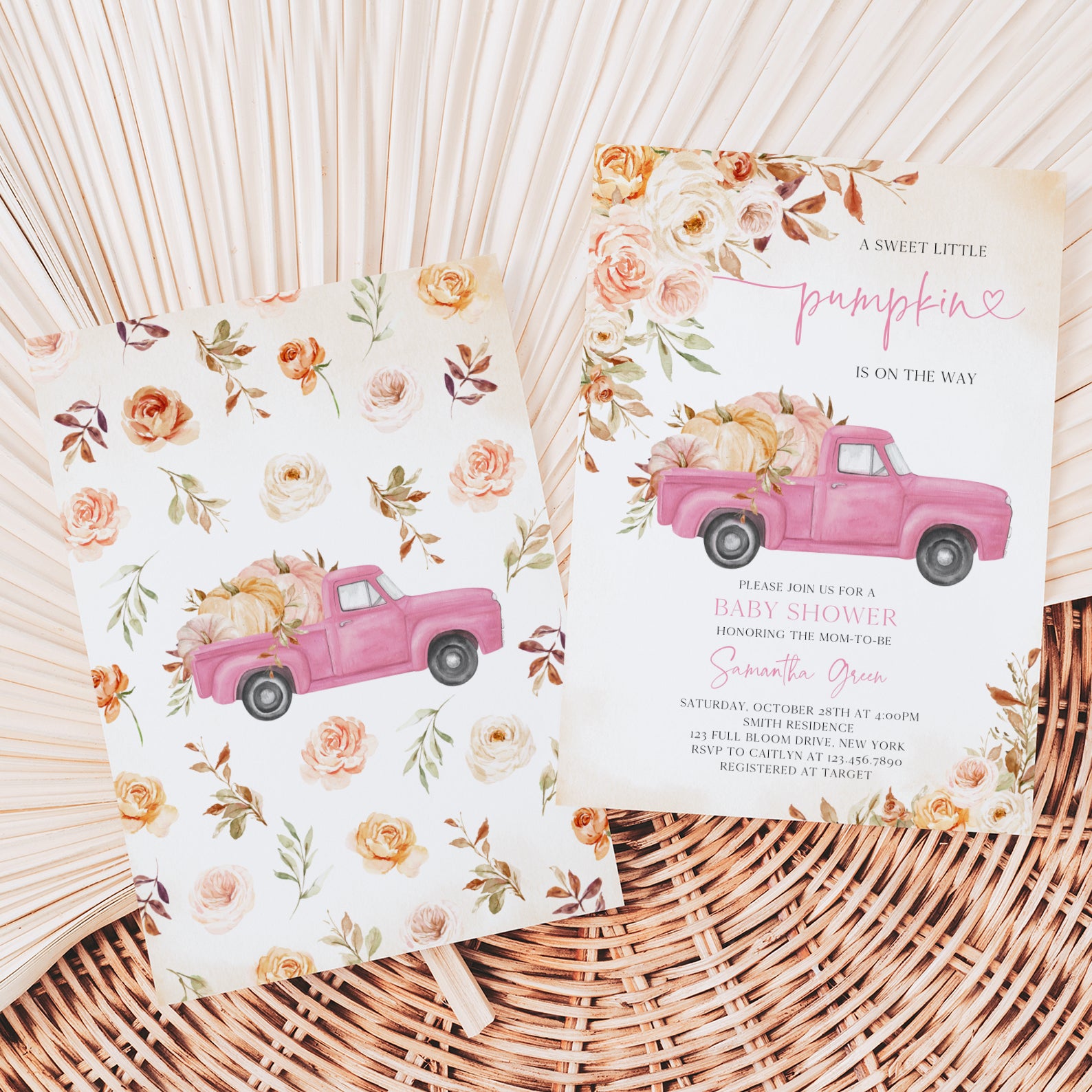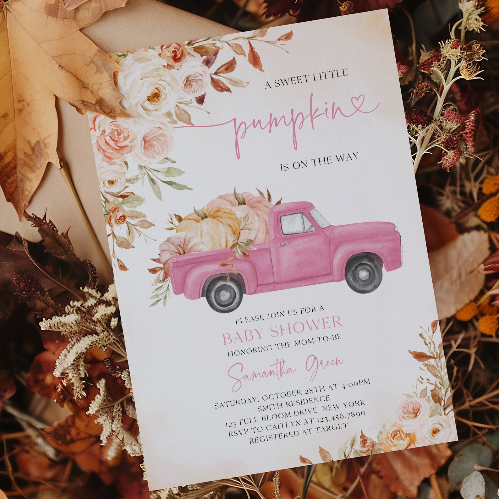 - Purchase this Pickup Truck & Pumpkins with Roses Pink Fall Baby Shower Invite template