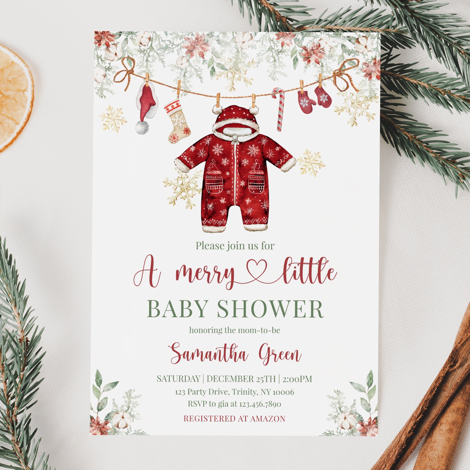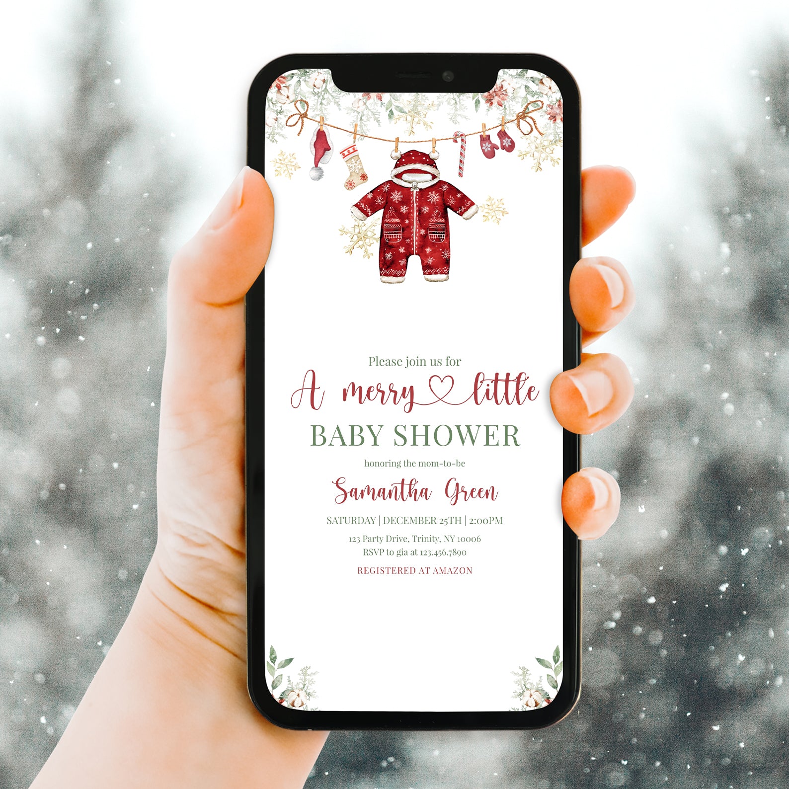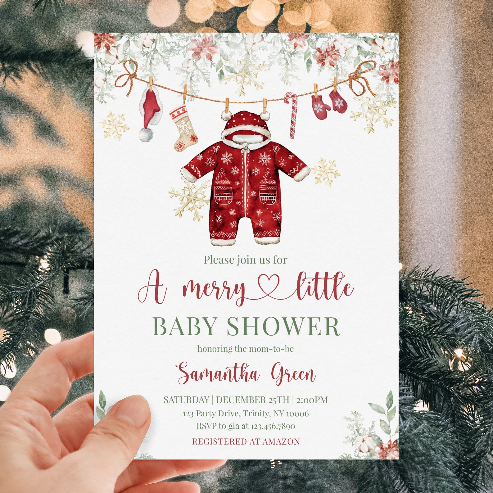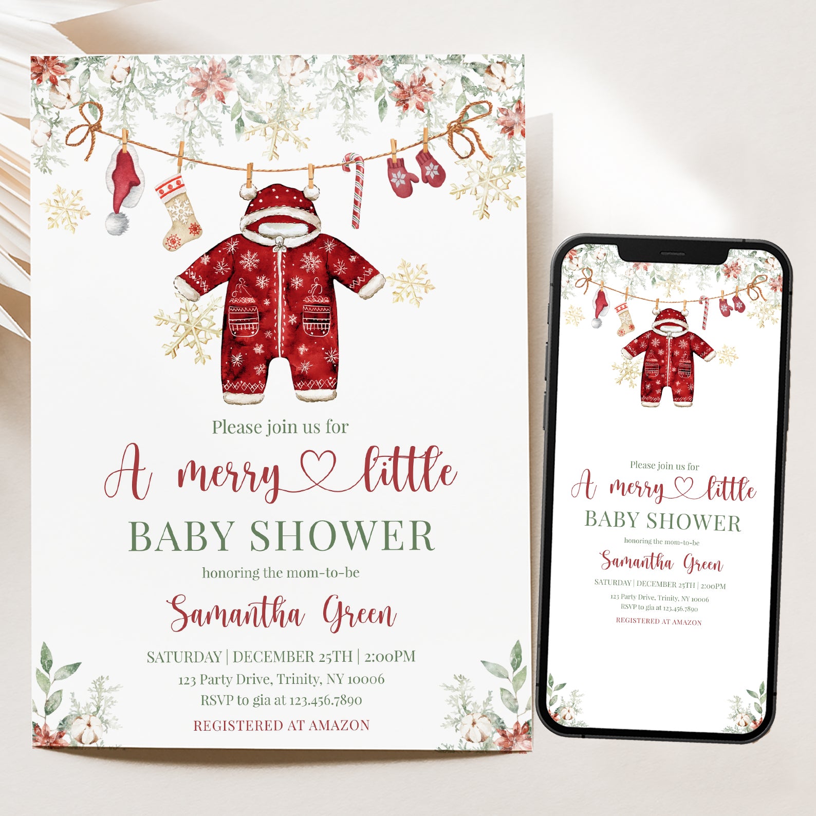Celebrate the joy of new beginnings with our enchanting Winter Baby Shower Digital Invitation! This charming red-themed design features festive green Christmas tree leaves and vibrant poinsettias at the top, setting the perfect tone for your celebration. Adorned with a playful hanging red Christmas onesie, a cozy Santa hat, cheerful Christmas socks, a delightful candy cane, and warm gloves, all surrounded by shimmering gold snowflakes, this invitation captures the magic of the season. Make your baby shower unforgettable and spread the holiday cheer with this beautifully crafted digital invite that will leave your guests excited to join in the festivities!