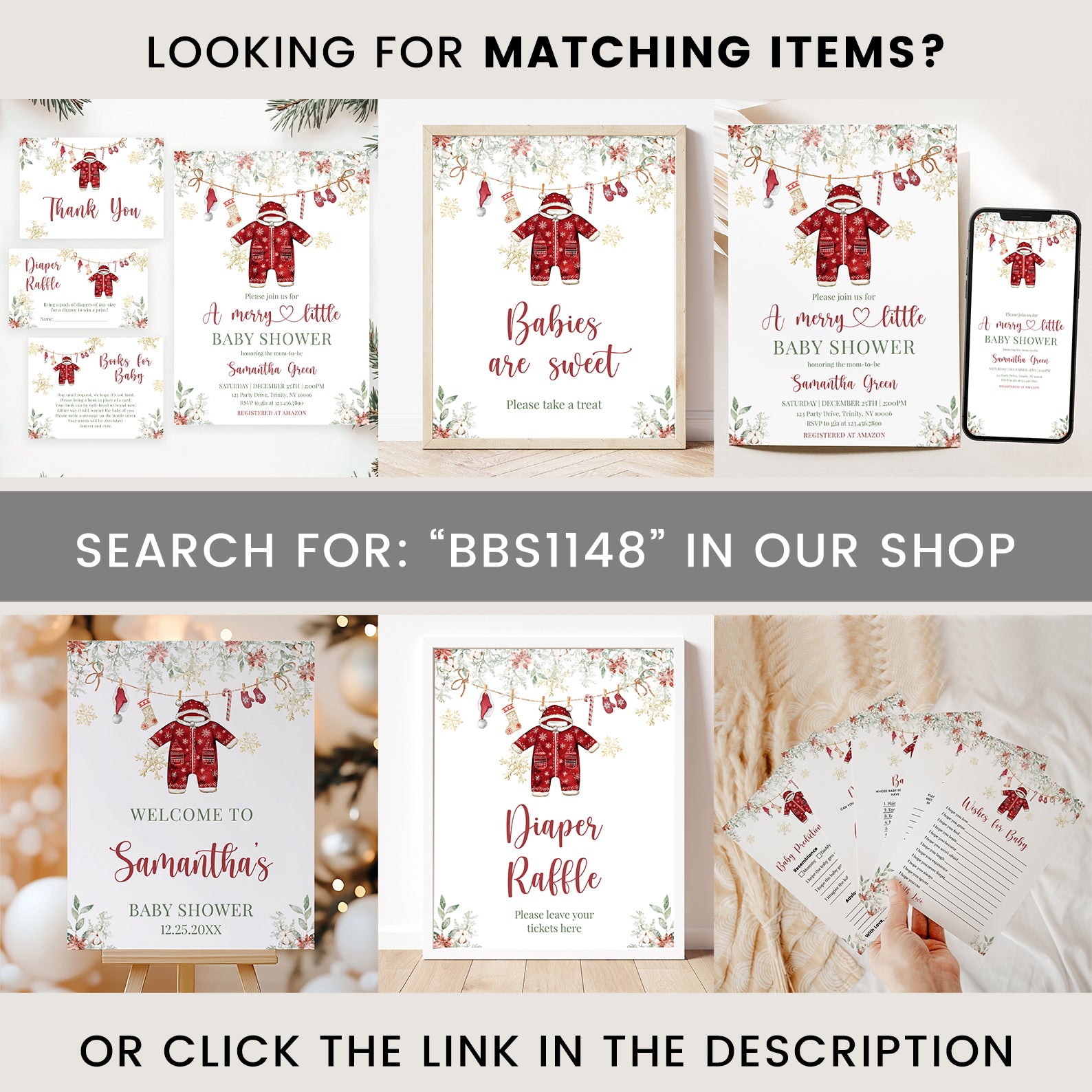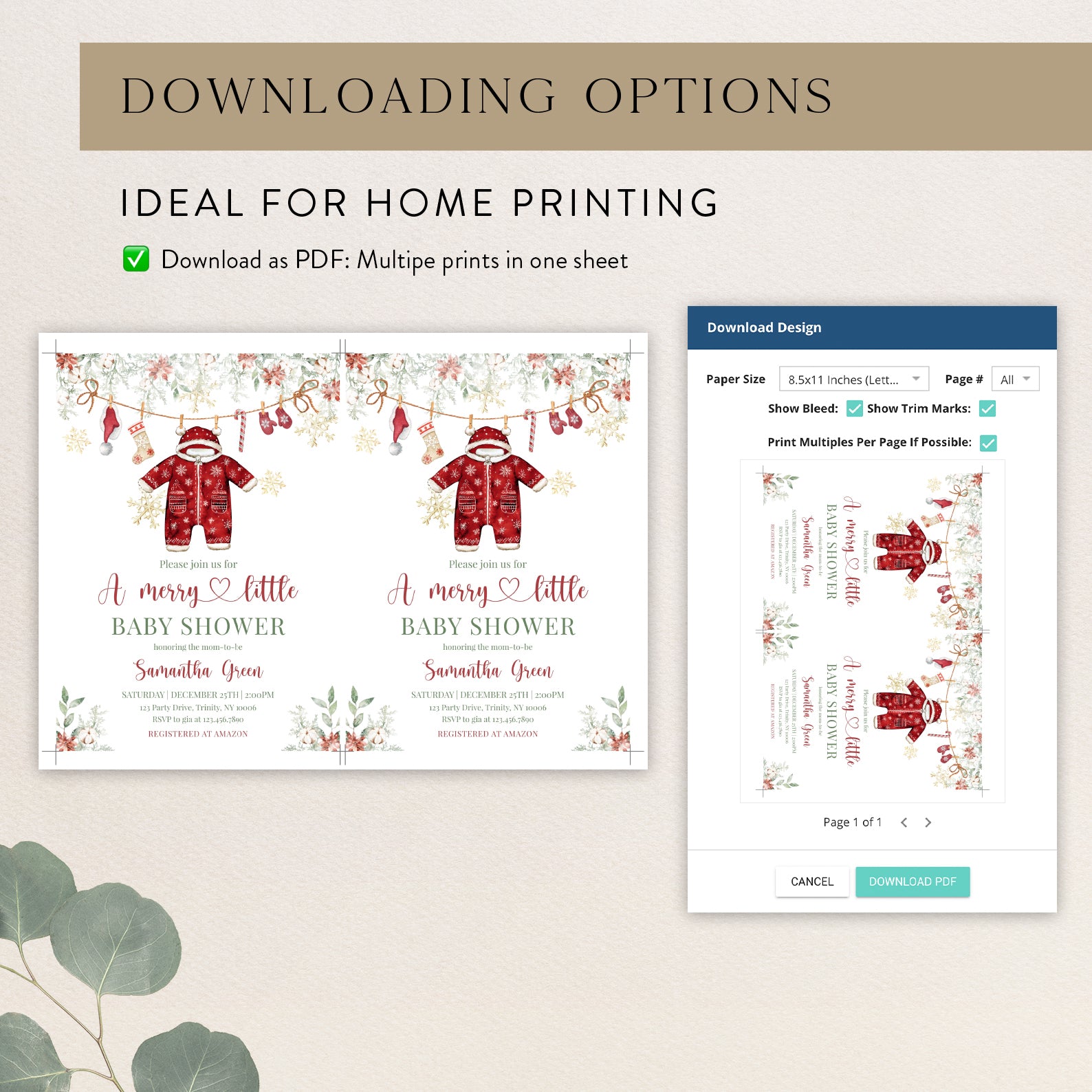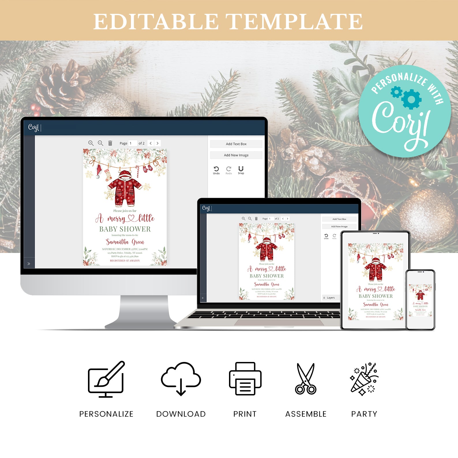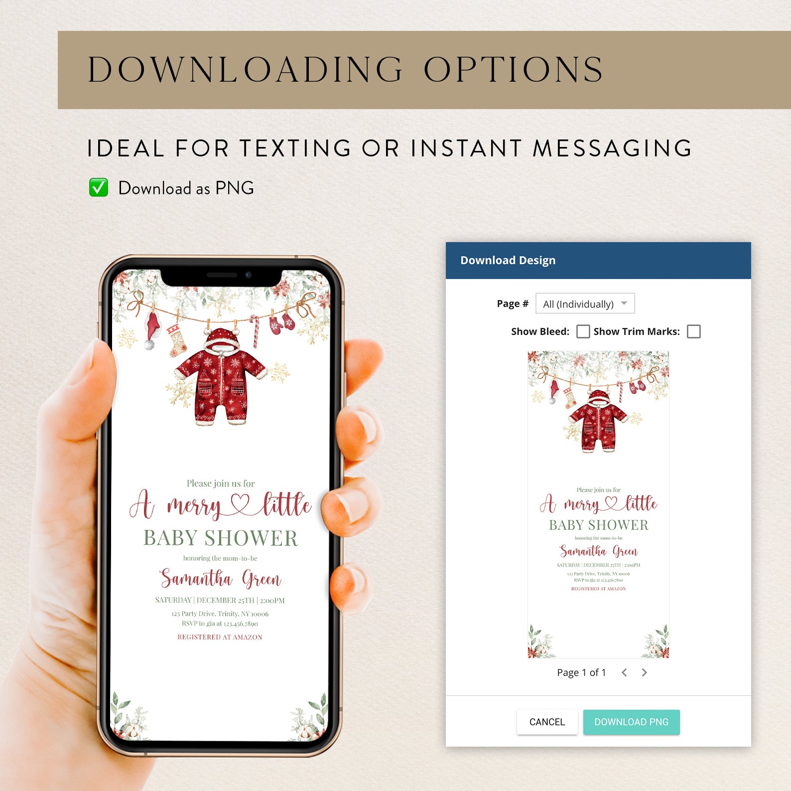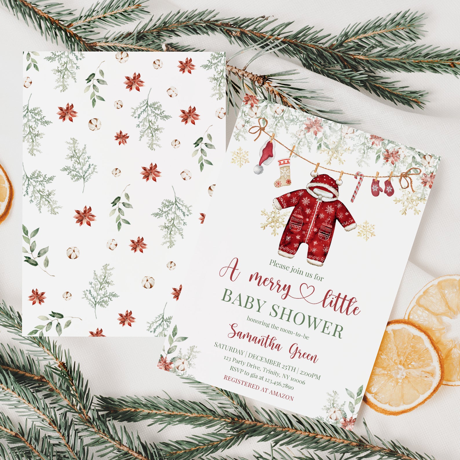 Celebrate the joy of new beginnings with our enchanting Winter Baby Shower Digital Invitation! This charming red-themed design features festive green Christmas tree leaves and vibrant poinsettias at the top, setting the perfect tone for your celebration. Adorned with a playful hanging red Christmas onesie, a cozy Santa hat, cheerful Christmas socks, a delightful candy cane, and warm gloves, all surrounded by shimmering gold snowflakes, this invitation captures the magic of the season. Make your baby shower unforgettable and spread the holiday cheer with this beautifully crafted digital invite that will leave your guests excited to join in the festivities!