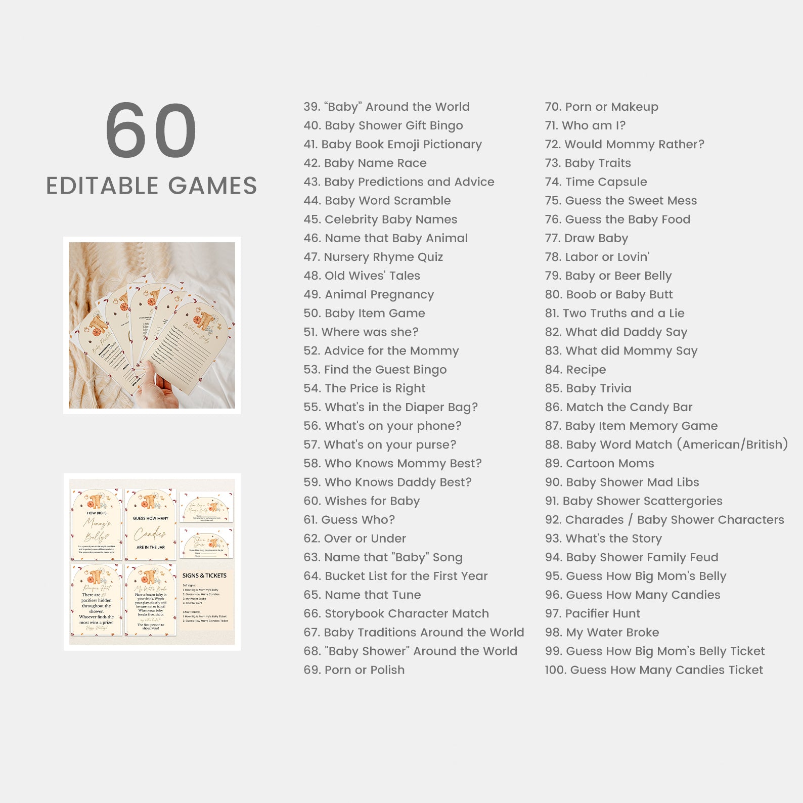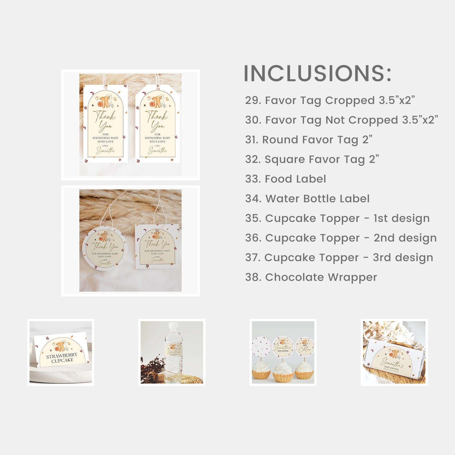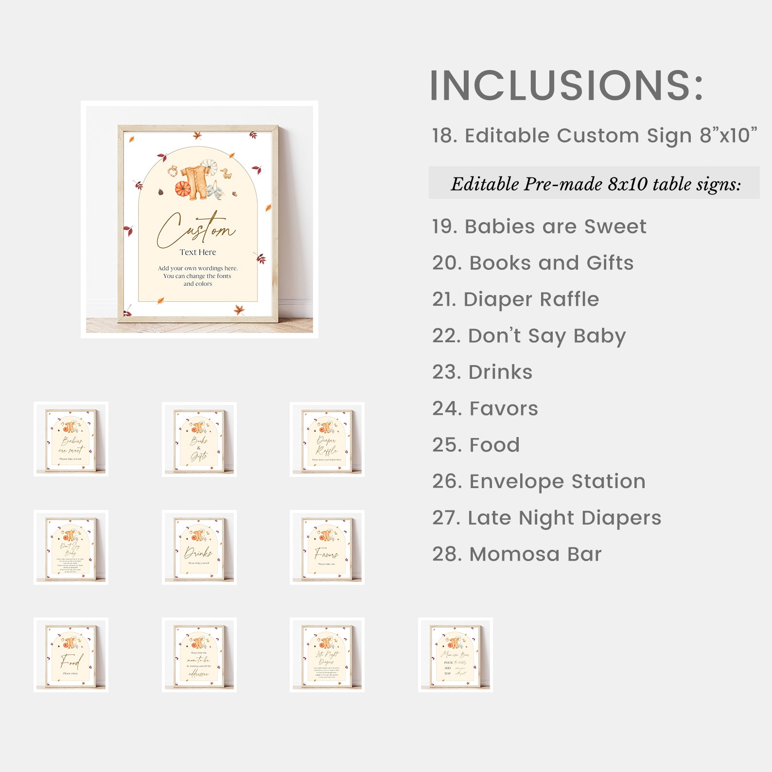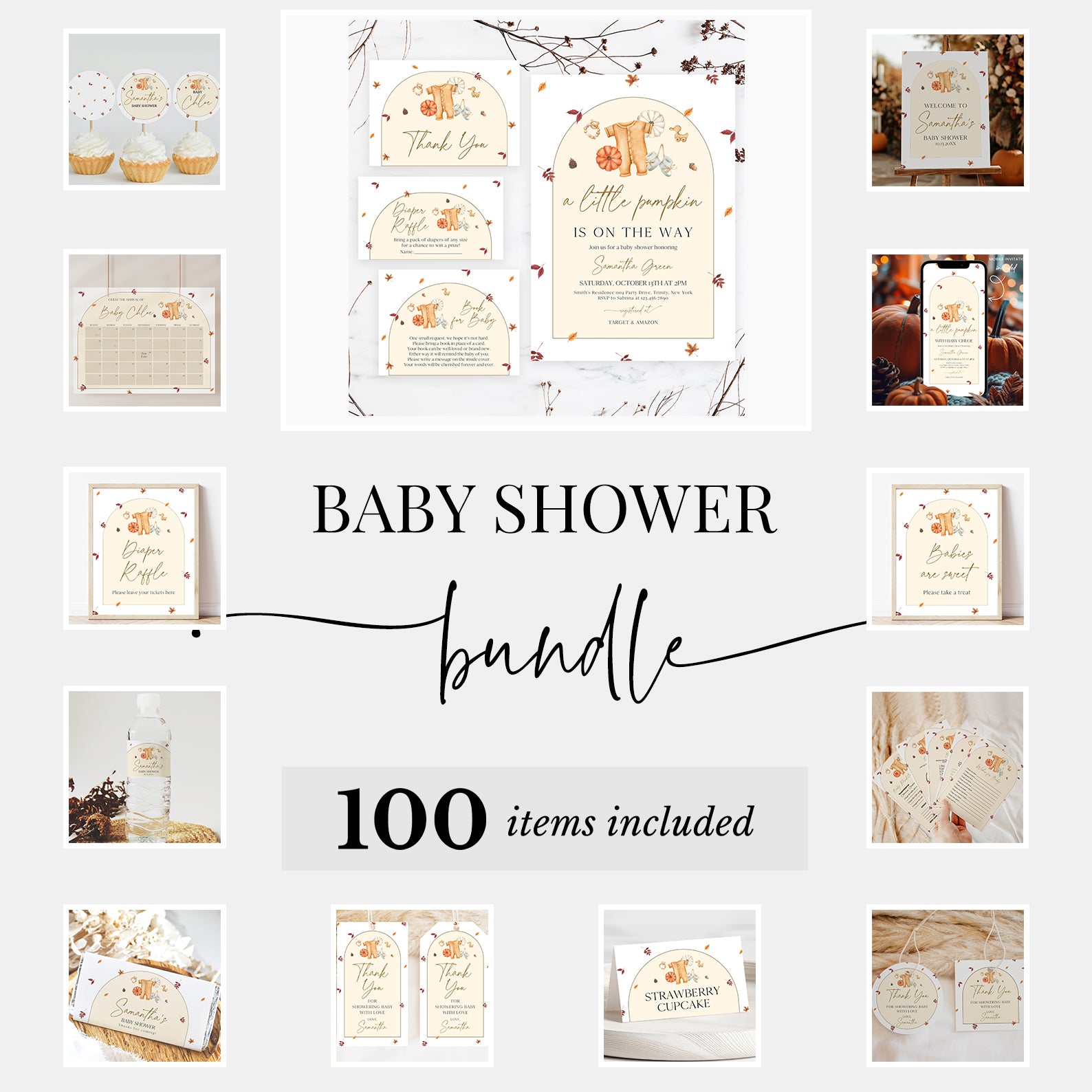 Make your fall baby shower unforgettable with this all-in-one Mega Bundle featuring 100 coordinating items! Designed with a cozy autumn palette, it includes invitations with mobile and backside versions, diaper raffle, books for baby, thank you card, welcome sign, table signs, favor tags, food labels, cupcake toppers, chocolate wrappers, water bottle labels, and 60 editable baby shower games. Accented with soft orange hues, pumpkins, baby items, and falling leaves, it’s perfect for celebrating your little pumpkin in style.