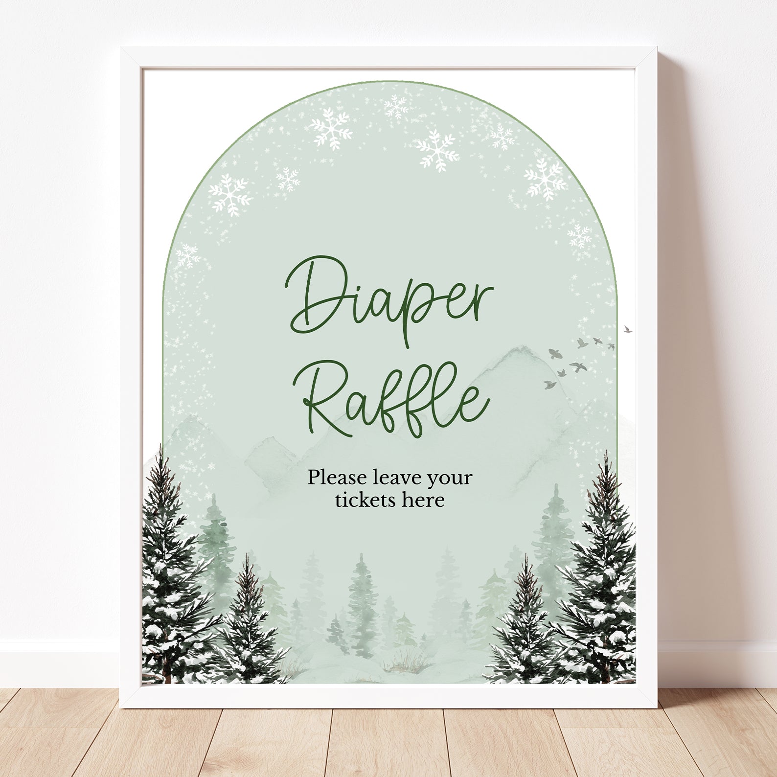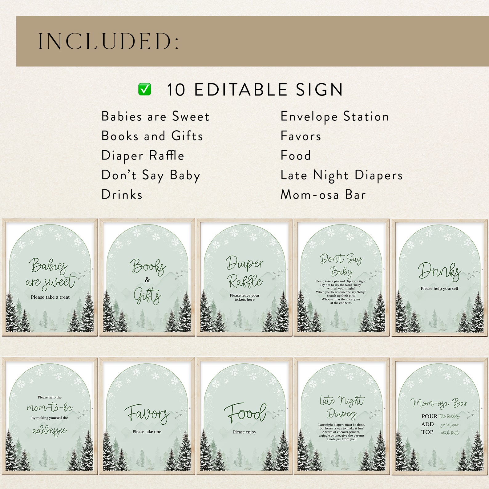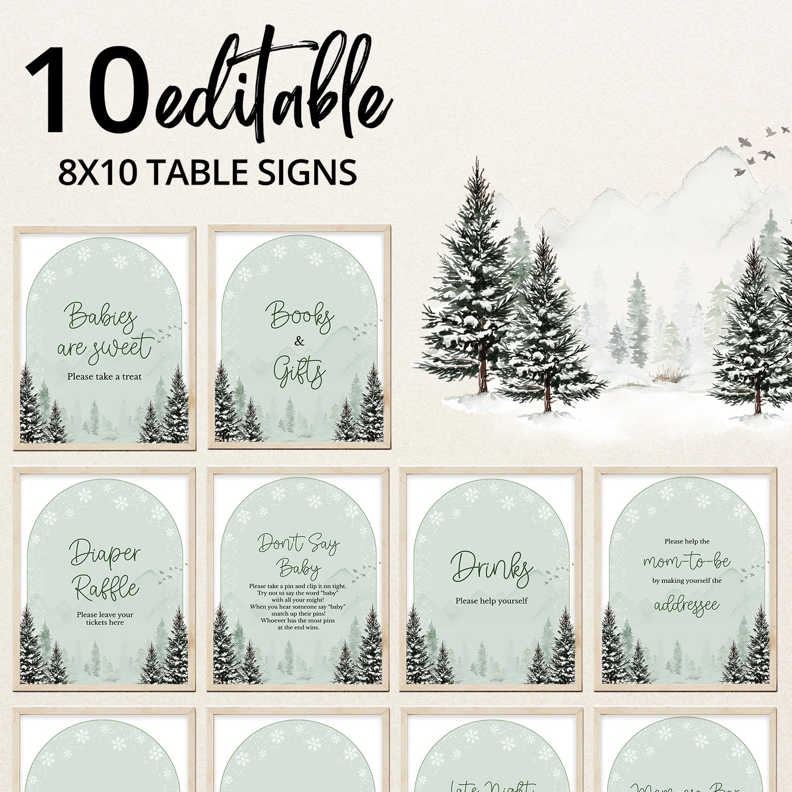 Add a touch of rustic winter charm to your baby shower with this set of 10 editable table signs. Designed in a serene green theme with snow-dusted pine trees and a cozy winter backdrop, they include: Babies Are Sweet, Books and Gifts, Diaper Raffle, Don’t Say Baby, Drinks, Envelope Station, Favors, Food, Late Night Diapers, and Mom-osa Bar. Perfect for creating a coordinated seasonal celebration.