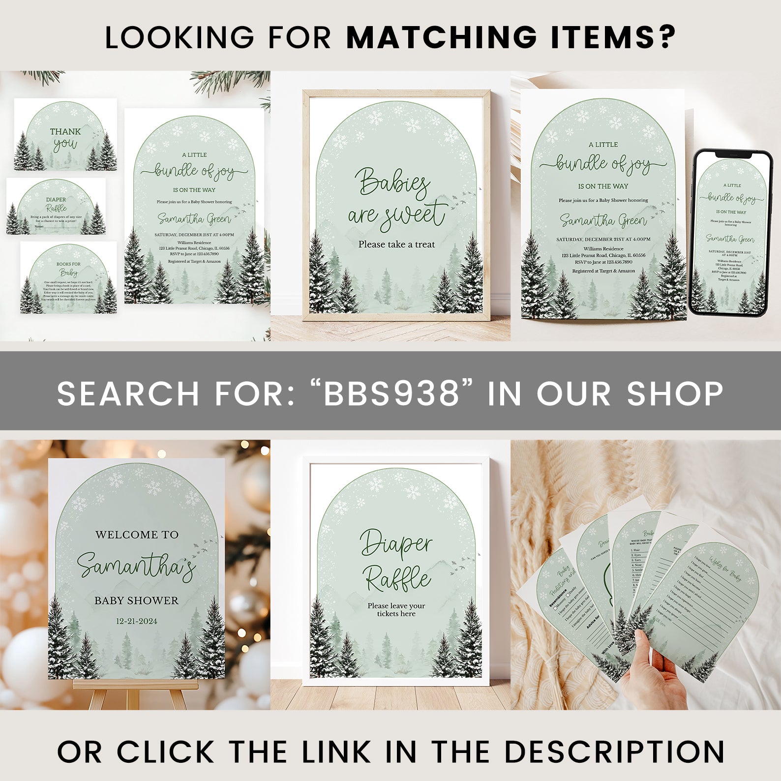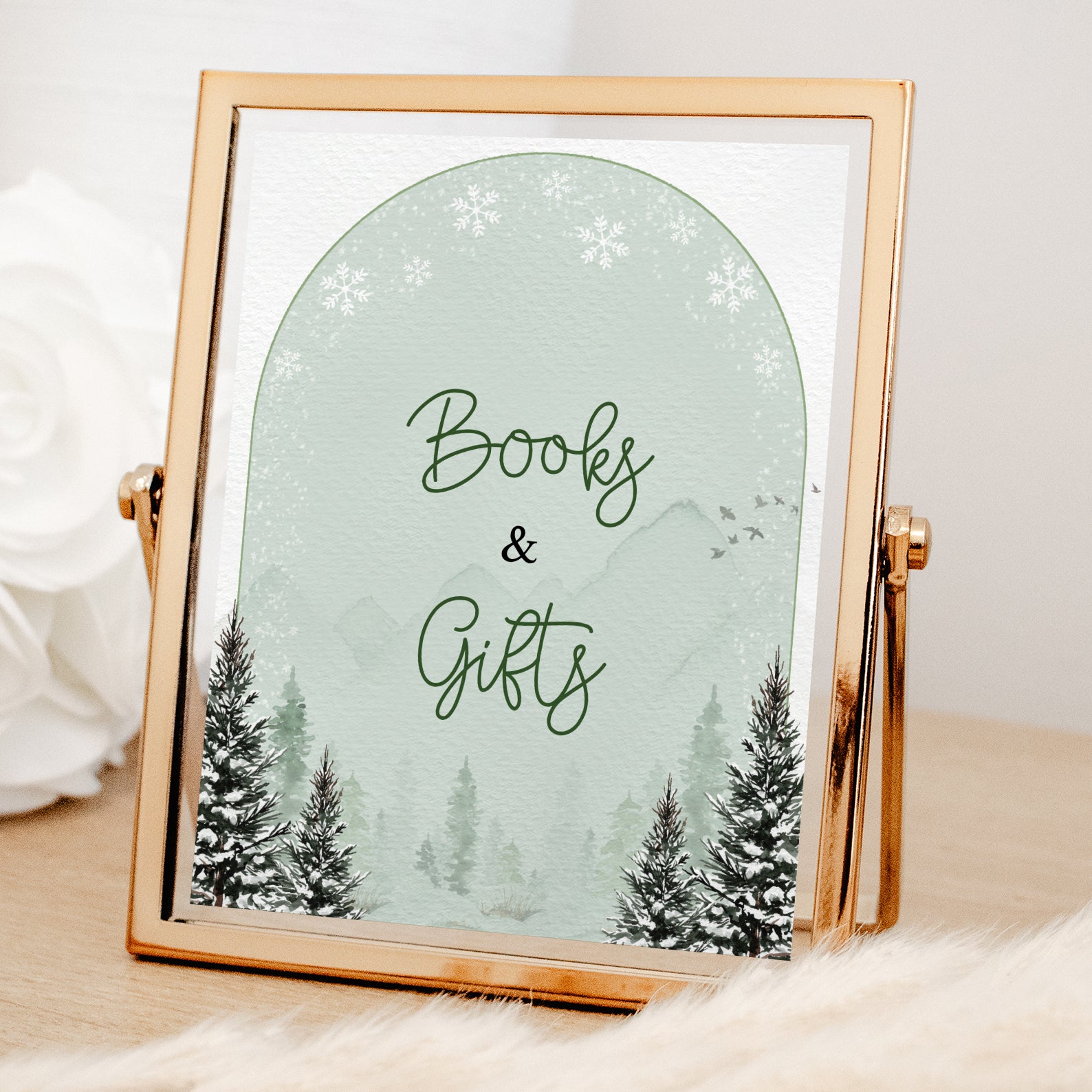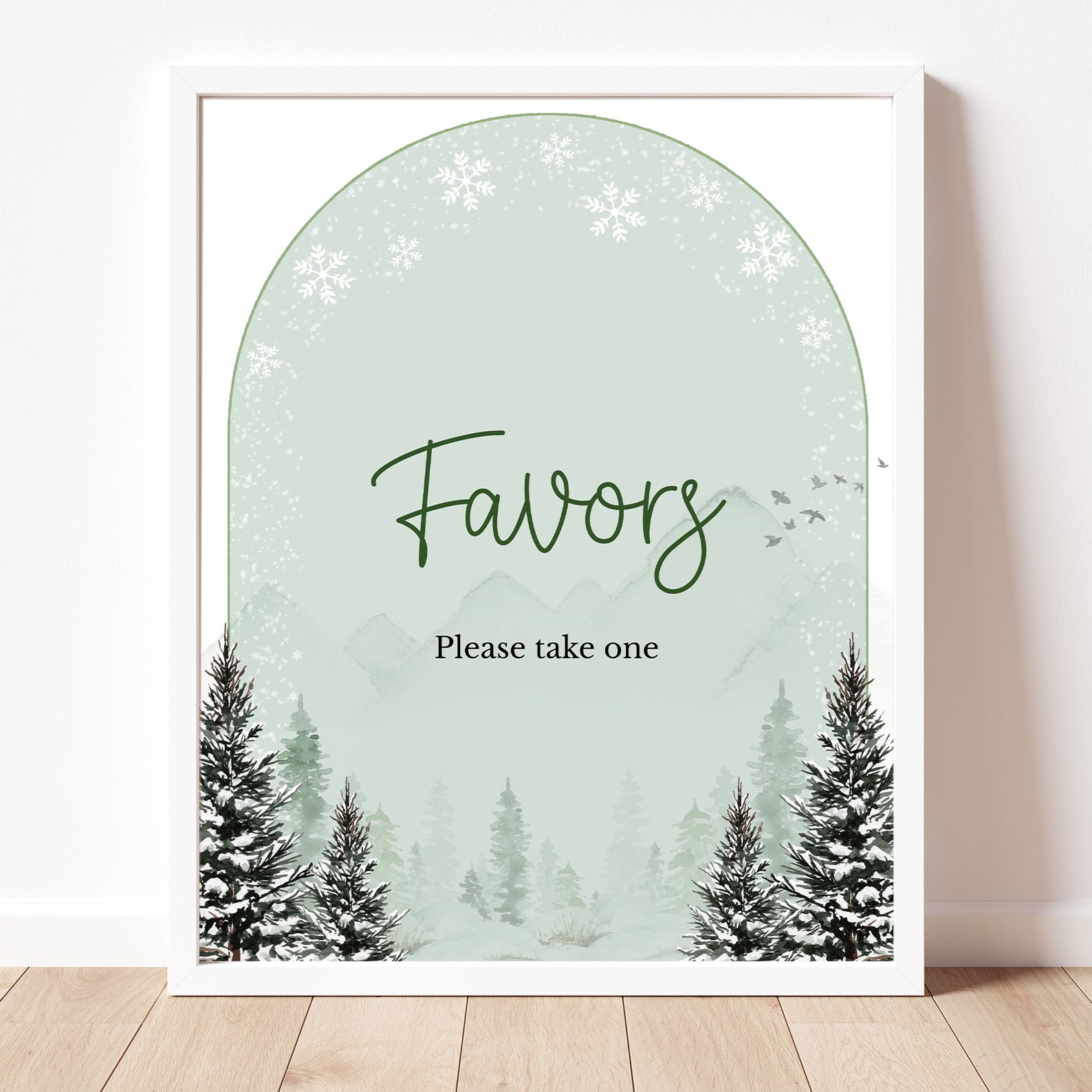 Add a touch of rustic winter charm to your baby shower with this set of 10 editable table signs. Designed in a serene green theme with snow-dusted pine trees and a cozy winter backdrop, they include: Babies Are Sweet, Books and Gifts, Diaper Raffle, Don’t Say Baby, Drinks, Envelope Station, Favors, Food, Late Night Diapers, and Mom-osa Bar. Perfect for creating a coordinated seasonal celebration.
