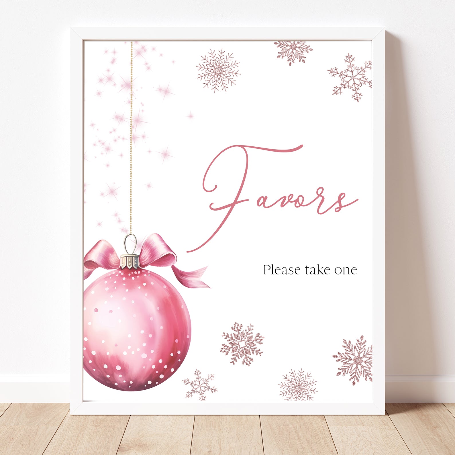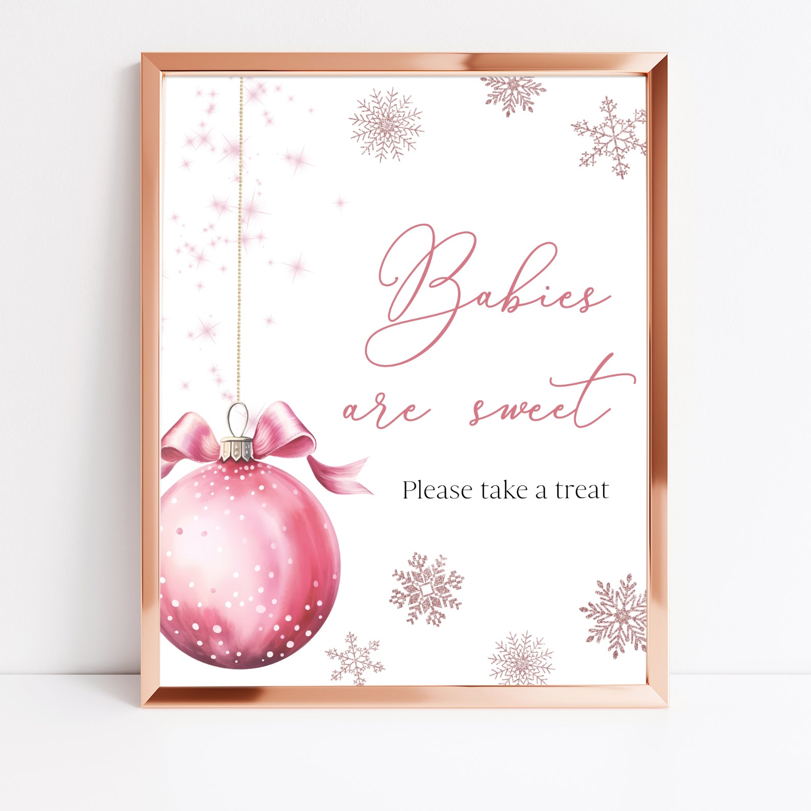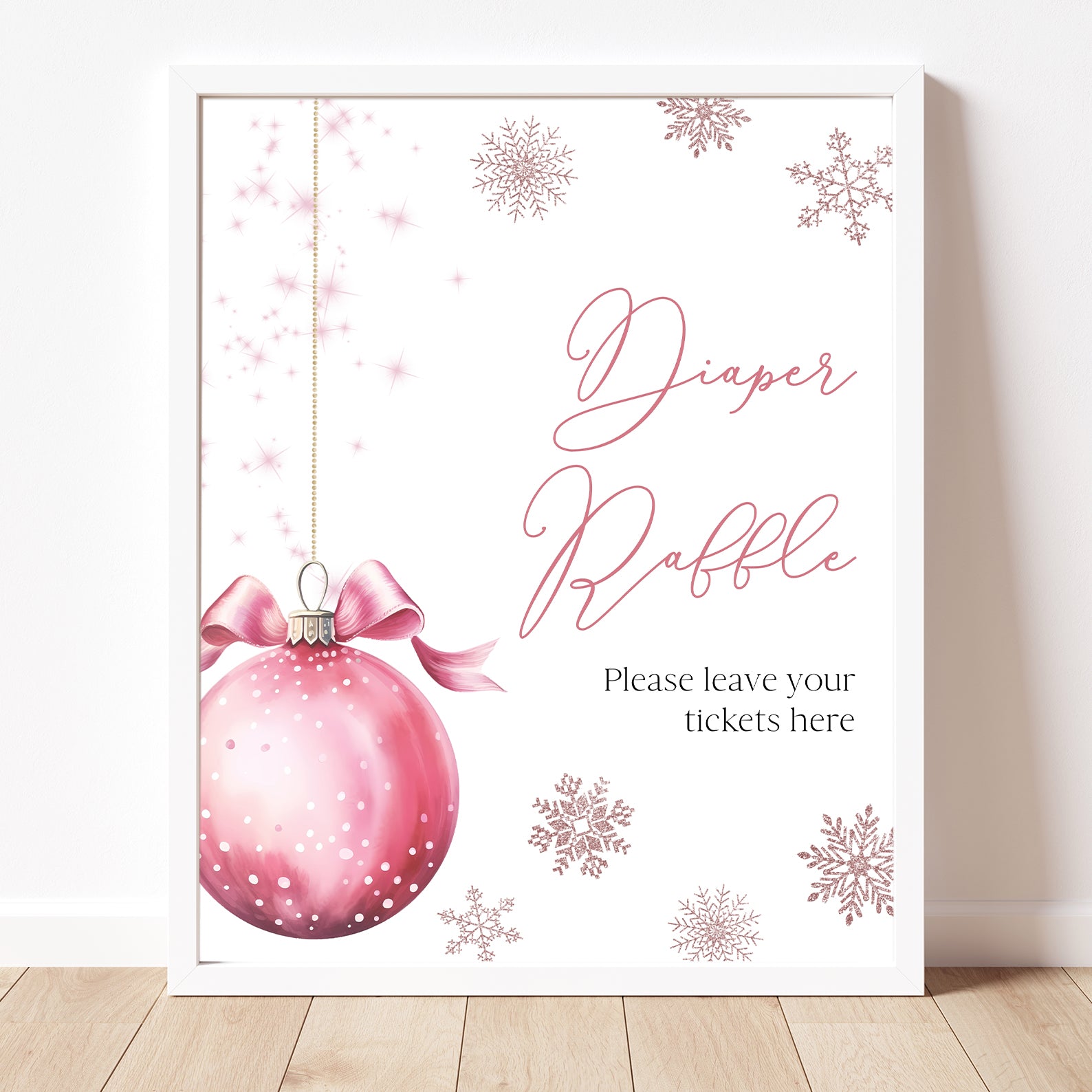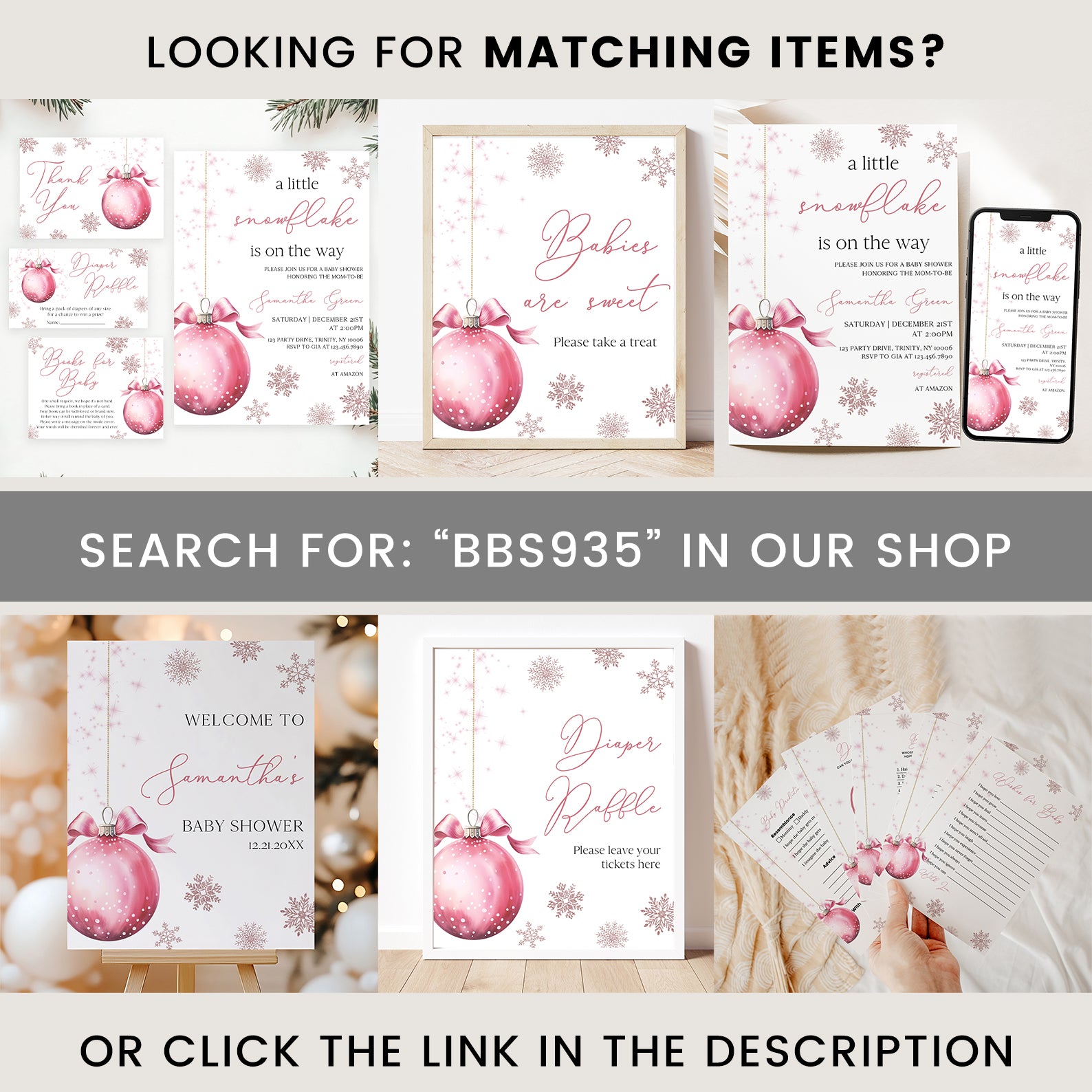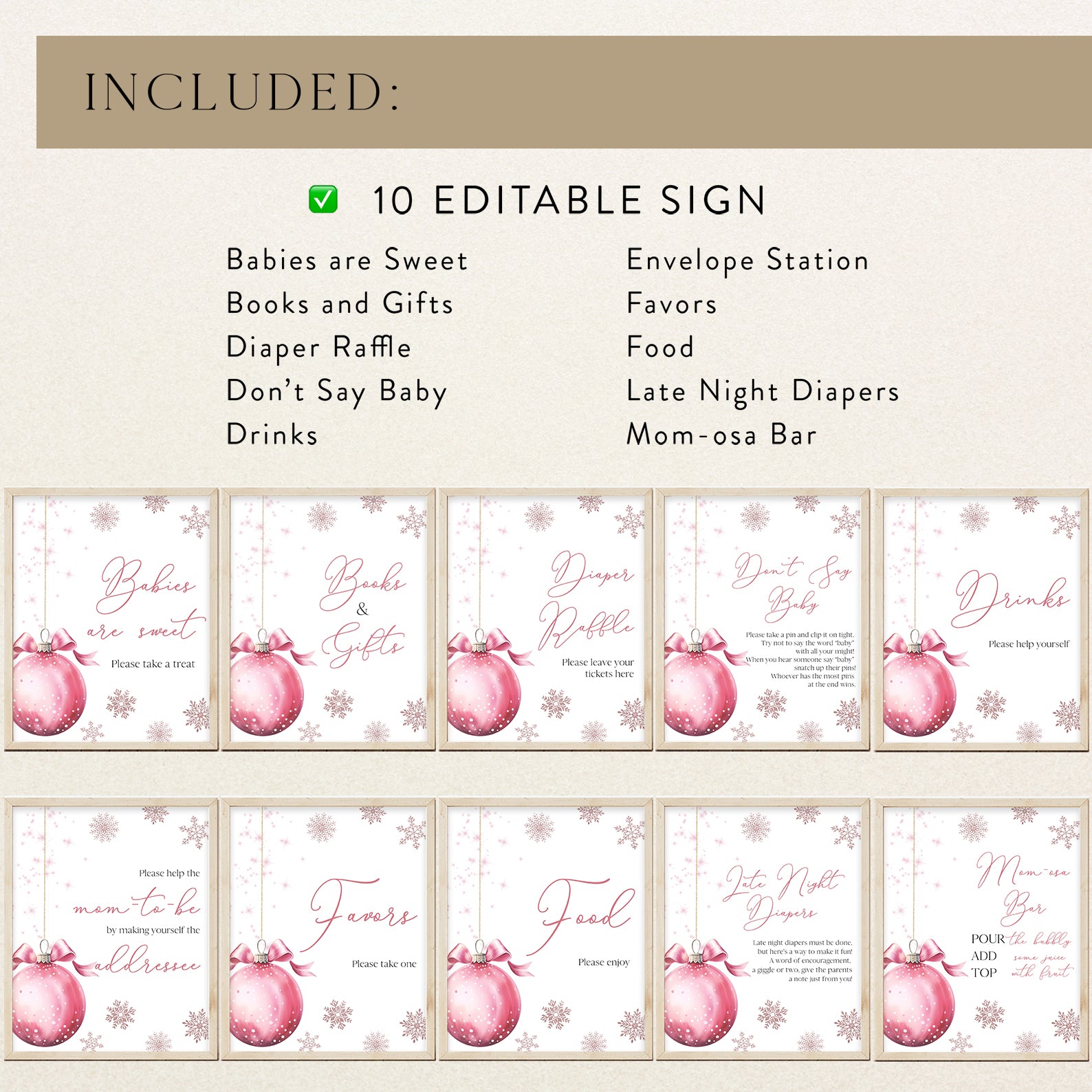 Add seasonal elegance to your baby shower with this set of 10 editable table signs, featuring a whimsical pink Christmas ball surrounded by delicate snowflakes. Perfect for a coordinated winter celebration, the set includes: Babies Are Sweet, Books and Gifts, Diaper Raffle, Don’t Say Baby, Drinks, Envelope Station, Favors, Food, Late Night Diapers, and Mom-osa Bar. Fully customizable to match your event’s style and theme.