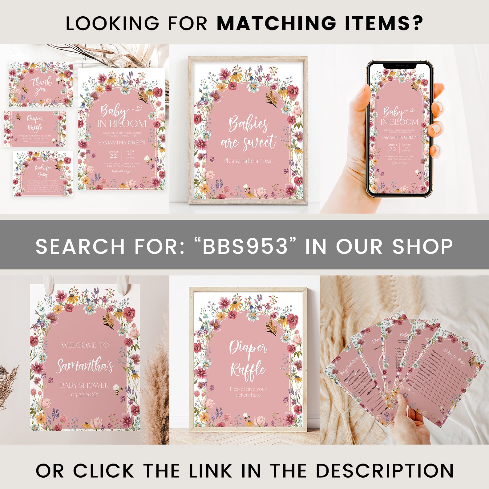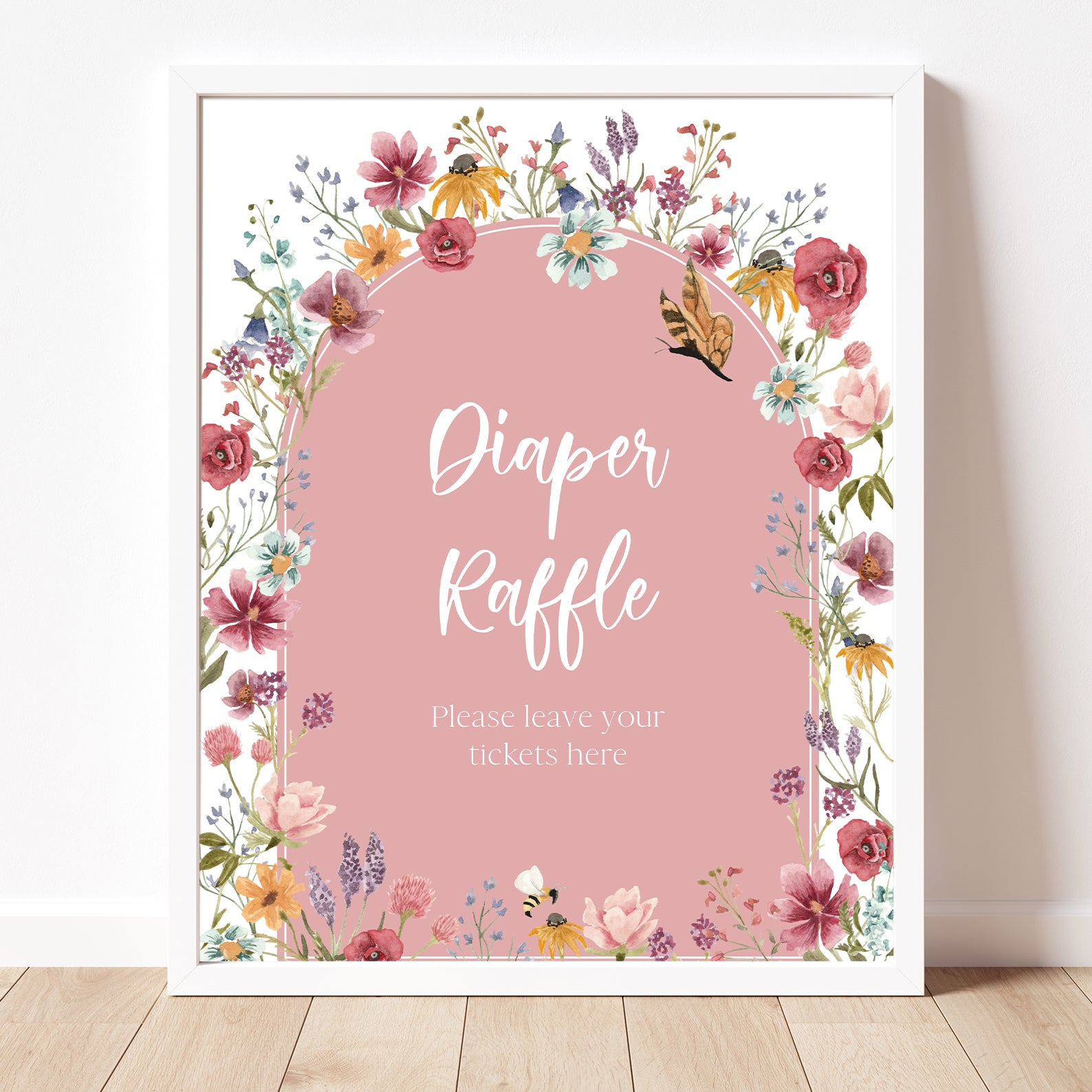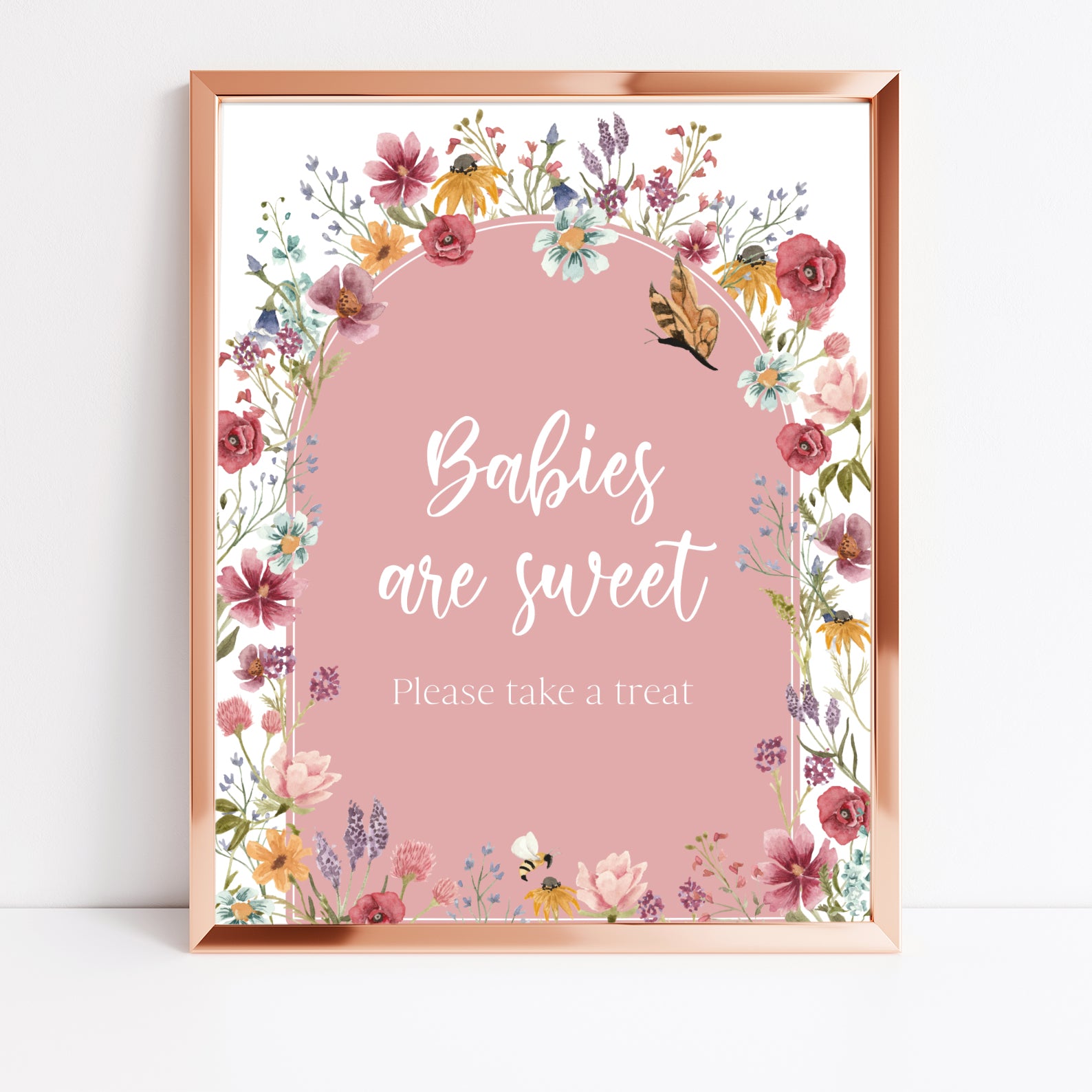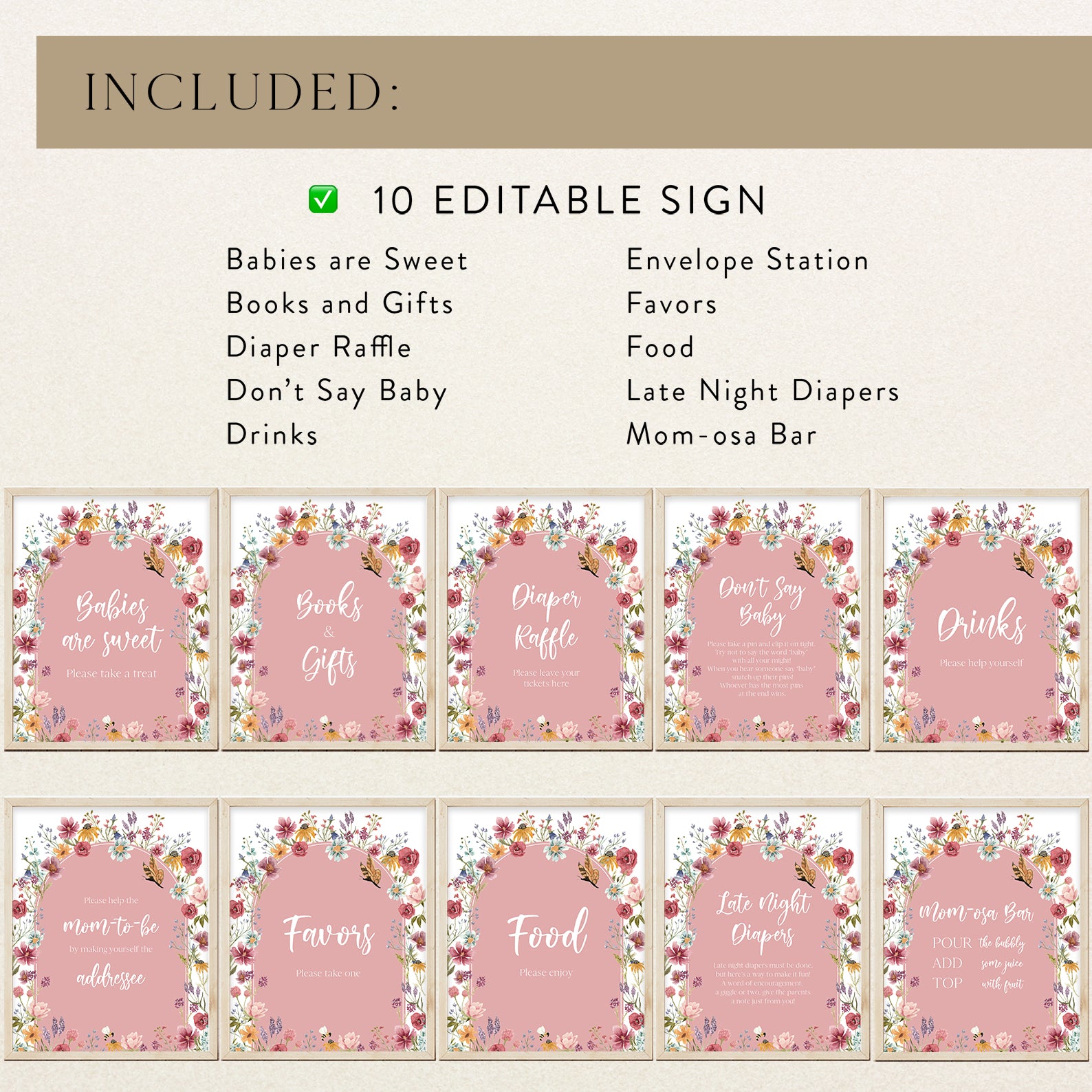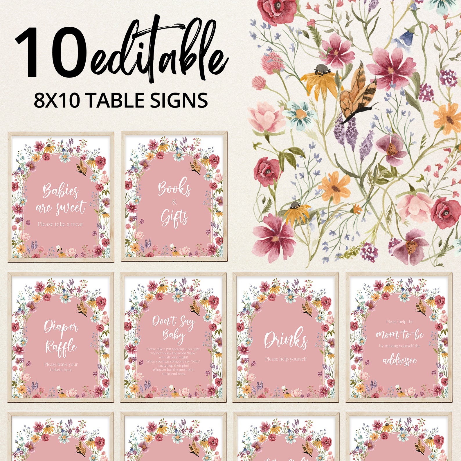 Add a touch of spring charm to your baby shower with these beautifully designed table signs! Featuring a soft pink arch, delicate butterflies, buzzing bees, and vibrant wildflowers, this set of 10 includes Babies Are Sweet, Books & Gifts, Diaper Raffle, Don't Say Baby, Drinks, Envelope Station, Favors, Food, Late Night Diapers, and Mom-osa Bar. A lovely way to enhance your "Baby in Bloom" celebration!
