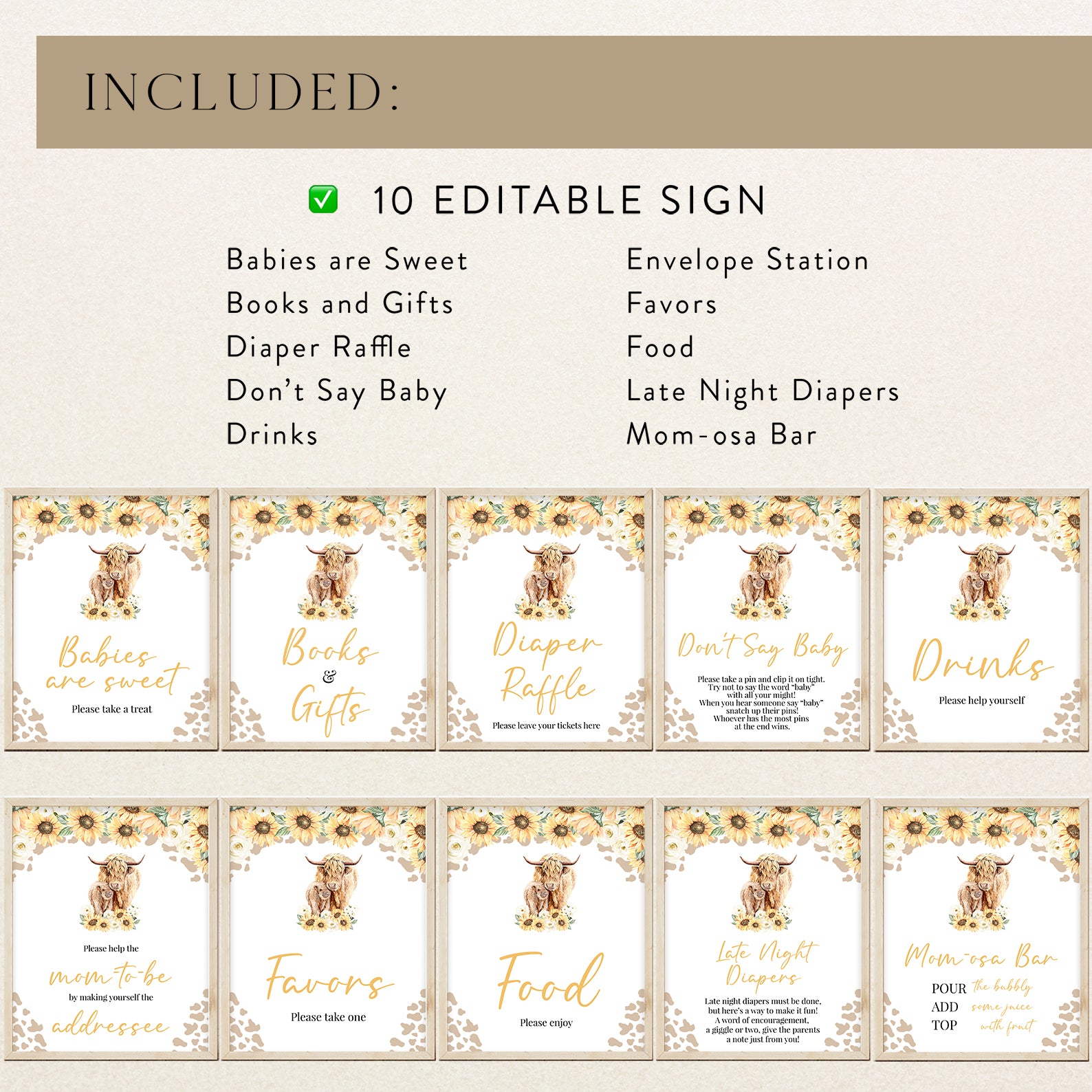 Enhance your baby shower décor with a set of ten editable table signs! Each sign features whimsical brown cow prints and sunflower accents, covering Babies Are Sweet, Books and Gifts, Diaper Raffle, Don’t Say Baby, Drinks, Envelope Station, Favors, Food, Late Night Diapers, and Mom-osa Bar. Fun and cohesive, these signs add a touch of charm to every table.