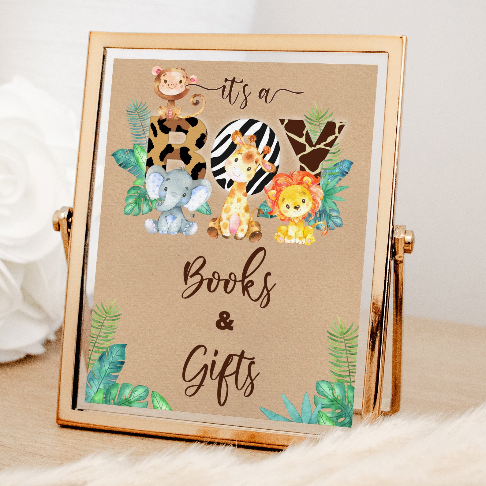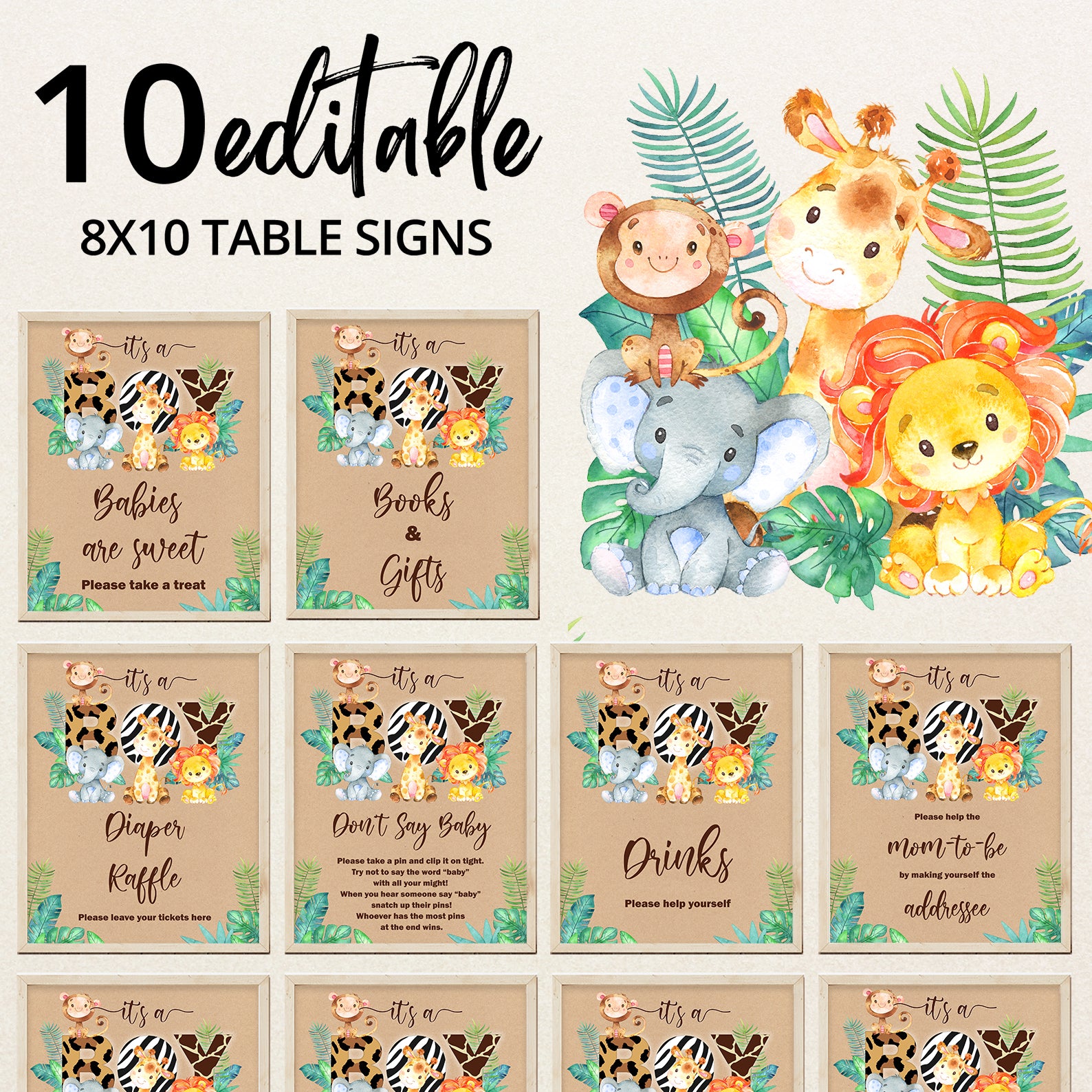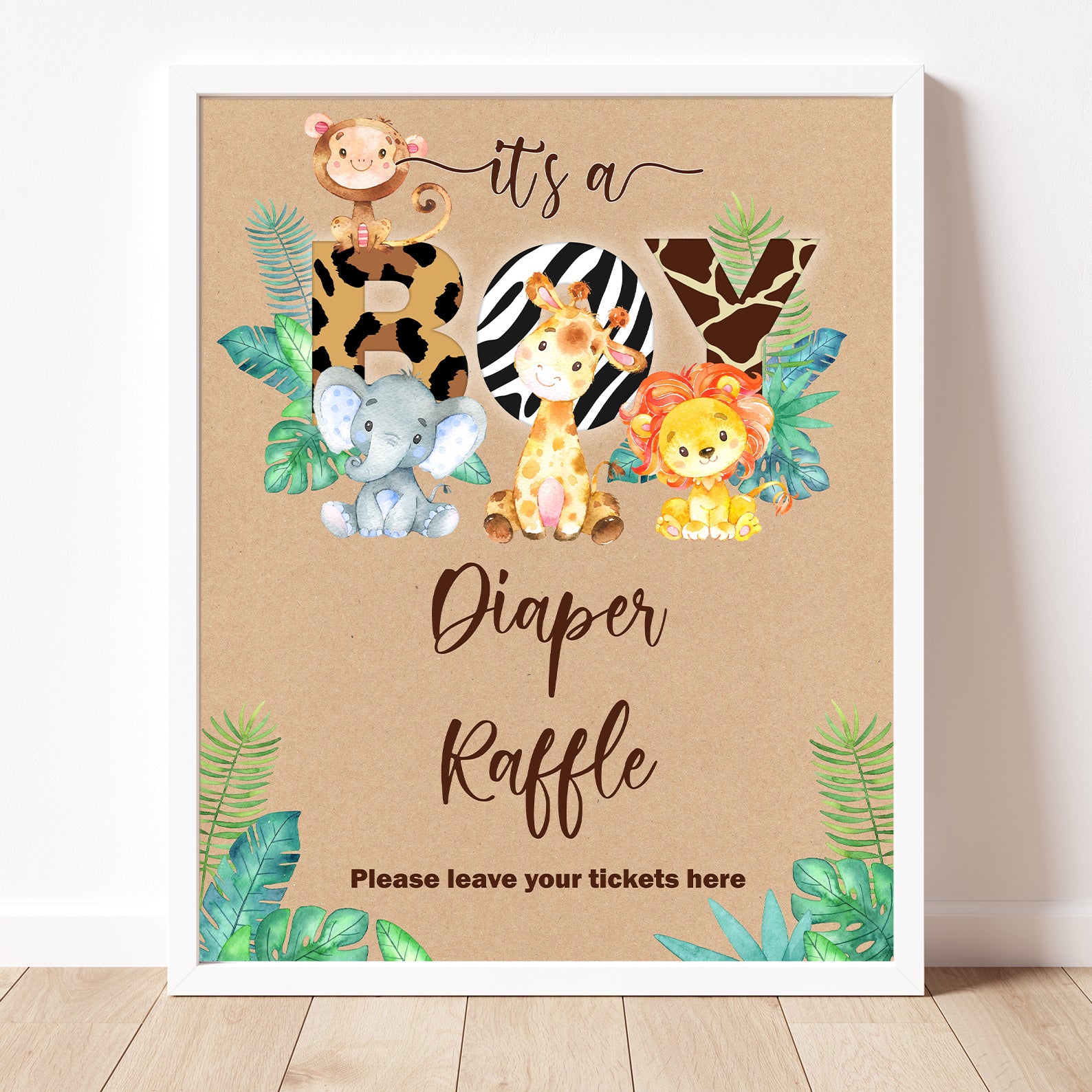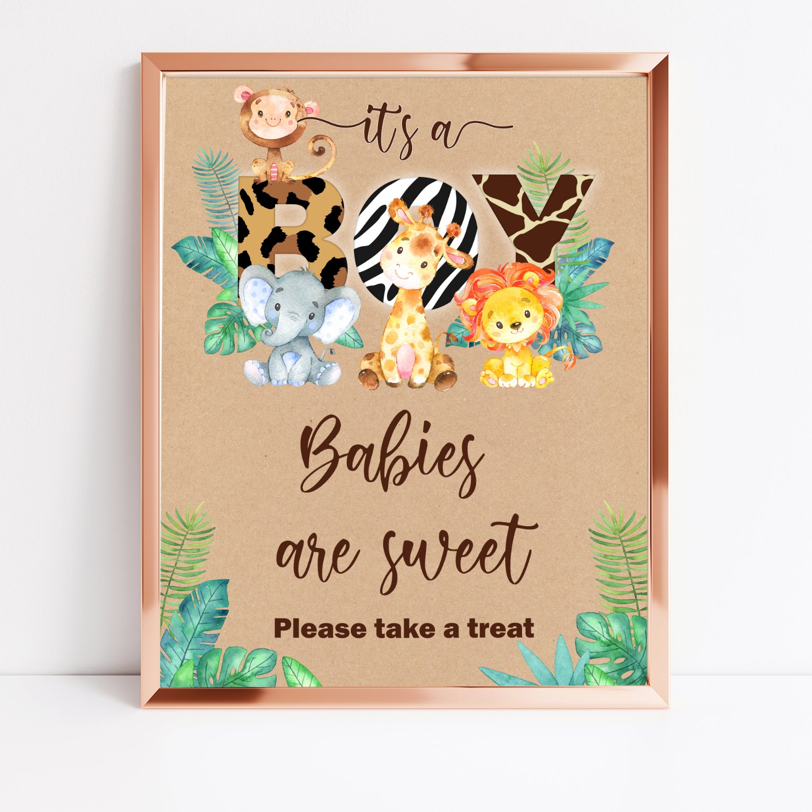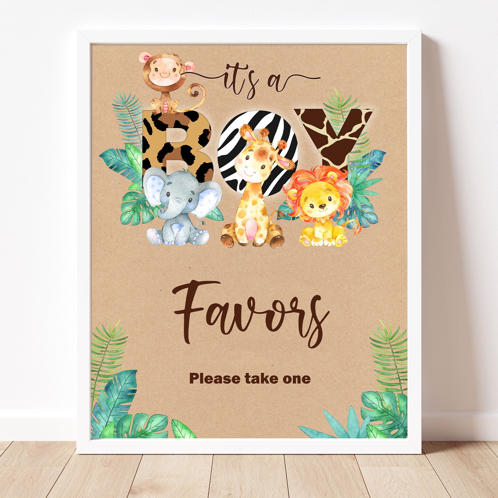 - Purchase this It’s a Boy Jungle Safari Baby Shower Kraft Table Sign template