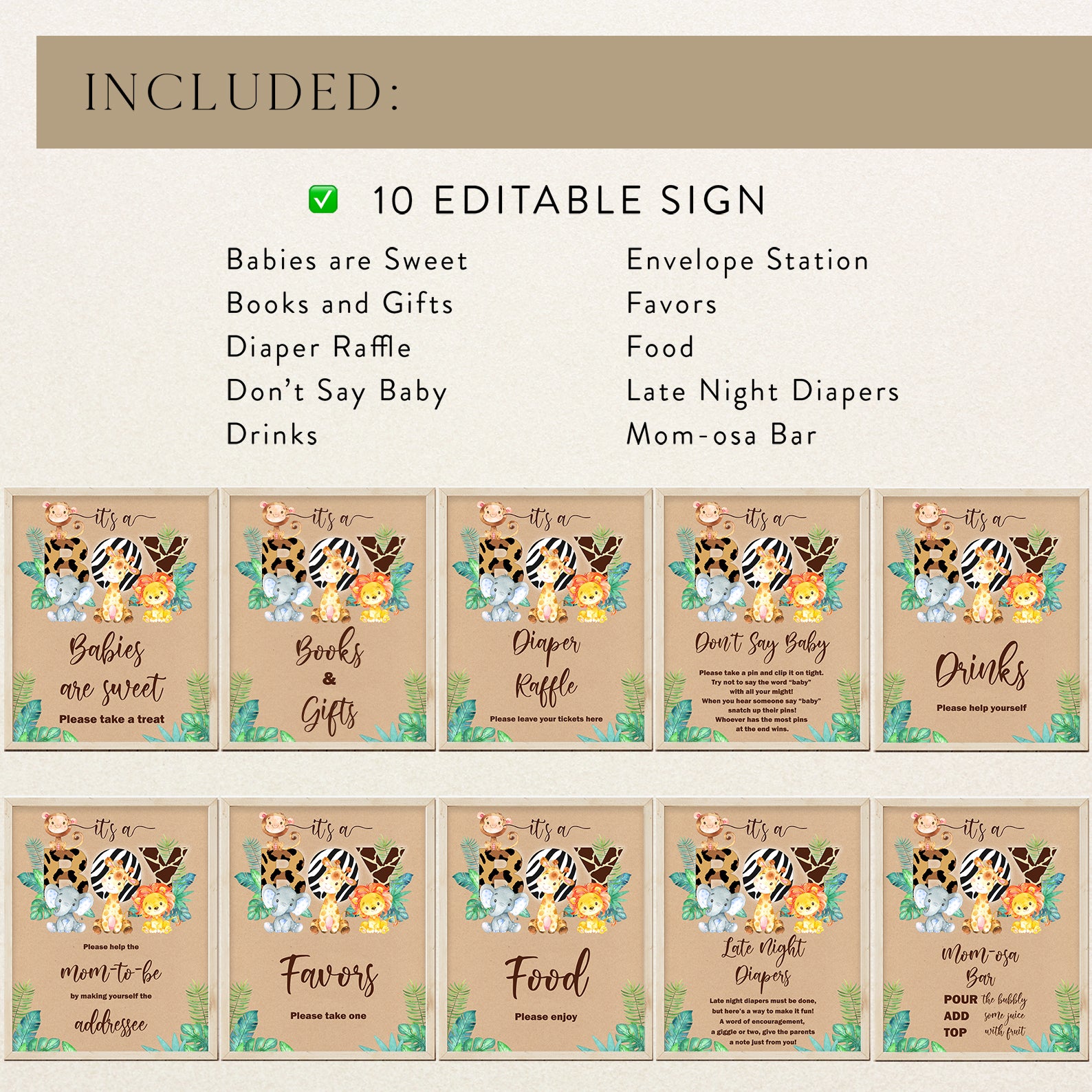 Add coordinated charm to your party with our editable Table Sign Bundle! Designed with a kraft background, leafy jungle greenery, and cute safari animals, this set includes ten baby shower table signs: Babies Are Sweet, Books and Gifts, Diaper Raffle, Don’t Say Baby, Drinks, Envelope Station, Favors, Food, Late Night Diapers, and Mom-osa Bar. Stylish, easy to edit, and versatile, these signs make decorating your safari-themed shower effortless and fun.