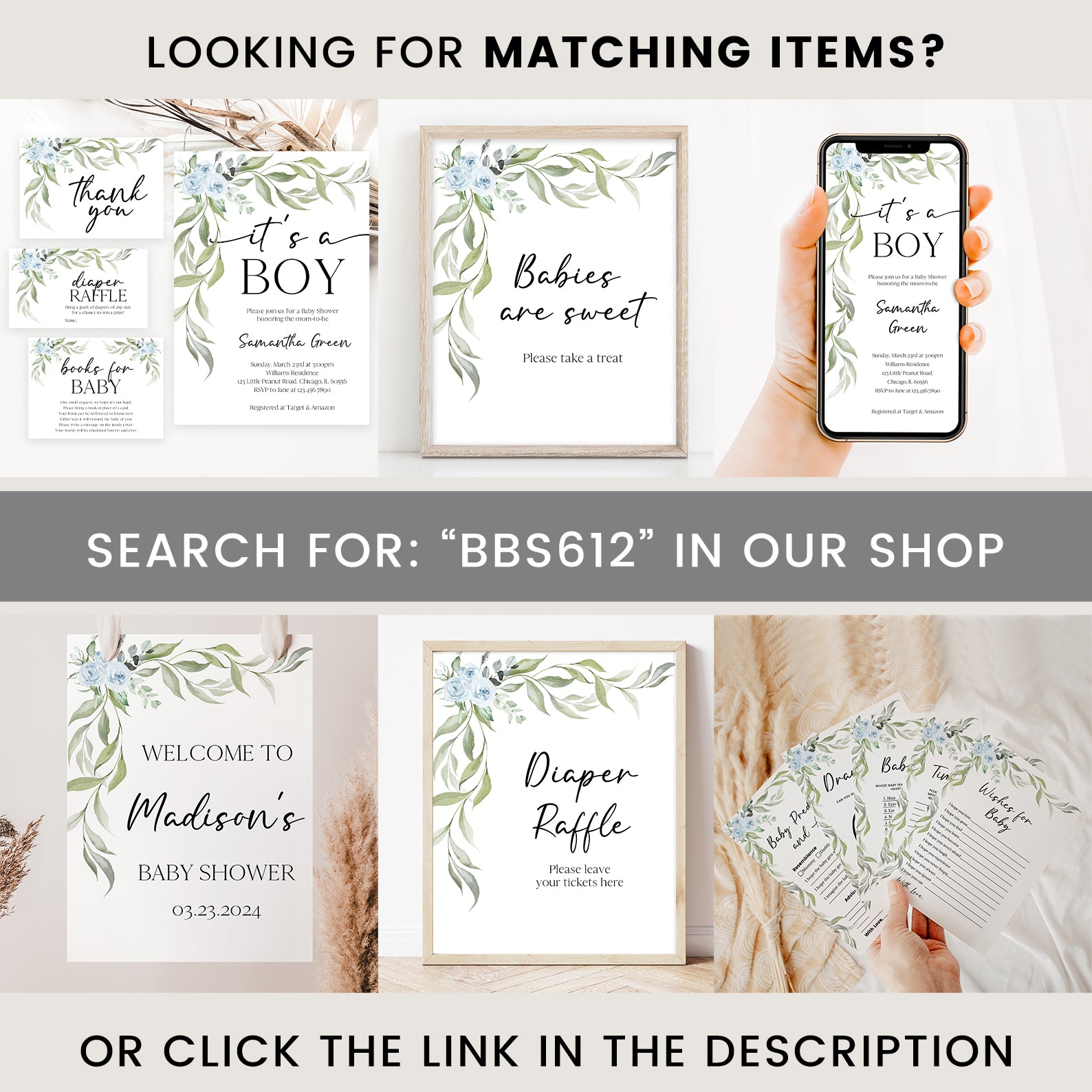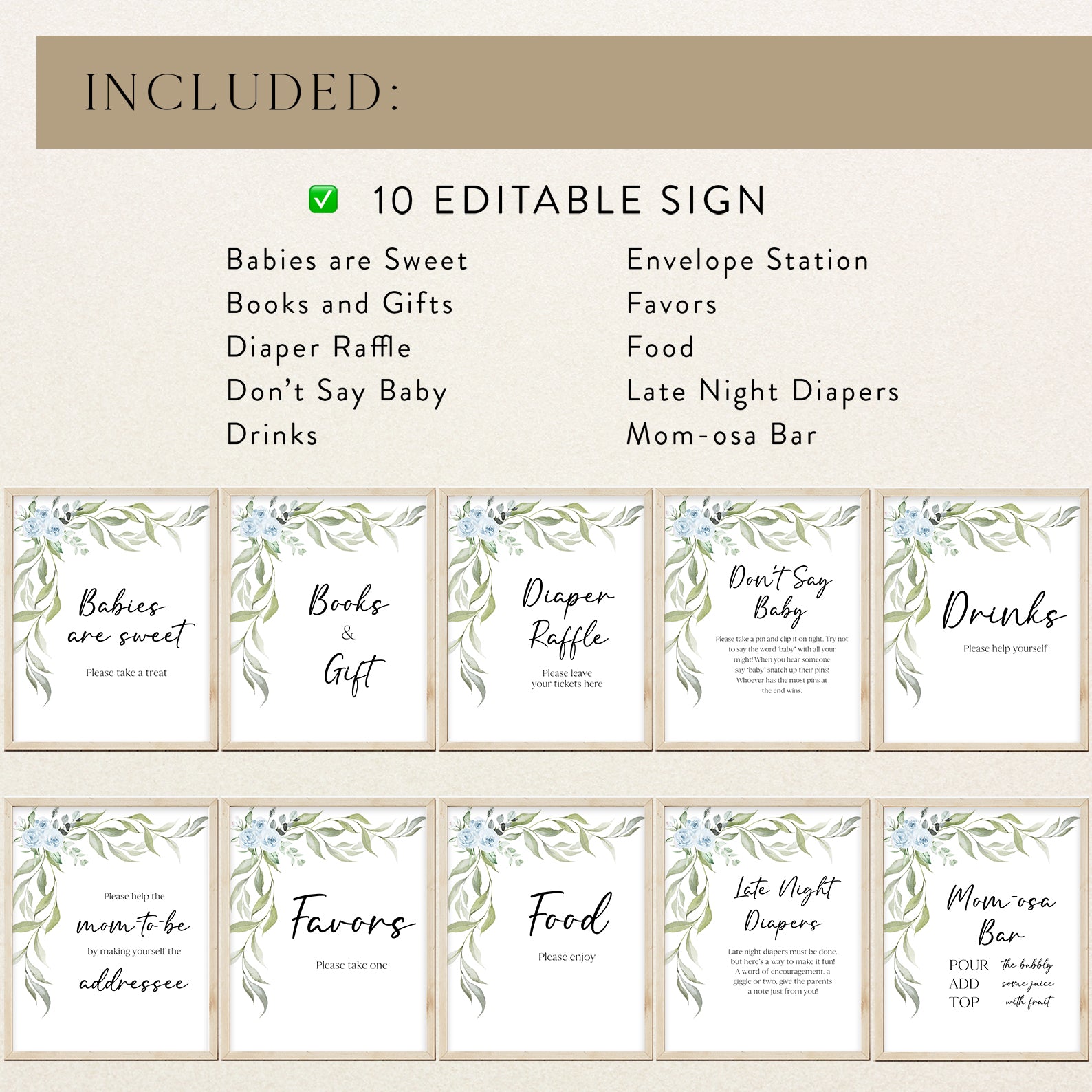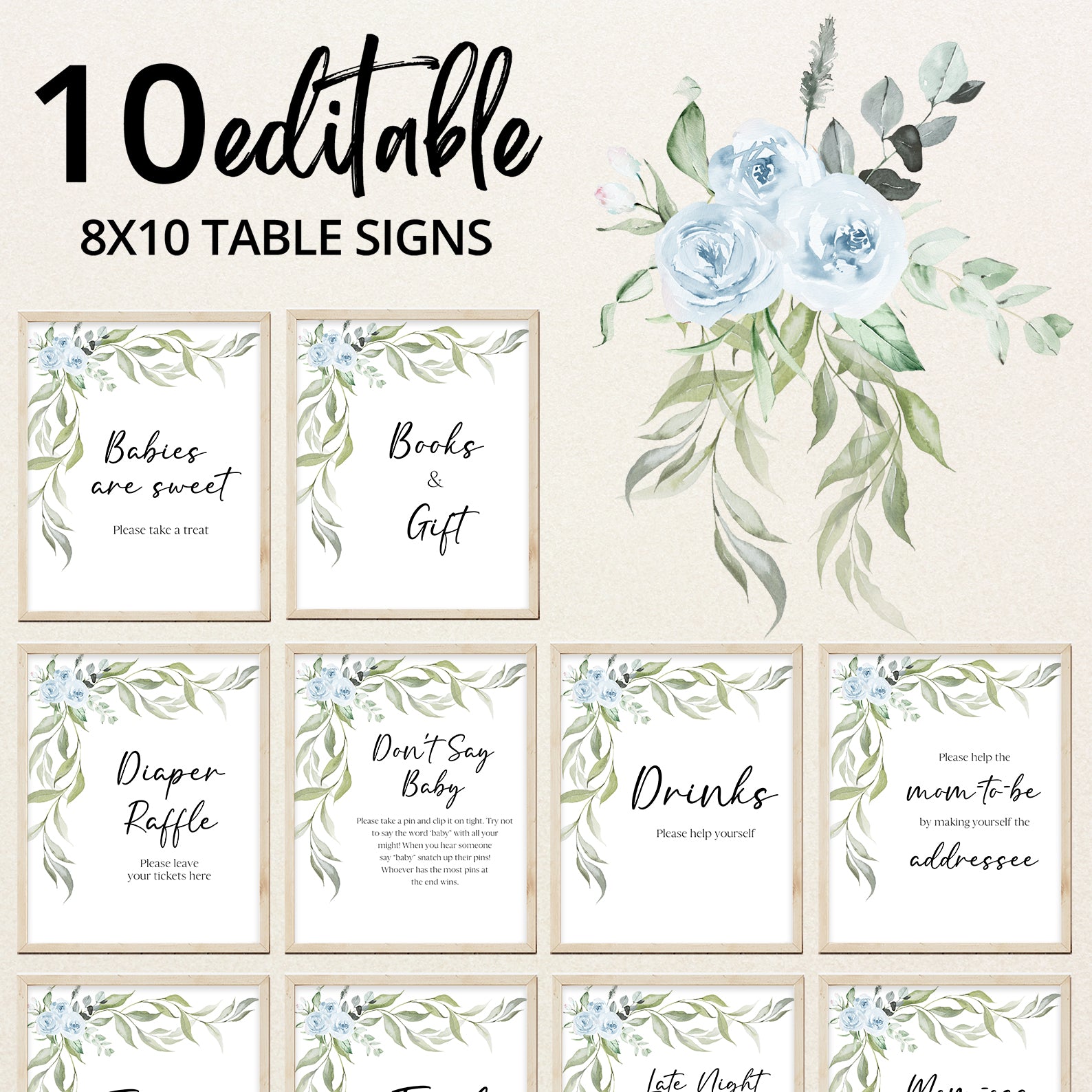 Enhance your baby shower décor with our matching table sign set featuring elegant greenery and blue roses. This bundle includes ten editable signs: Babies Are Sweet, Books and Gifts, Diaper Raffle Sign, Don’t Say Baby, Drinks Sign, Envelope Station, Favors, Food Sign, Late Night Diapers, and Mom-osa Bar. Stylish and practical, these signs tie your celebration theme together effortlessly.
