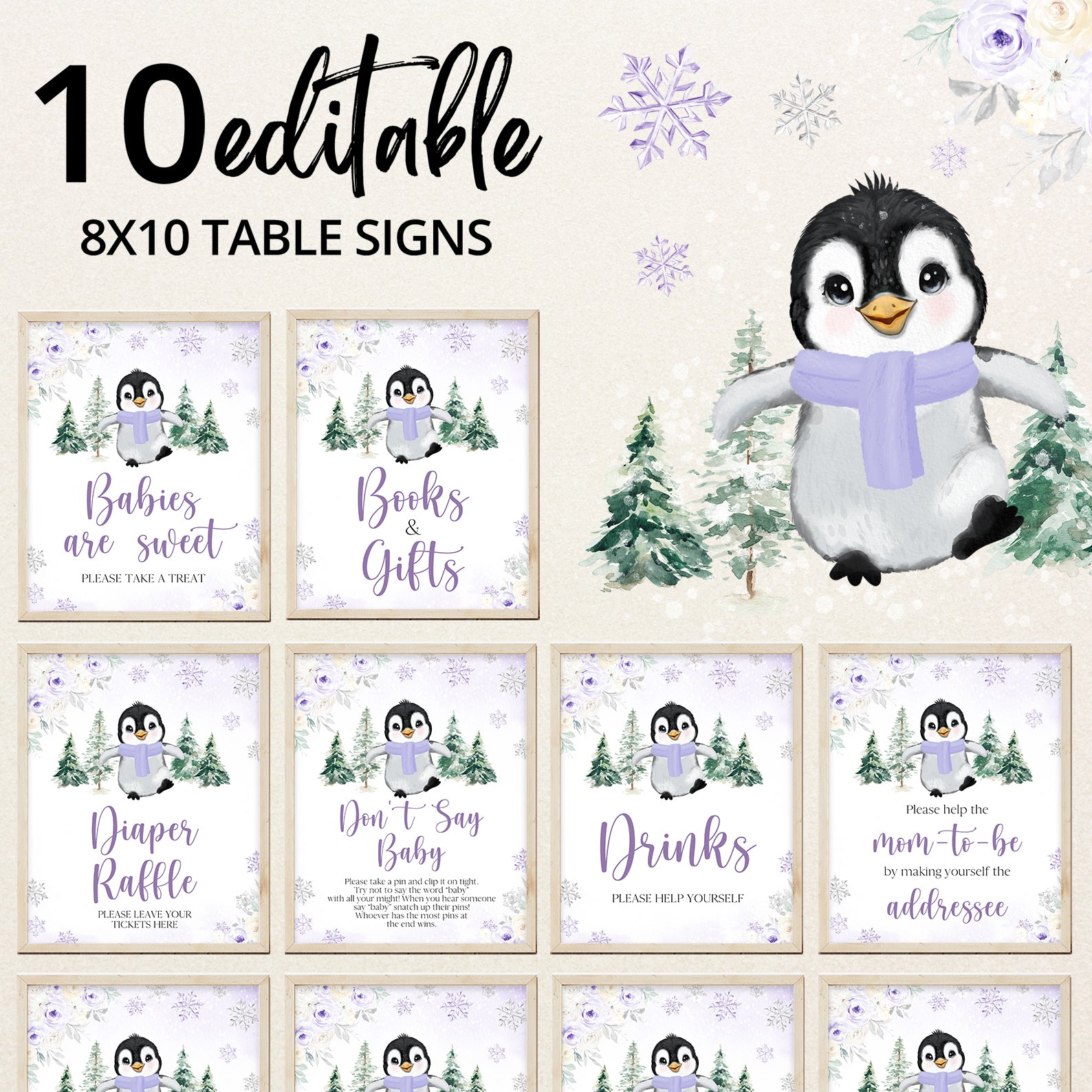 Add a festive touch to your winter baby shower with our editable “Baby It’s Cold Outside” table sign set. Featuring a sweet baby penguin in a scarf, snowy pine trees, and a floral border in silver, blue, pink, or purple, this bundle includes 10 signs: Babies Are Sweet, Books and Gifts, Diaper Raffle, Don’t Say Baby, Drinks, Envelope Station, Favors, Food, Late Night Diapers, and Mom-osa Bar.