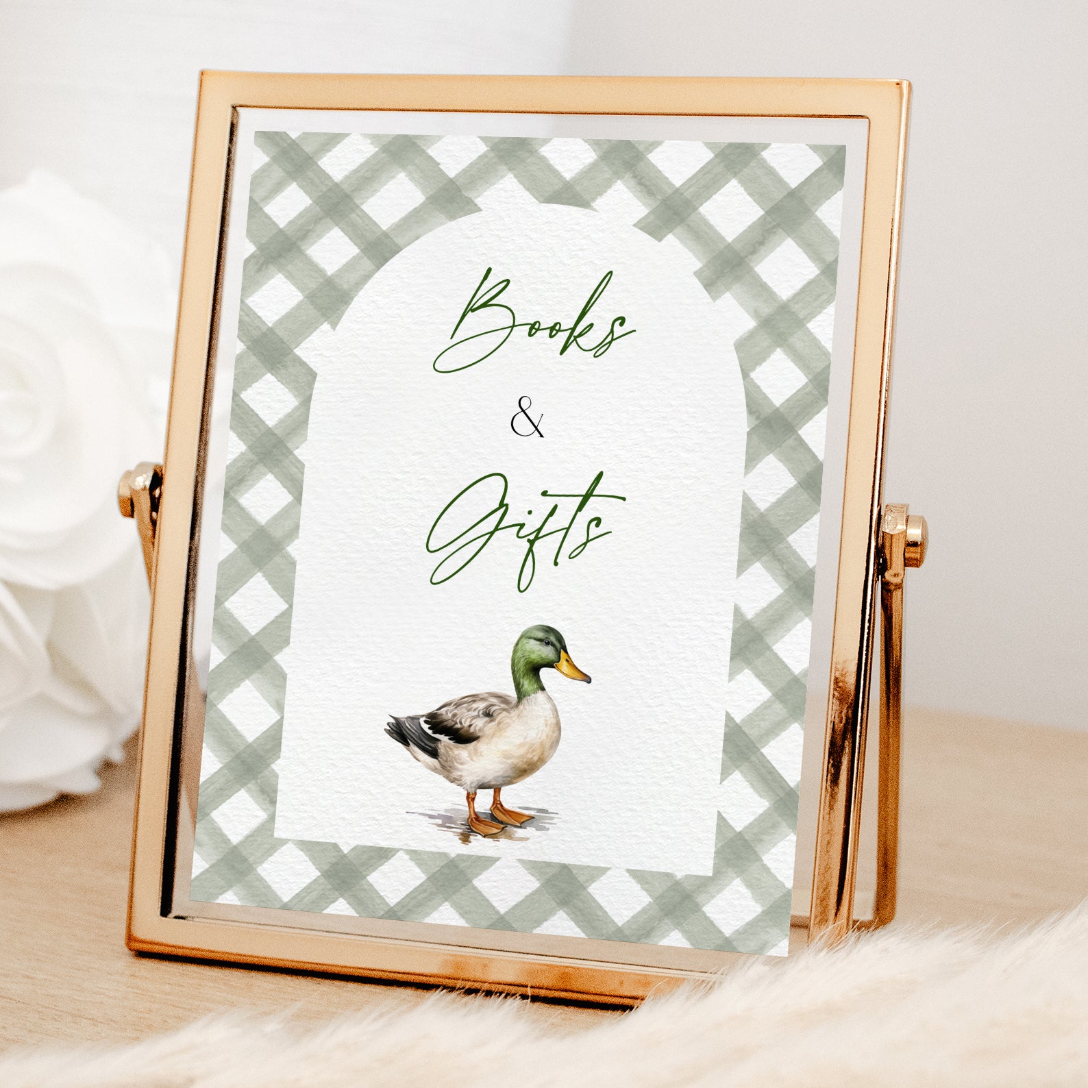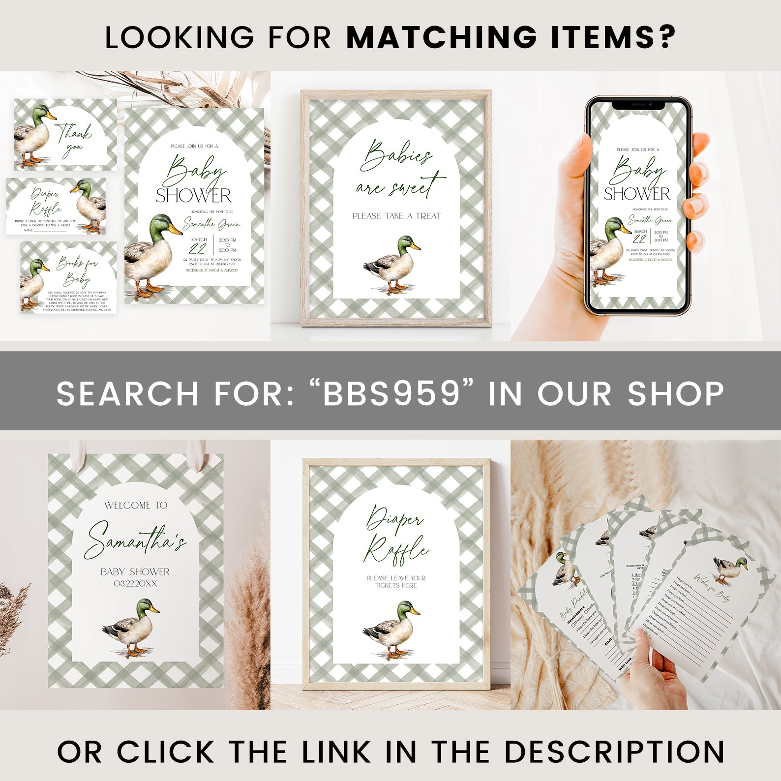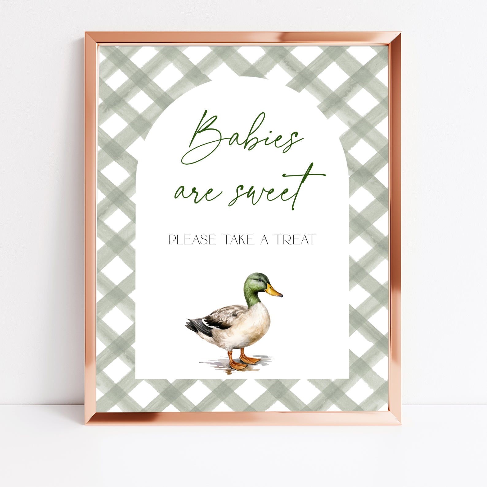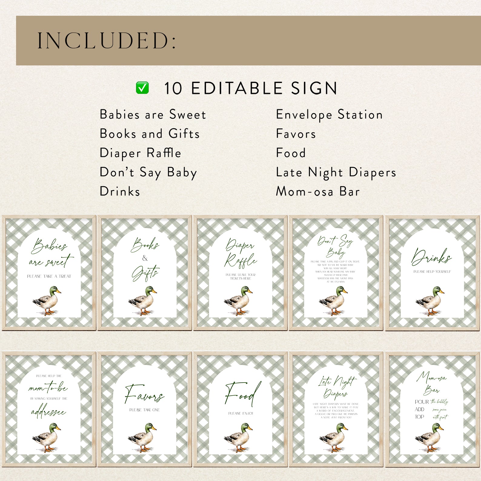 Complete your baby shower with these charming rustic table signs! Featuring a cozy green plaid background and a whimsical mallard duck illustration, this set adds a natural, outdoorsy touch to your celebration. The elegant arch beautifully frames each label, including Babies Are Sweet, Books & Gifts, Diaper Raffle, Don't Say Baby, Drinks, Envelope Station, Favors, Food, Late Night Diapers, and Mom-osa Bar. Perfect for a warm and inviting gathering!