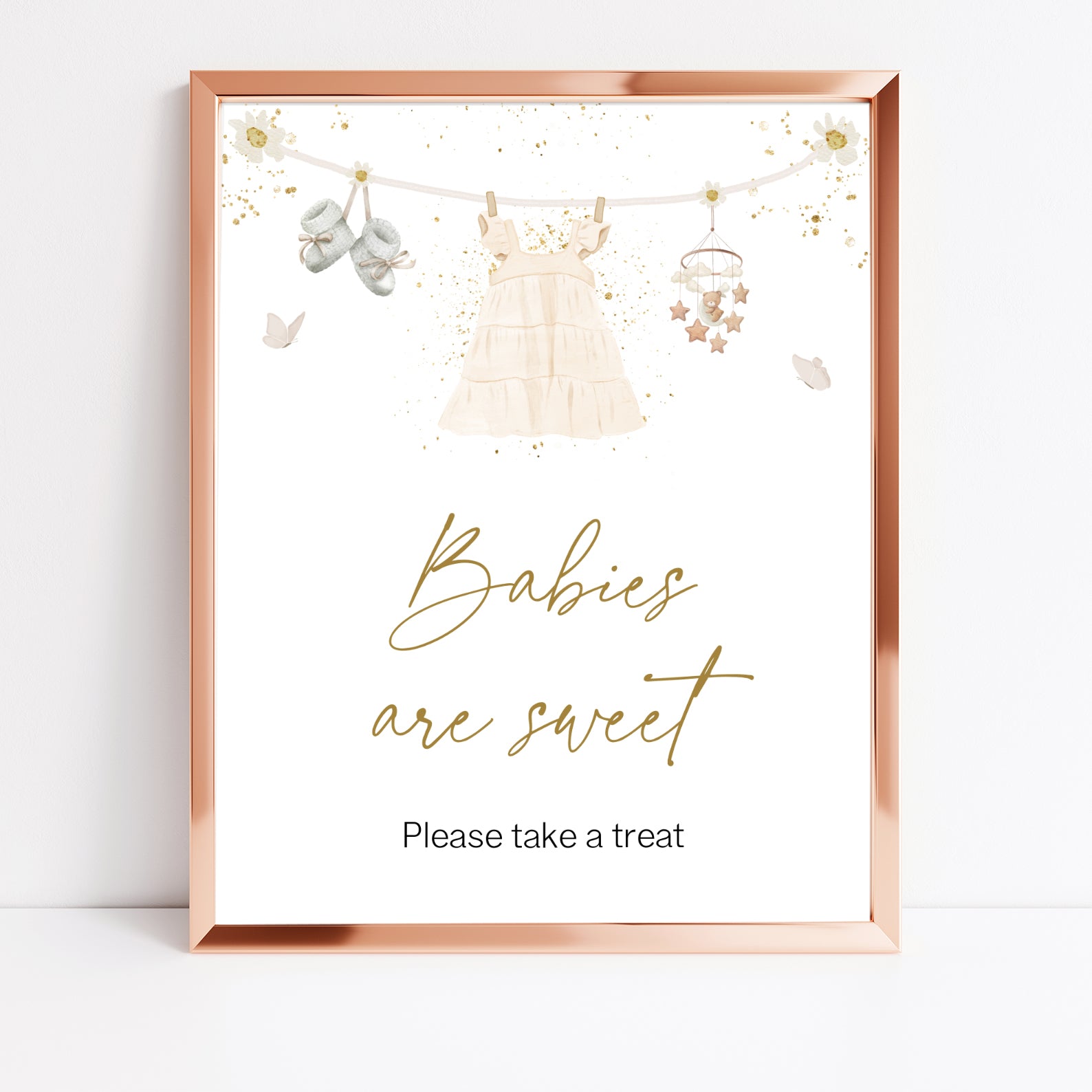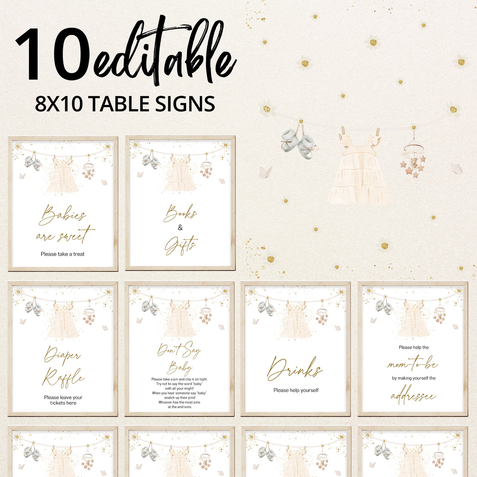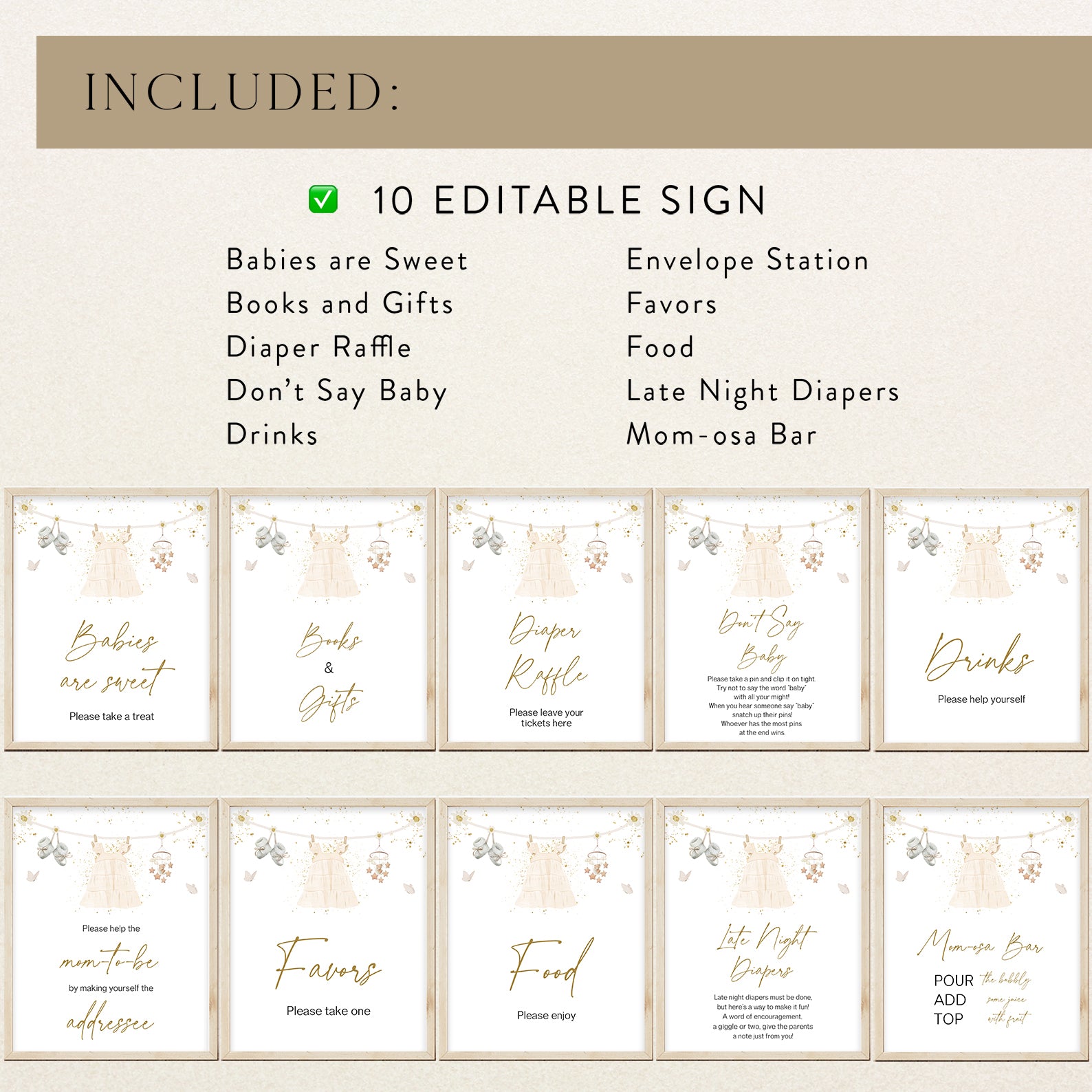 Add a royal touch to your baby shower with these elegant table signs! Featuring delicate baby shoes, a charming baby dress, and a whimsical crib mobile adorned with floral accents, each sign is designed with soft pastel hues, gold glitter sparkles, and fluttering butterflies. This set includes Babies Are Sweet, Books & Gifts, Diaper Raffle, Don't Say Baby, Drinks, Envelope Station, Favors, Food, Late Night Diapers, and Mom-osa Bar—perfect for a magical celebration fit for your little princess!