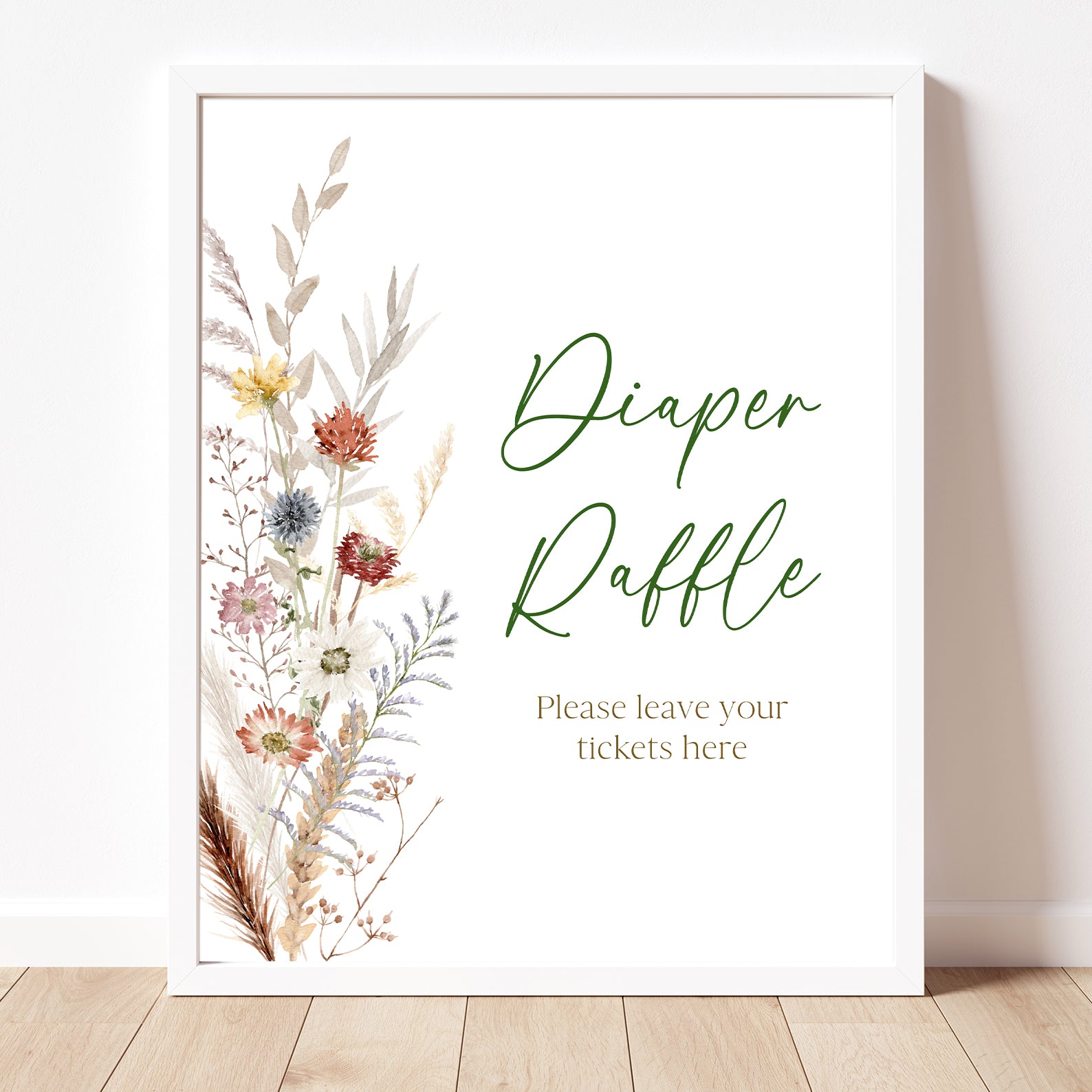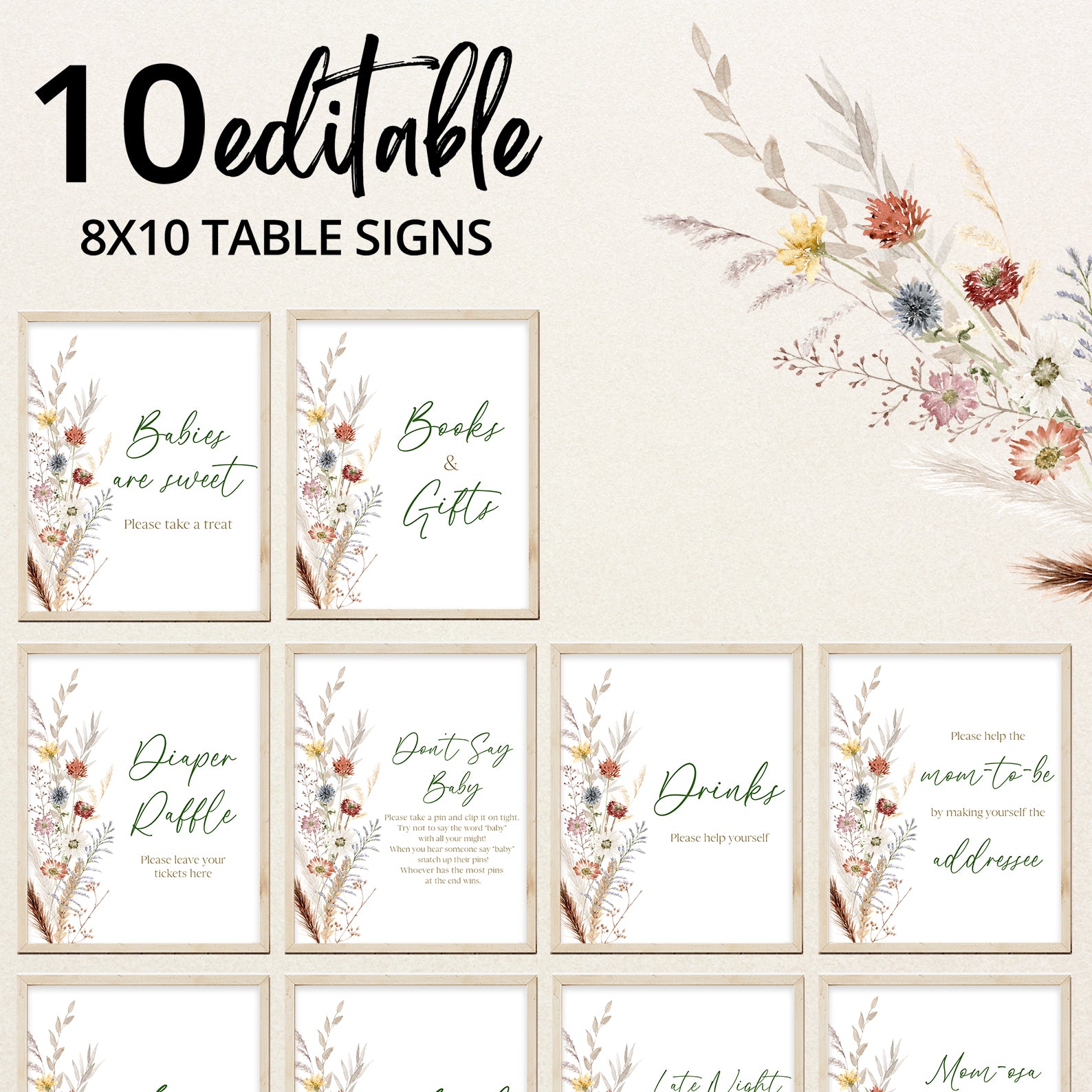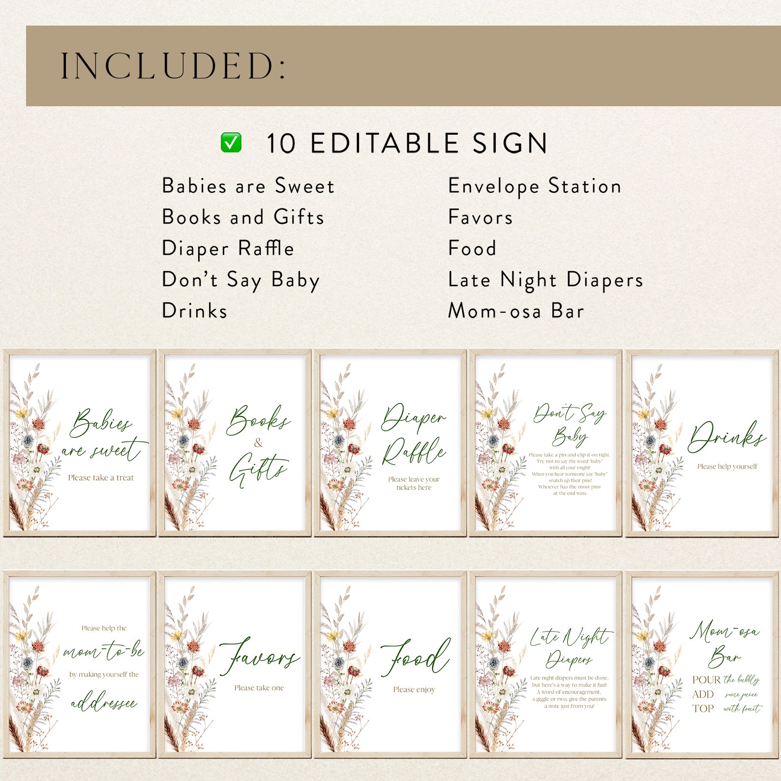 Add a touch of rustic elegance to your baby shower with this set of 10 editable table signs! Designed with soft boho wildflowers and warm earthy tones, each sign enhances your spring celebration. Includes Babies Are Sweet, Books & Gifts, Diaper Raffle, Don't Say Baby, Drinks, Envelope Station, Favors, Food, Late Night Diapers, and Mom-osa Bar. Perfect for a dreamy floral-themed event!