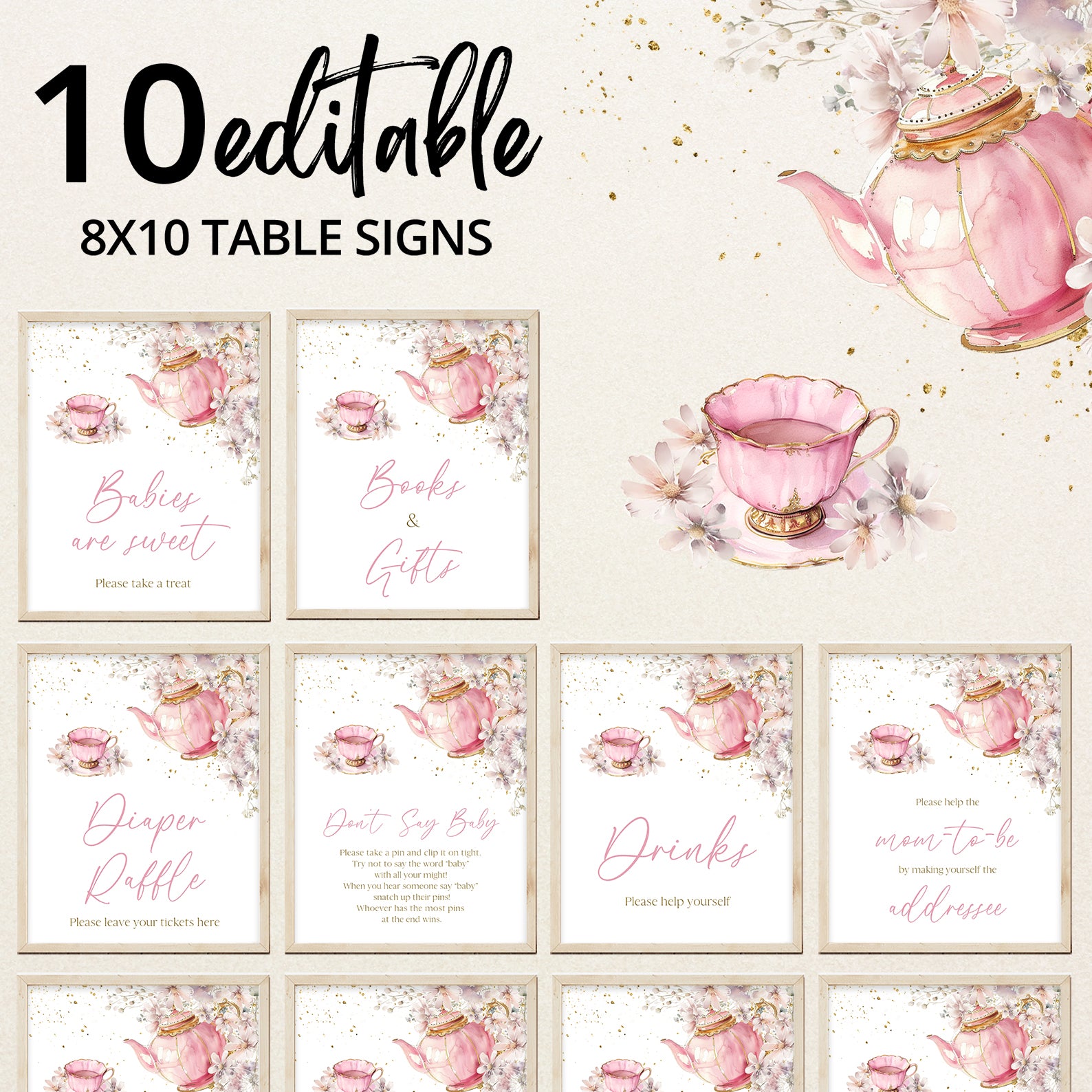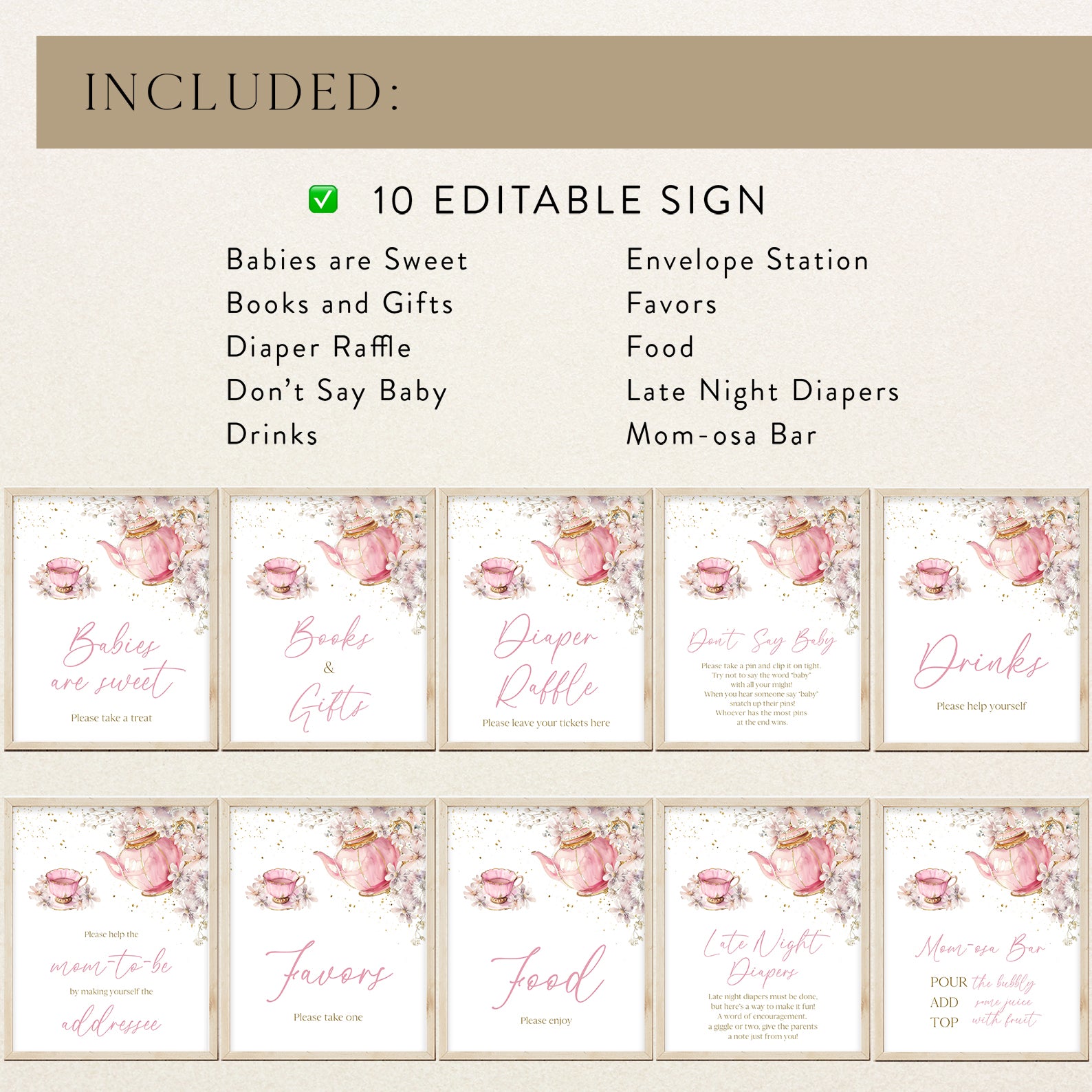 Add a touch of elegance to your baby shower with these charming tea party table signs! Featuring a delicate pink teapot pouring into a teacup, surrounded by wildflowers and gold accents, this set beautifully complements your celebration. Includes Babies Are Sweet, Books & Gifts, Diaper Raffle, Don't Say Baby, Drinks, Envelope Station, Favors, Food, Late Night Diapers, and Mom-osa Bar—perfect for creating a stylish and organized event!
