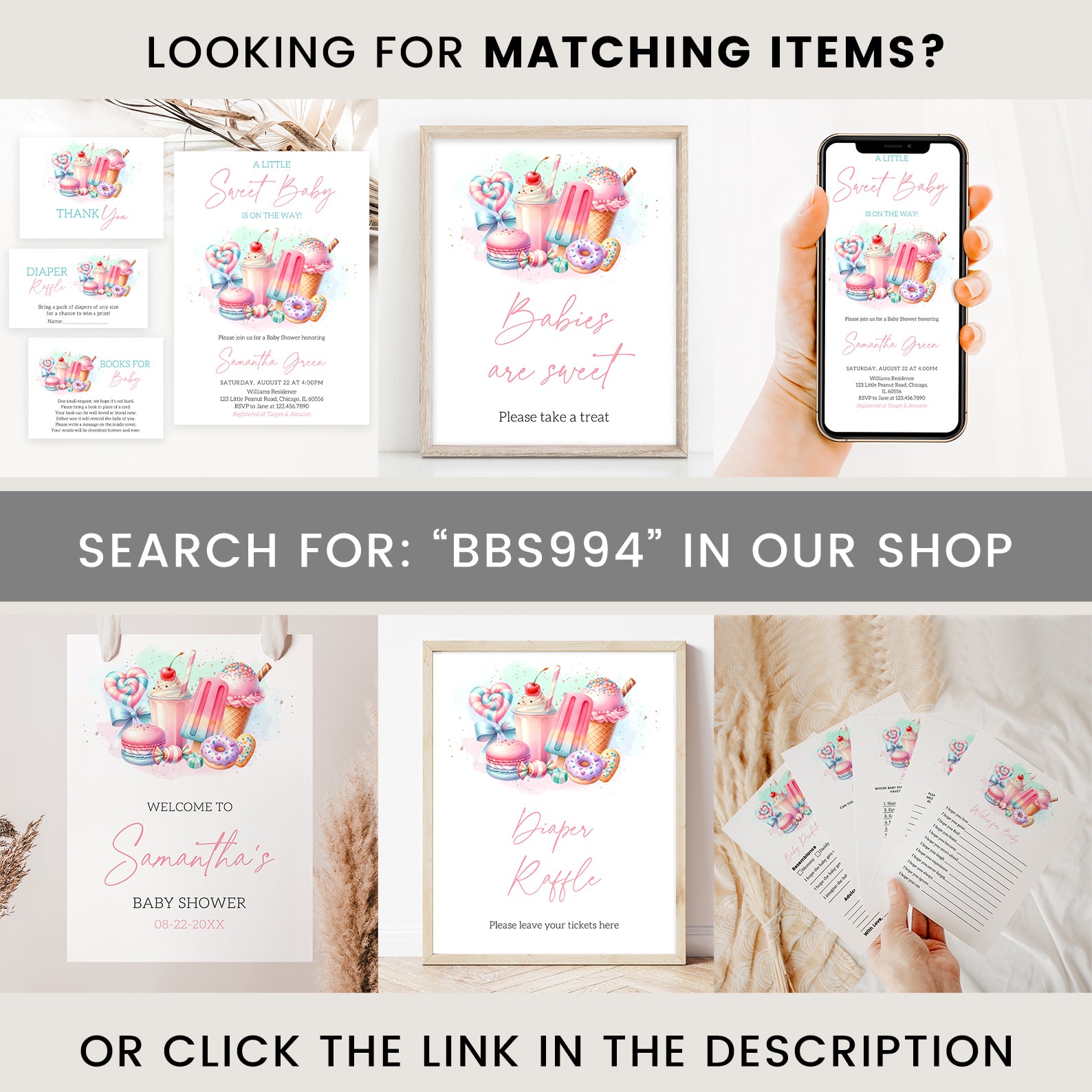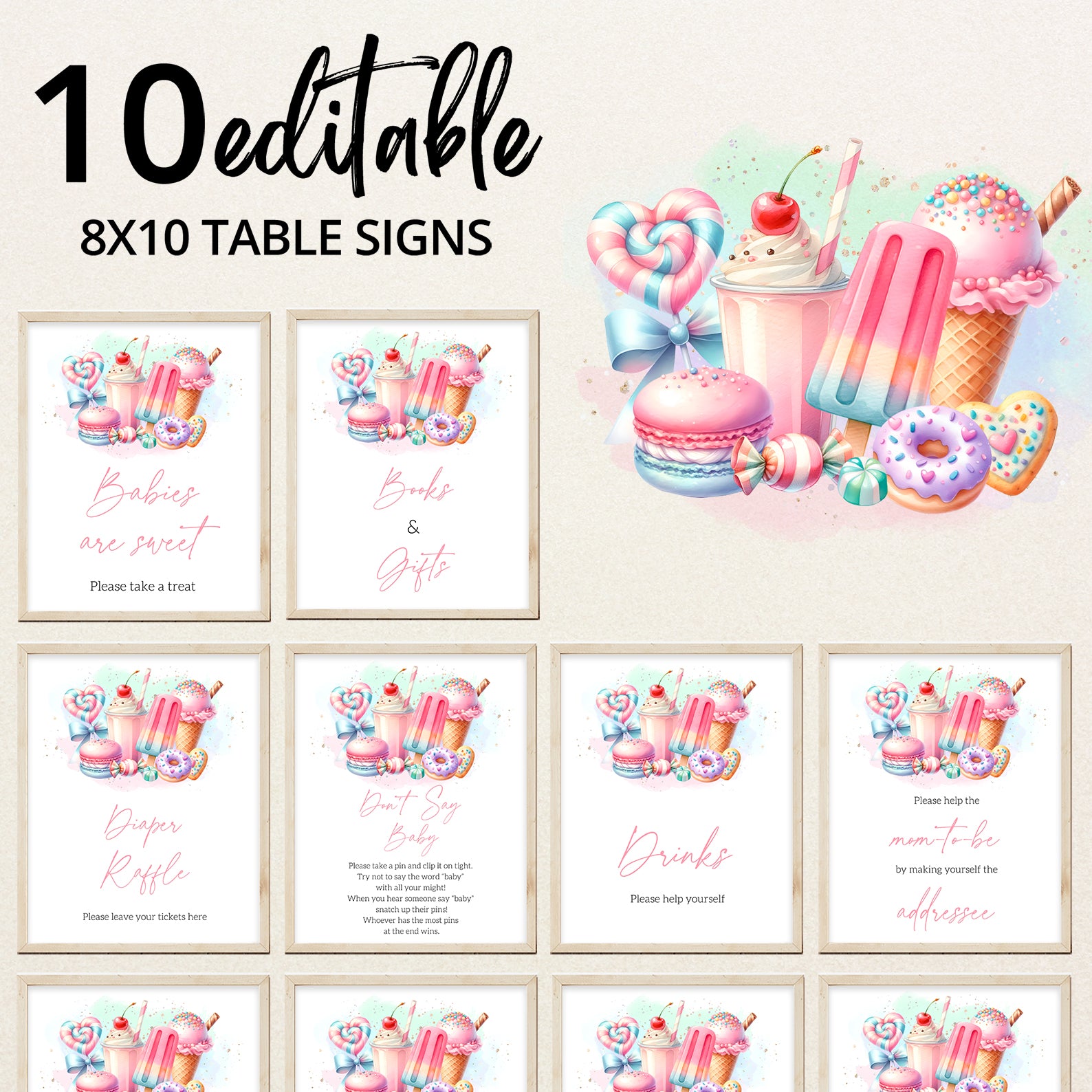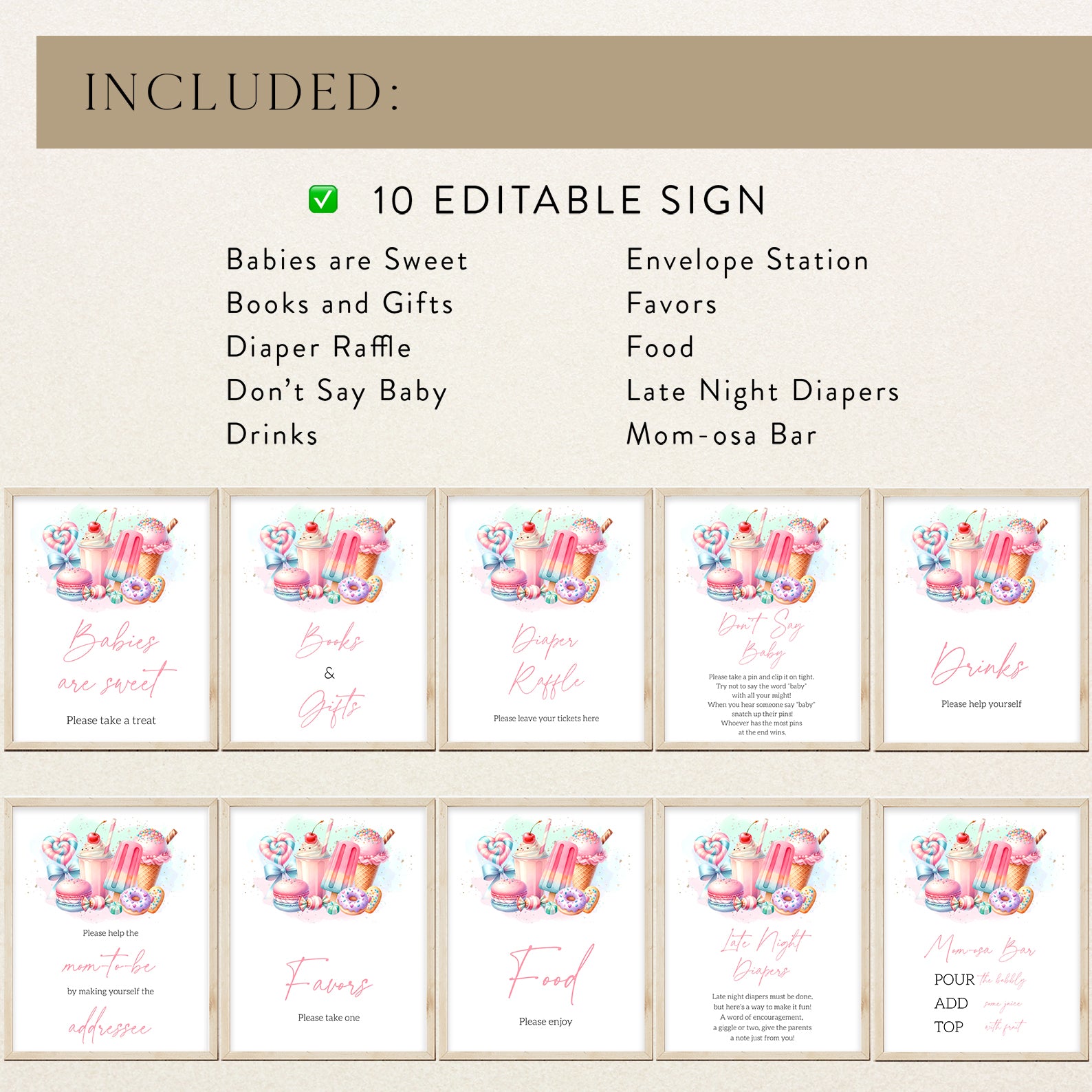 Enhance your baby shower with this set of 10 editable table signs, featuring Babies Are Sweet, Books and Gifts, Diaper Raffle, Don't Say Baby, Drinks, Envelope Station, Favors, Food, Late Night Diapers, and Mom-osa Bar. Designed with soft pastel hues, charming watercolor treats like macarons, cupcakes, and lollipops, and elegant gold accents, these signs add a stylish and whimsical touch to your celebration!