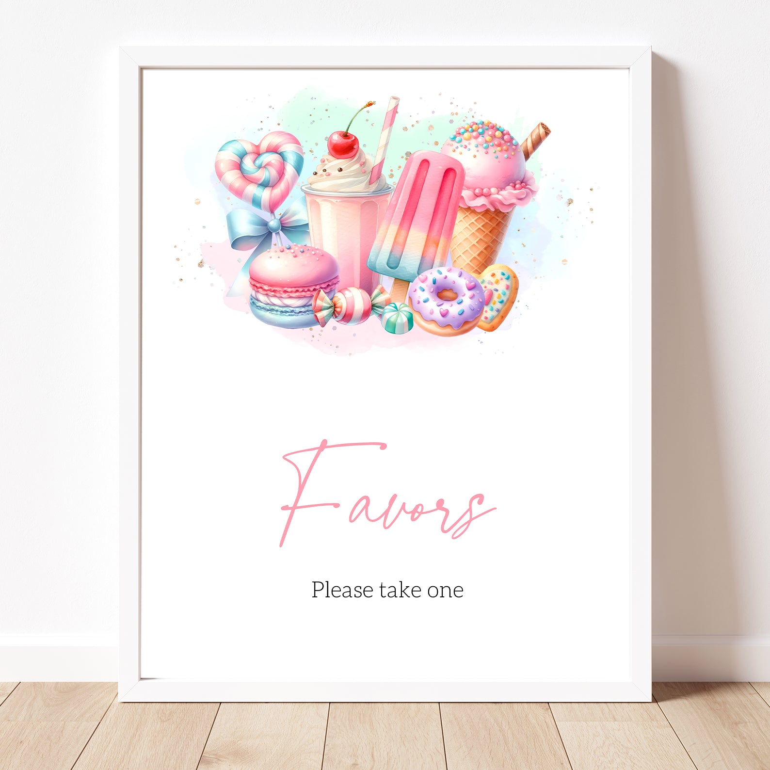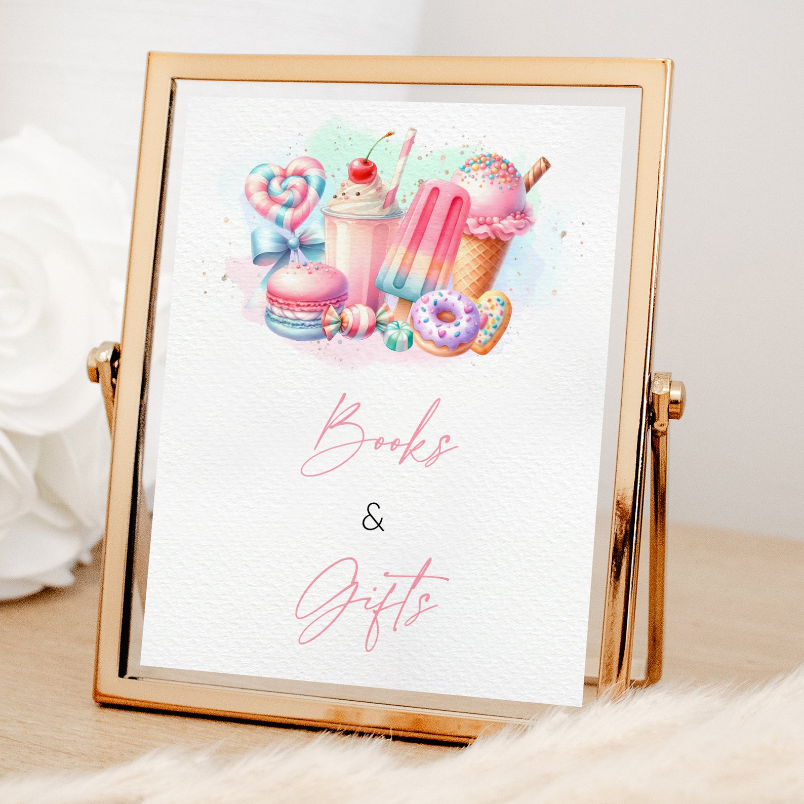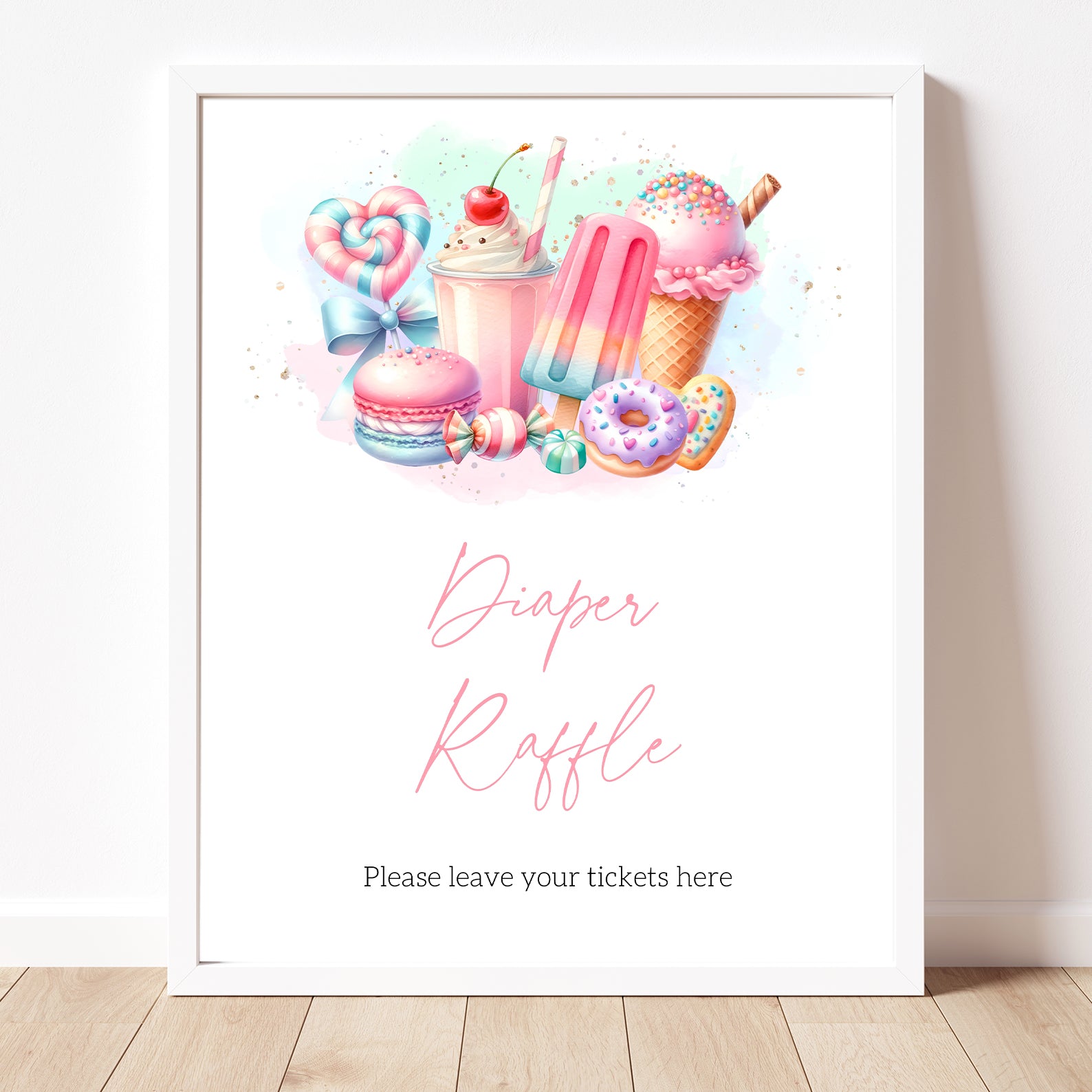 Enhance your baby shower with this set of 10 editable table signs, featuring Babies Are Sweet, Books and Gifts, Diaper Raffle, Don't Say Baby, Drinks, Envelope Station, Favors, Food, Late Night Diapers, and Mom-osa Bar. Designed with soft pastel hues, charming watercolor treats like macarons, cupcakes, and lollipops, and elegant gold accents, these signs add a stylish and whimsical touch to your celebration!