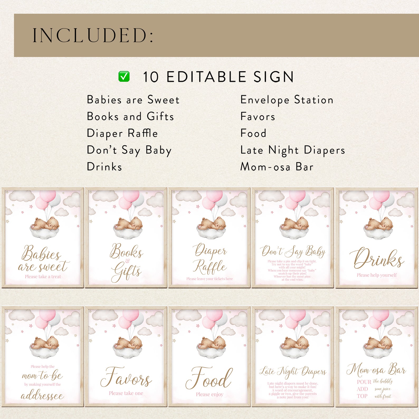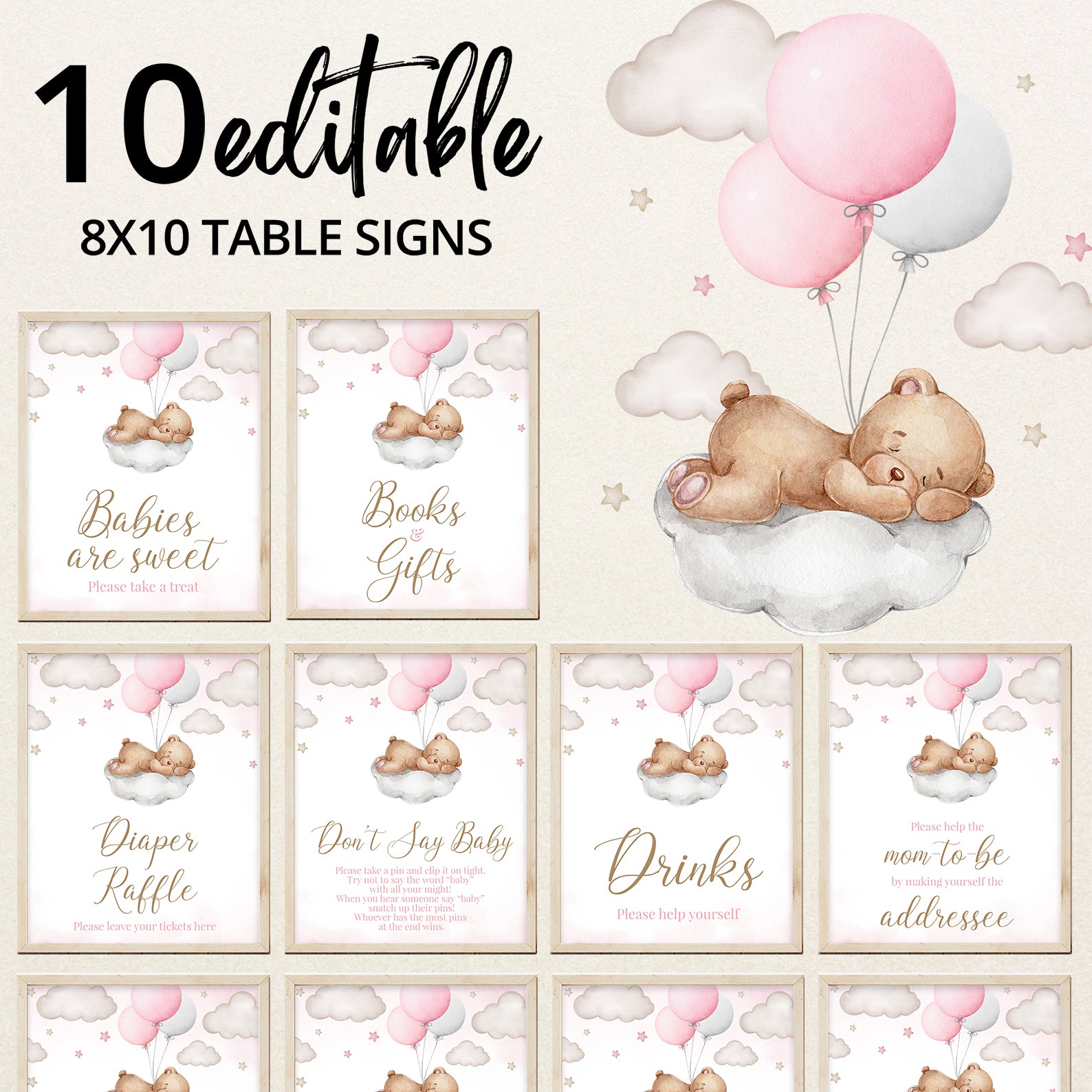 Create a coordinated and fun baby shower with our "We Can Bearly Wait" Table Sign Bundle! Includes ten editable signs: Babies Are Sweet, Books and Gifts, Diaper Raffle Sign, Don’t Say Baby, Drinks Sign, Envelope Station, Favors, Food Sign, Late Night Diapers, and Mom-osa Bar. Featuring a pink teddy bear theme with clouds and stars, these signs are perfect for guiding guests and adding charm to your celebration. Fully editable and easy to print!