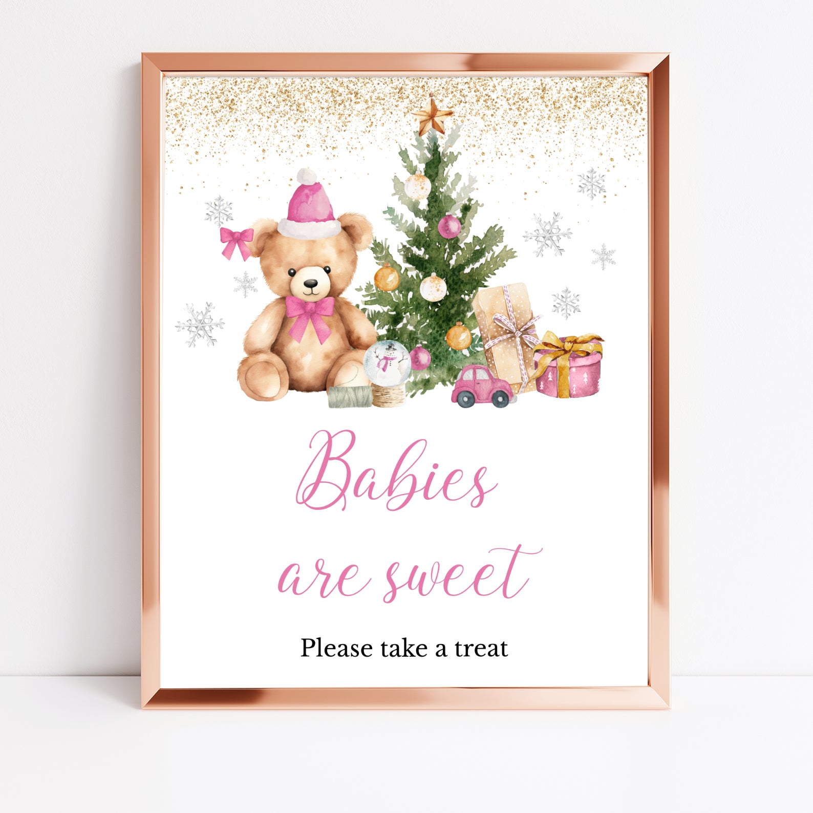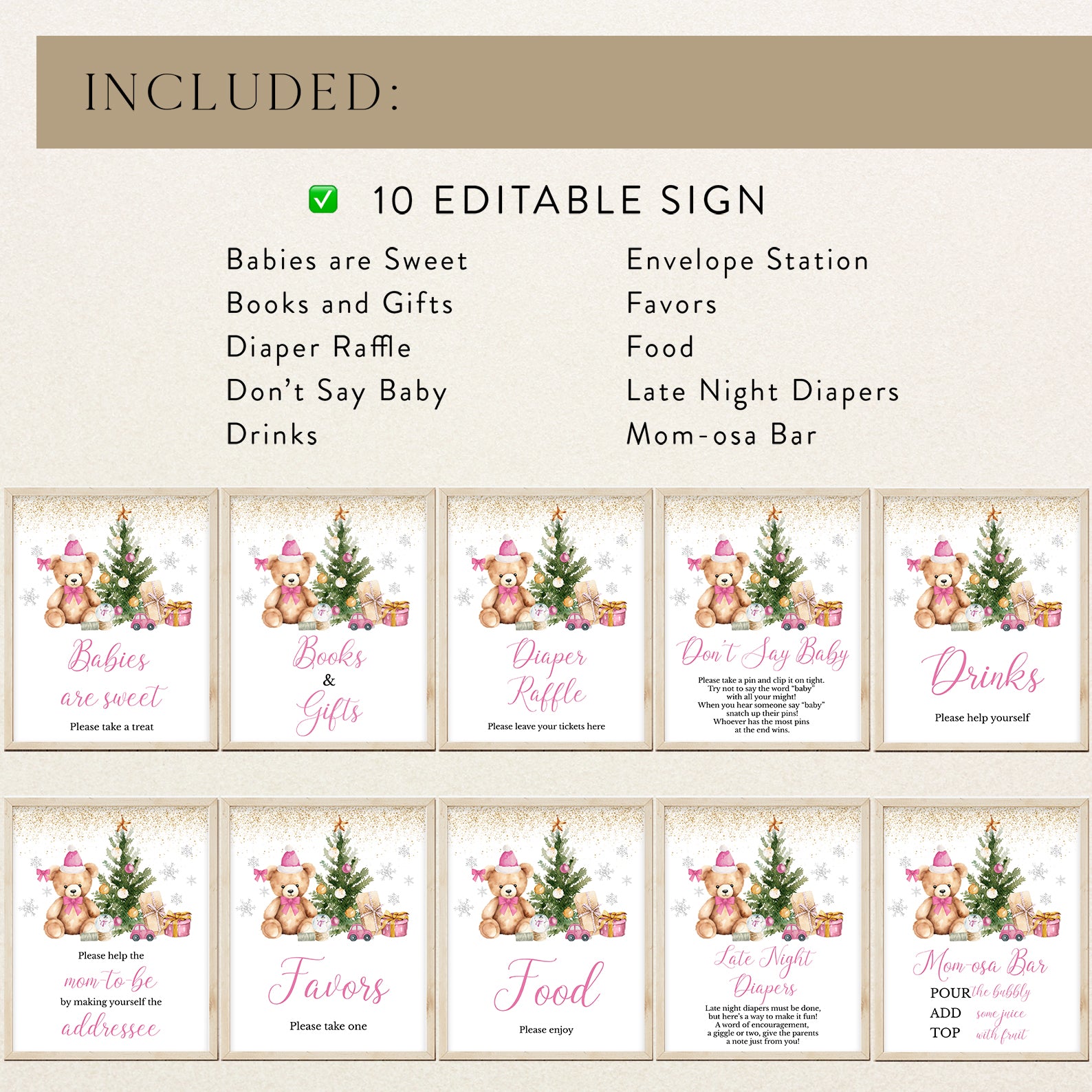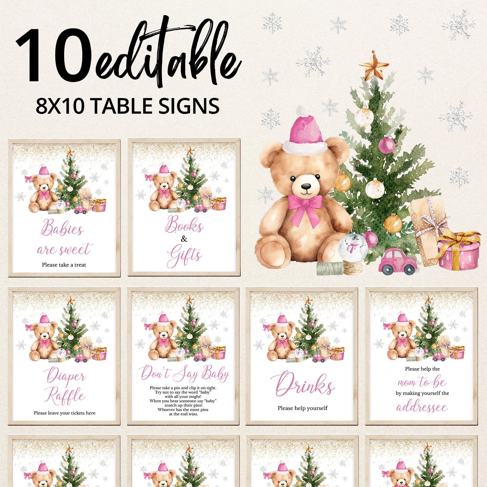 Add festive charm to your baby shower with this set of 10 editable table signs, featuring a cuddly teddy bear in a Santa hat, a cheerful Christmas tree, sparkling gold glitter accents, and whimsical silver snowflakes. Includes Babies Are Sweet, Books and Gifts, Diaper Raffle, Don’t Say Baby, Drinks, Envelope Station, Favors, Food, Late Night Diapers, and Mom-osa Bar. Perfect for creating a cozy, coordinated winter celebration.