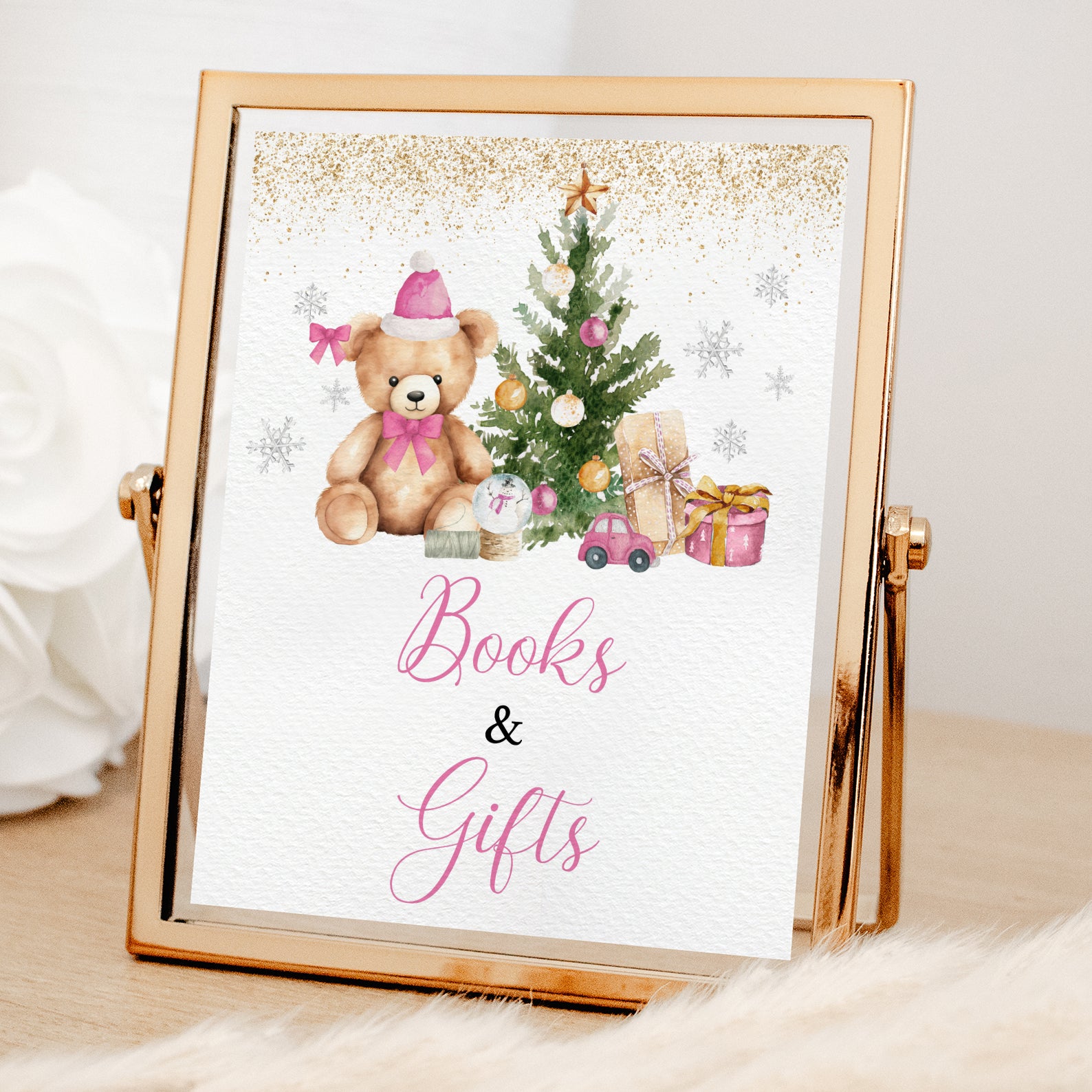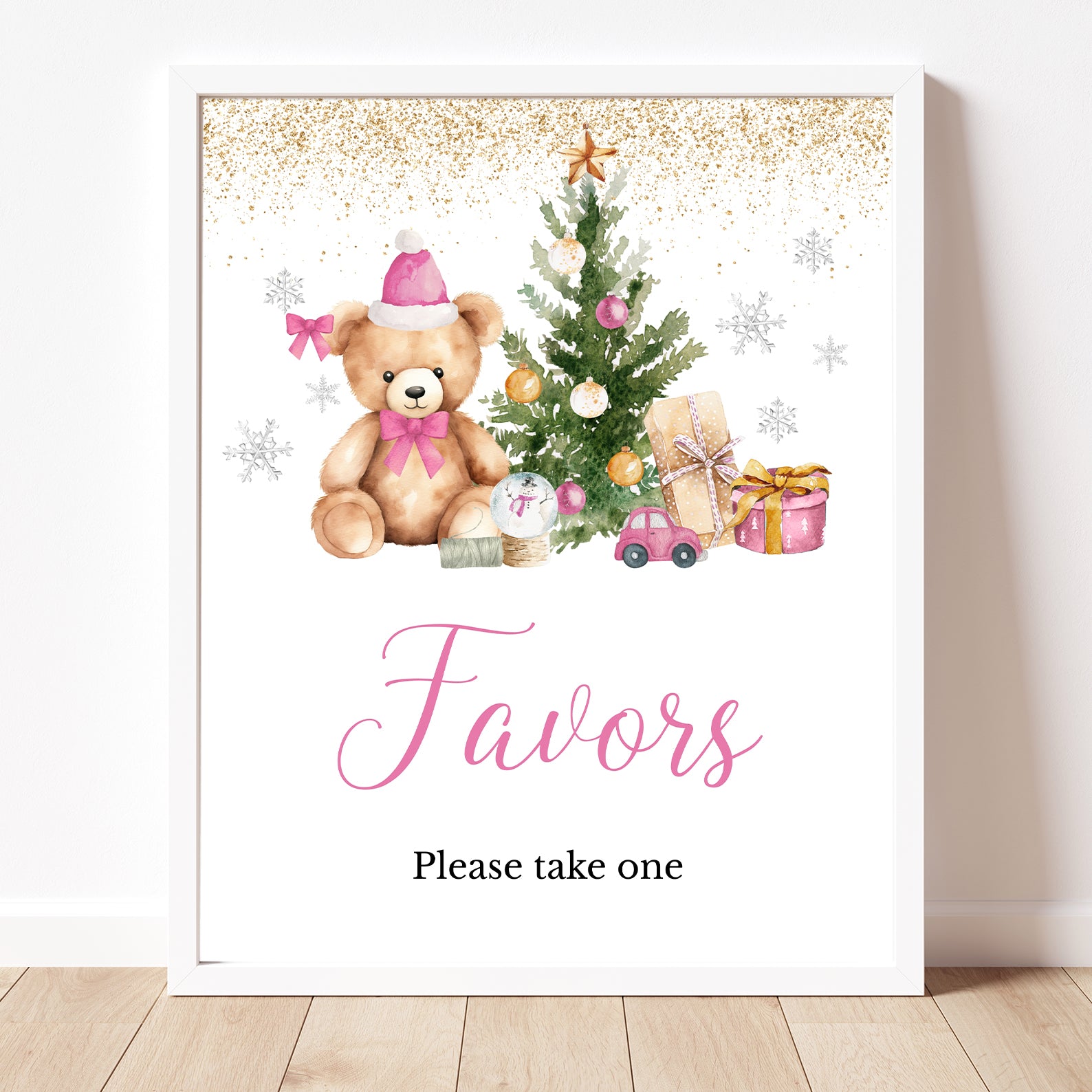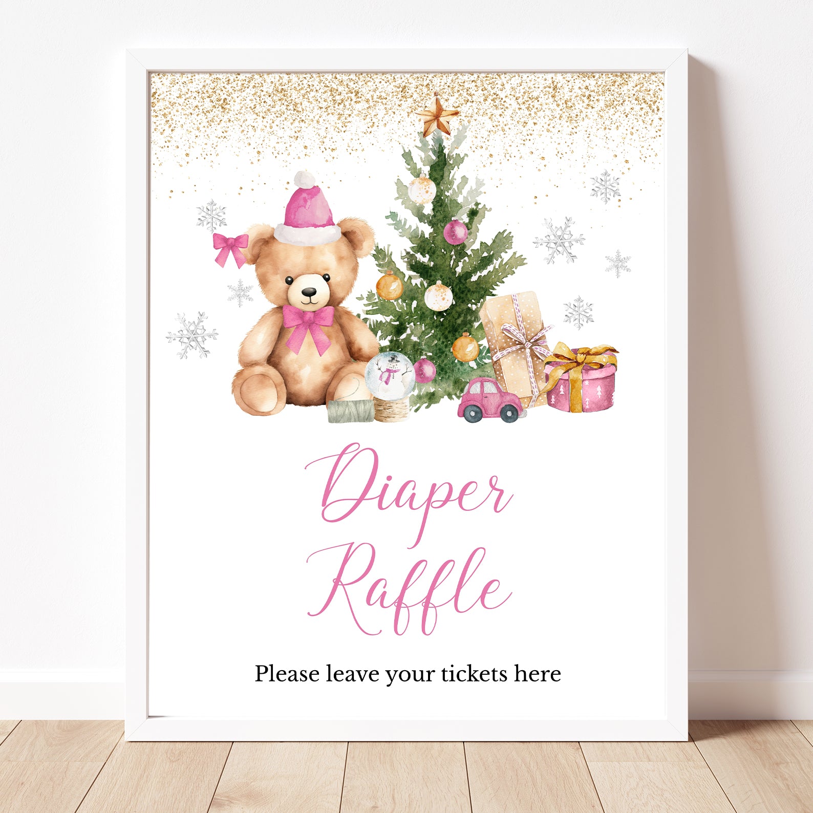 Add festive charm to your baby shower with this set of 10 editable table signs, featuring a cuddly teddy bear in a Santa hat, a cheerful Christmas tree, sparkling gold glitter accents, and whimsical silver snowflakes. Includes Babies Are Sweet, Books and Gifts, Diaper Raffle, Don’t Say Baby, Drinks, Envelope Station, Favors, Food, Late Night Diapers, and Mom-osa Bar. Perfect for creating a cozy, coordinated winter celebration.