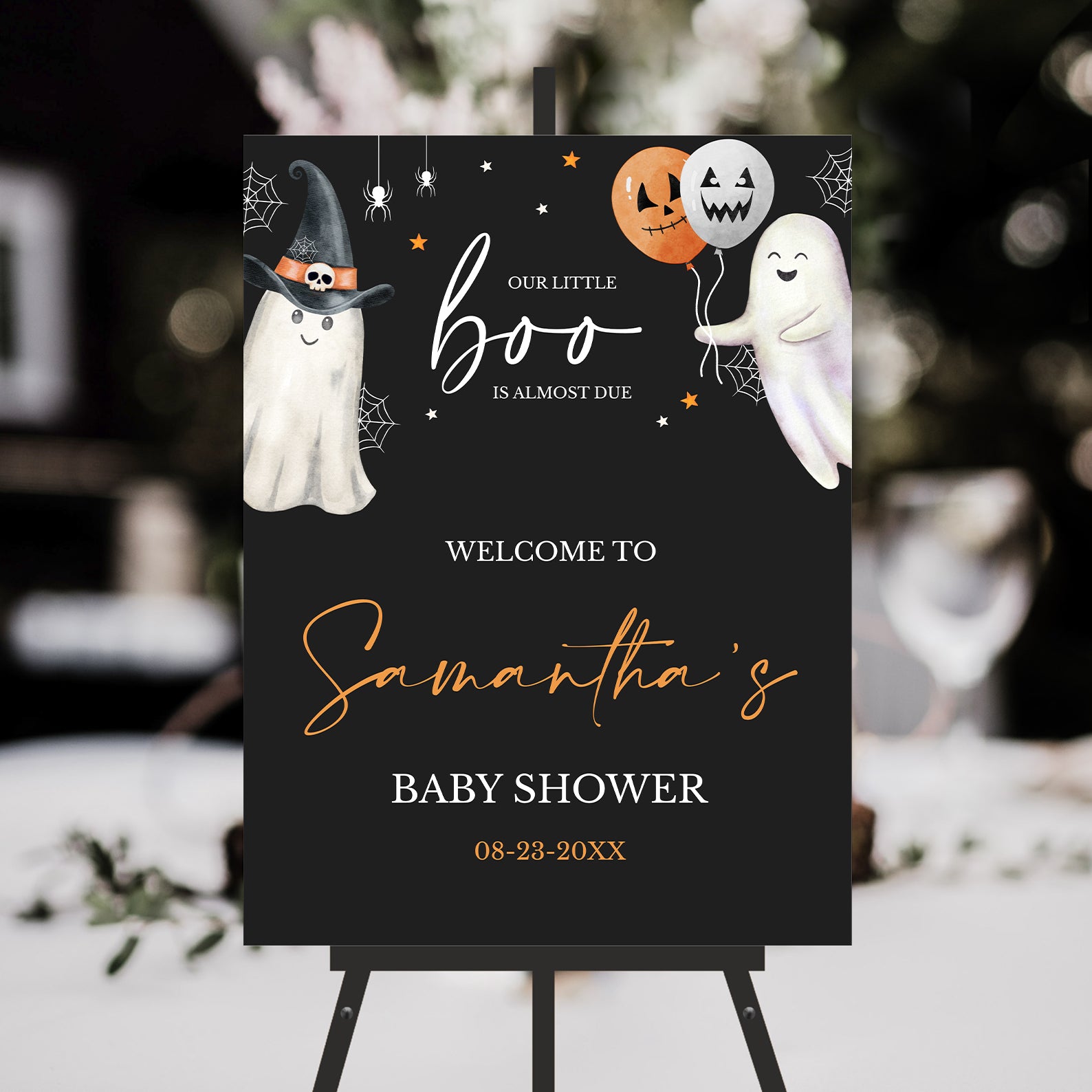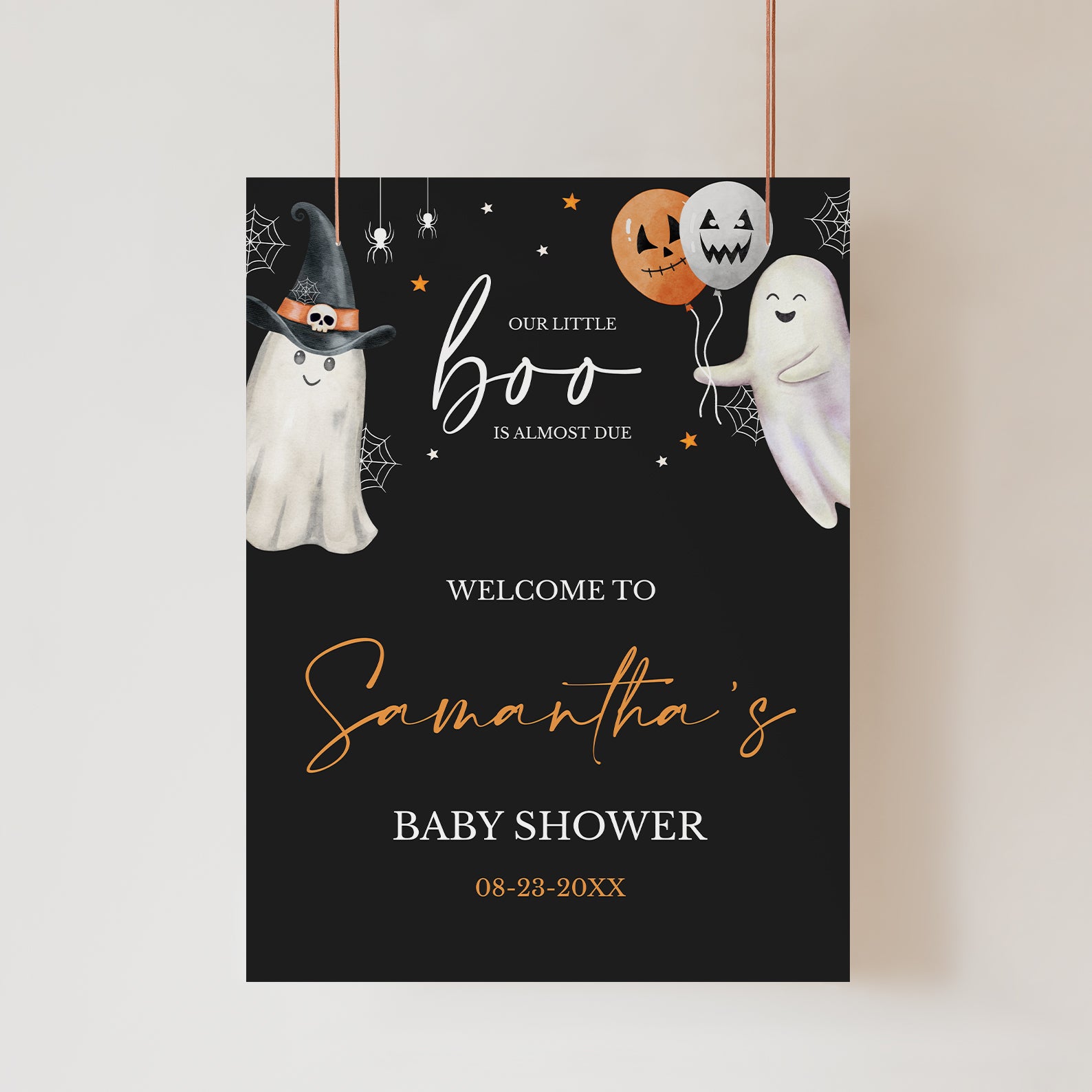 - Purchase this A Little Boo Is Due Halloween Ghost Baby Shower Black Welcome Sign template