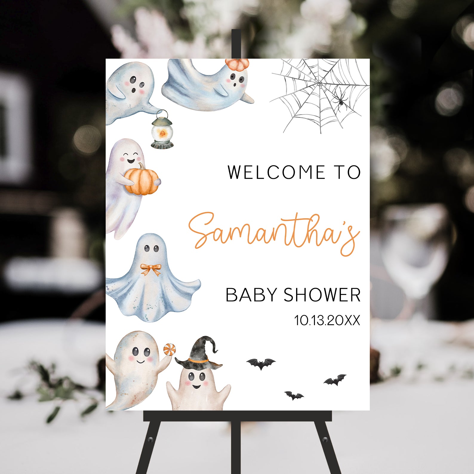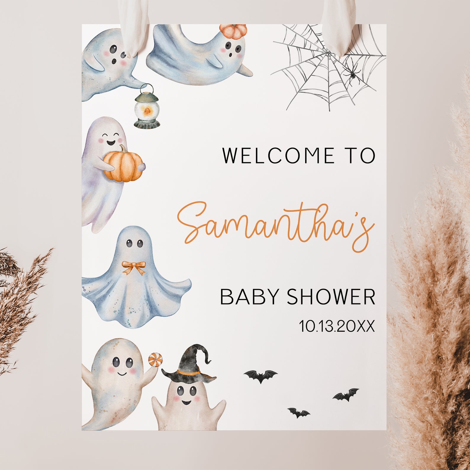 - Purchase this Cute Ghost Baby Shower Welcome Sign: A Little Boo template