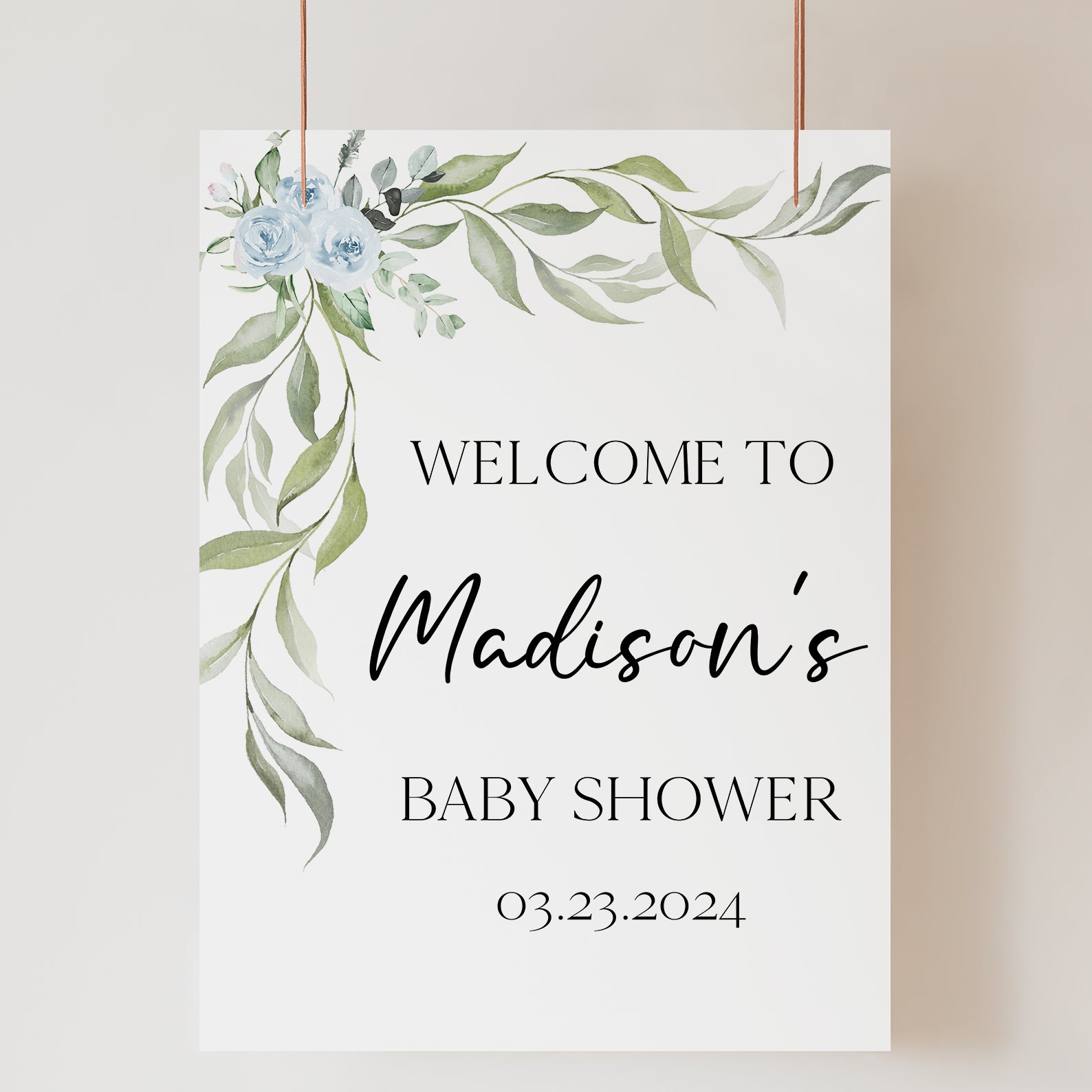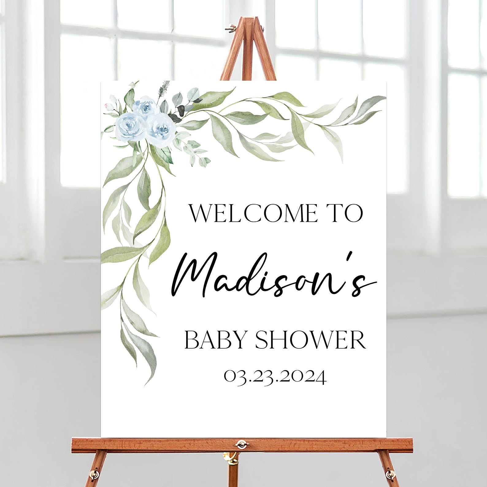 - Purchase this Minimalist Baby Shower Welcome Sign with Blue Roses & Greenery template