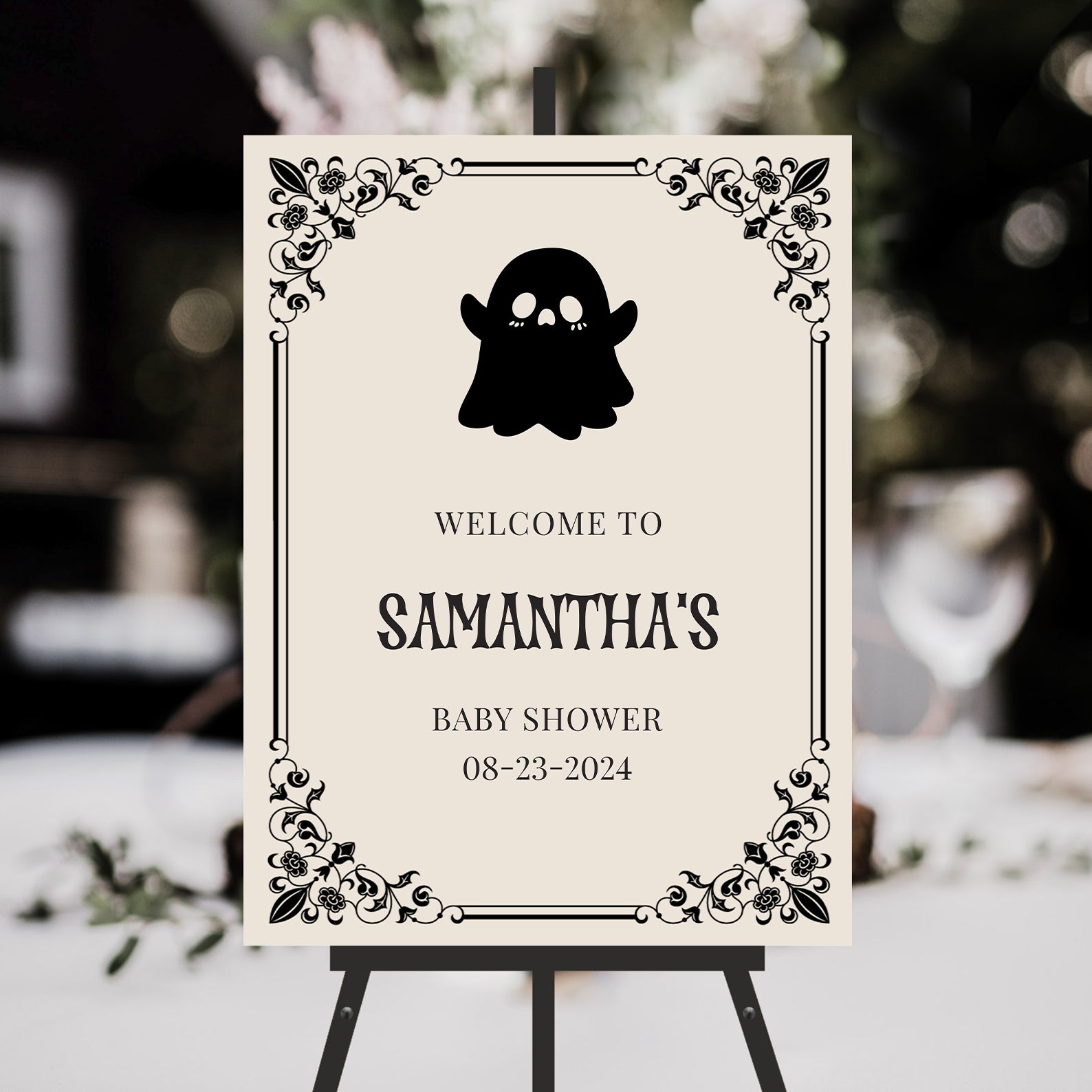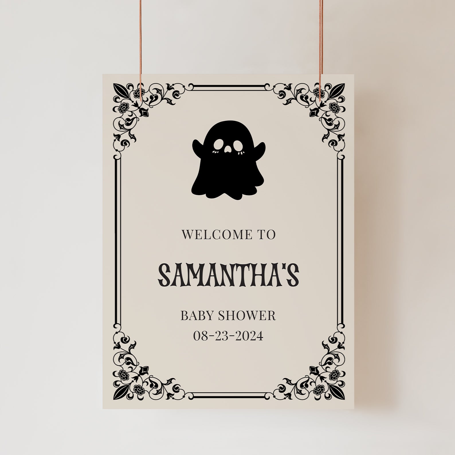 Set the tone for your spooky-chic baby shower with this elegant Halloween welcome sign! Featuring a bone sheen background and a detailed floral gothic border, the design is topped with a playful black ghost for just the right mix of eerie and adorable. Perfect for greeting guests, this editable sign adds a touch of haunting charm to your décor while celebrating your little boo on the way.