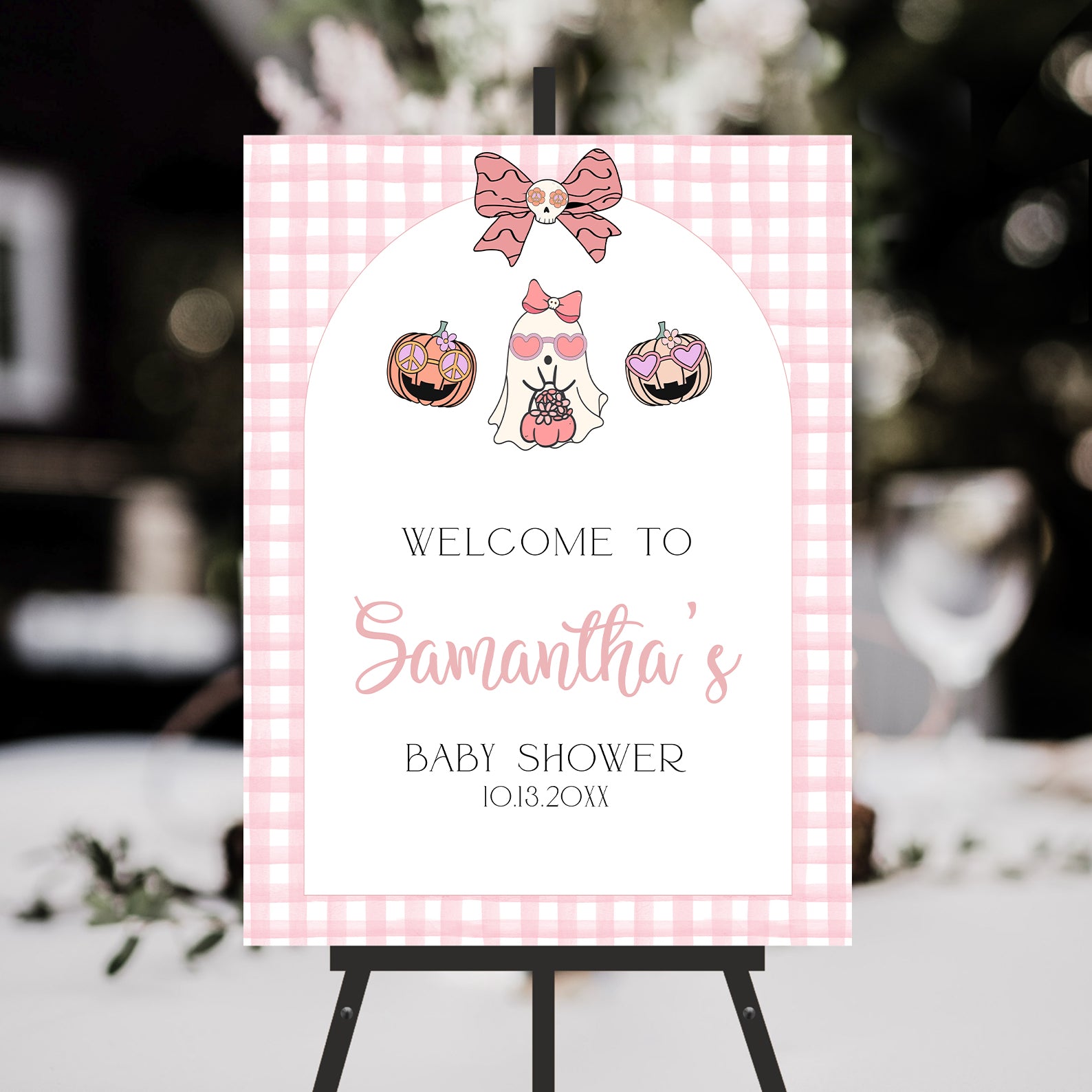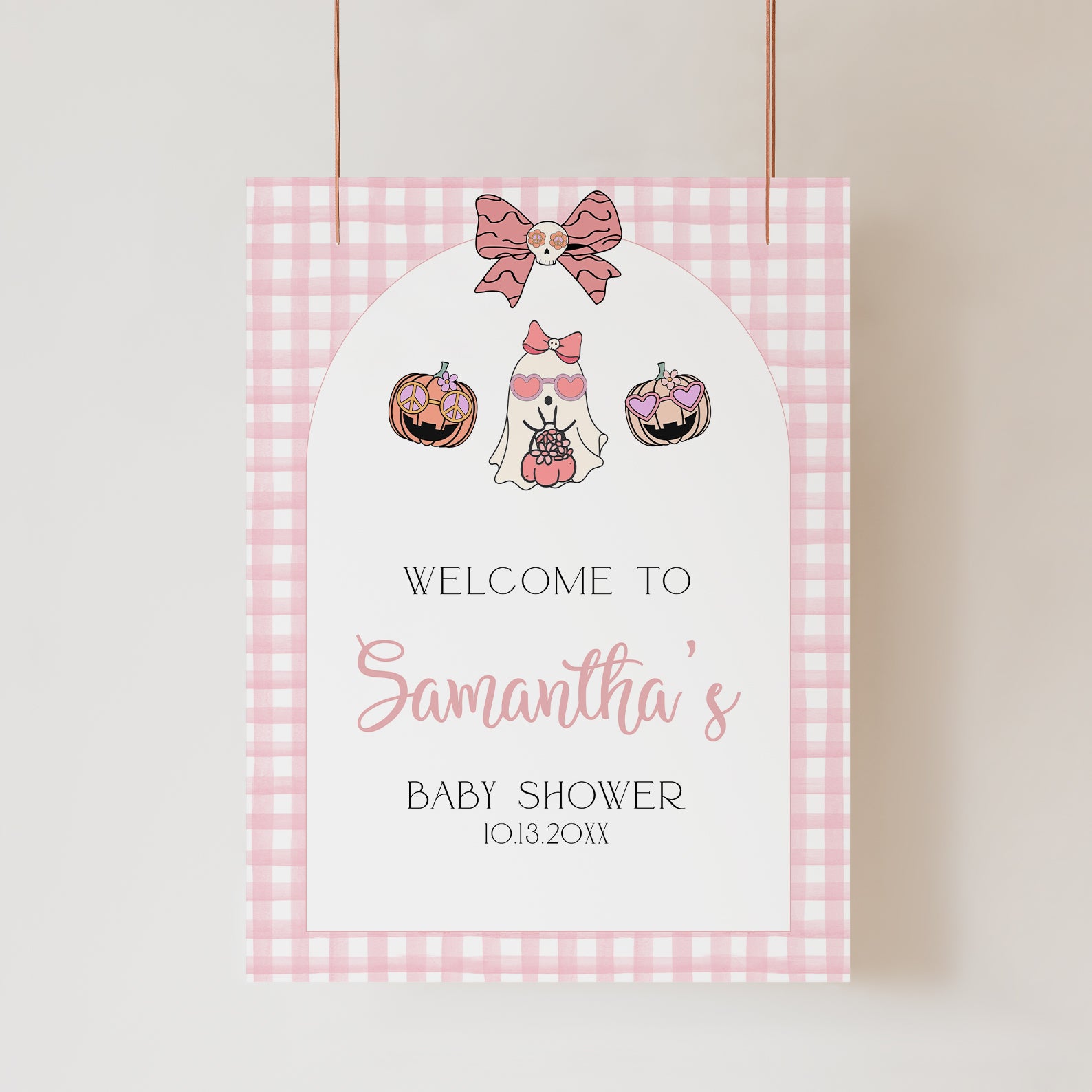 Pink Halloween Baby Shower Welcome Sign with Cute Ghost & Pumpkins