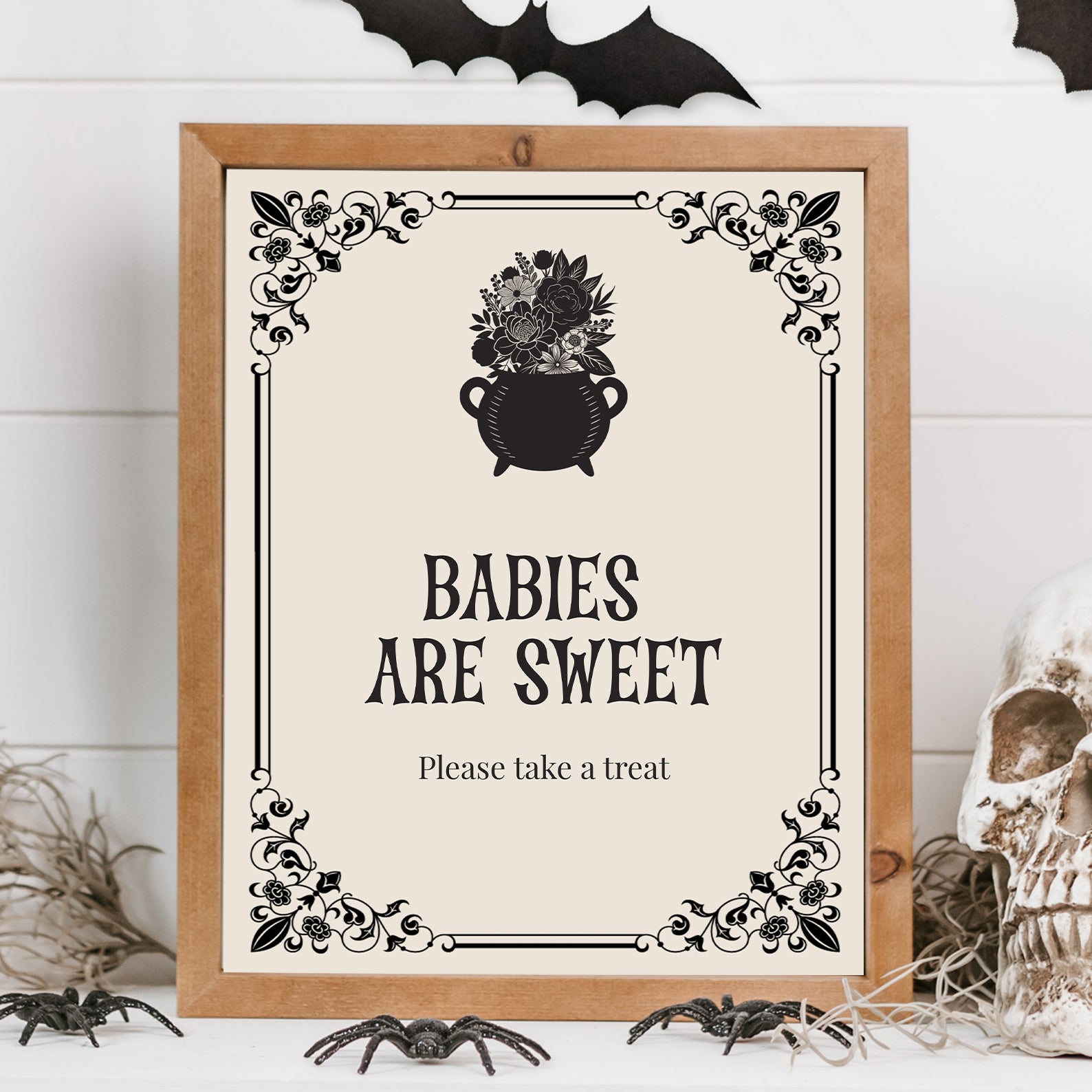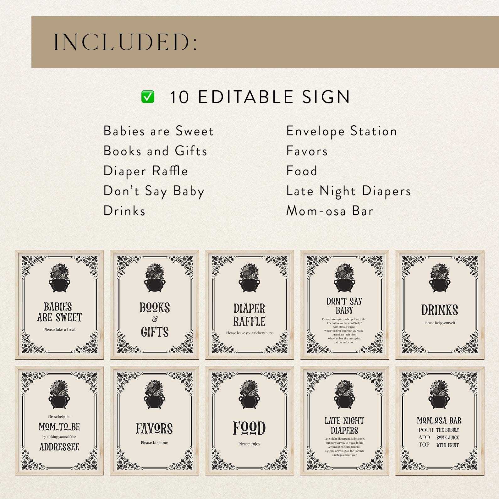 Add a touch of gothic elegance to your baby shower with this set of ten editable table signs. Designed with a bone sheen background and framed by an intricate floral gothic border, each sign features spooky-sweet elements that match your Halloween theme. From “Babies Are Sweet” to “Mom-osa Bar,” these stylish labels guide guests while adding cohesive charm to your event’s décor. Perfect for a baby is brewing celebration!