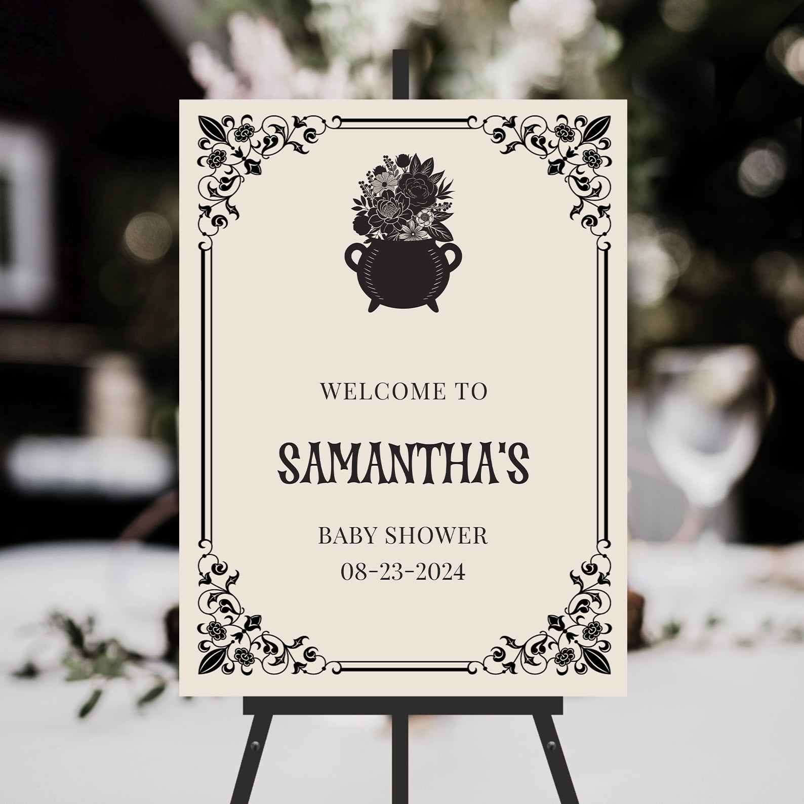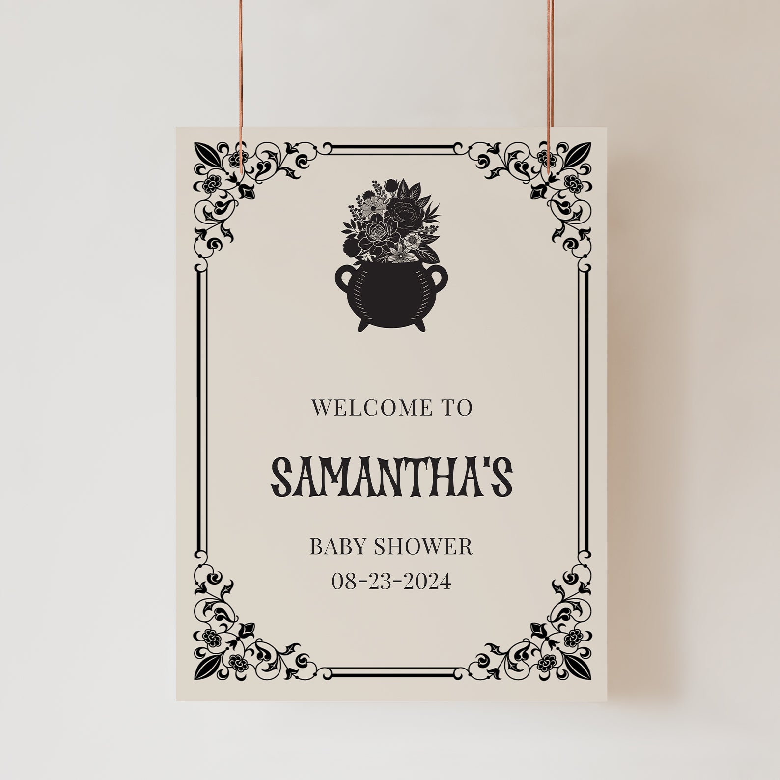 Welcome your guests in spellbinding style with this Halloween baby shower welcome sign! Designed on a bone sheen background and framed with an elegant floral gothic border, it features a striking black cauldron overflowing with dark blooms at the top. This enchanting design blends spooky charm with refined elegance making it the perfect entrance piece for celebrating your little one brewing on the way. A bewitching start to your hauntingly sweet gathering!
