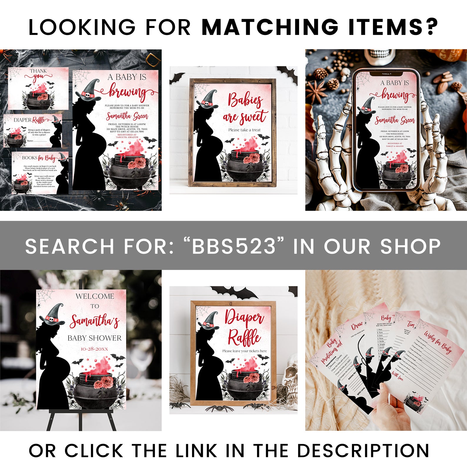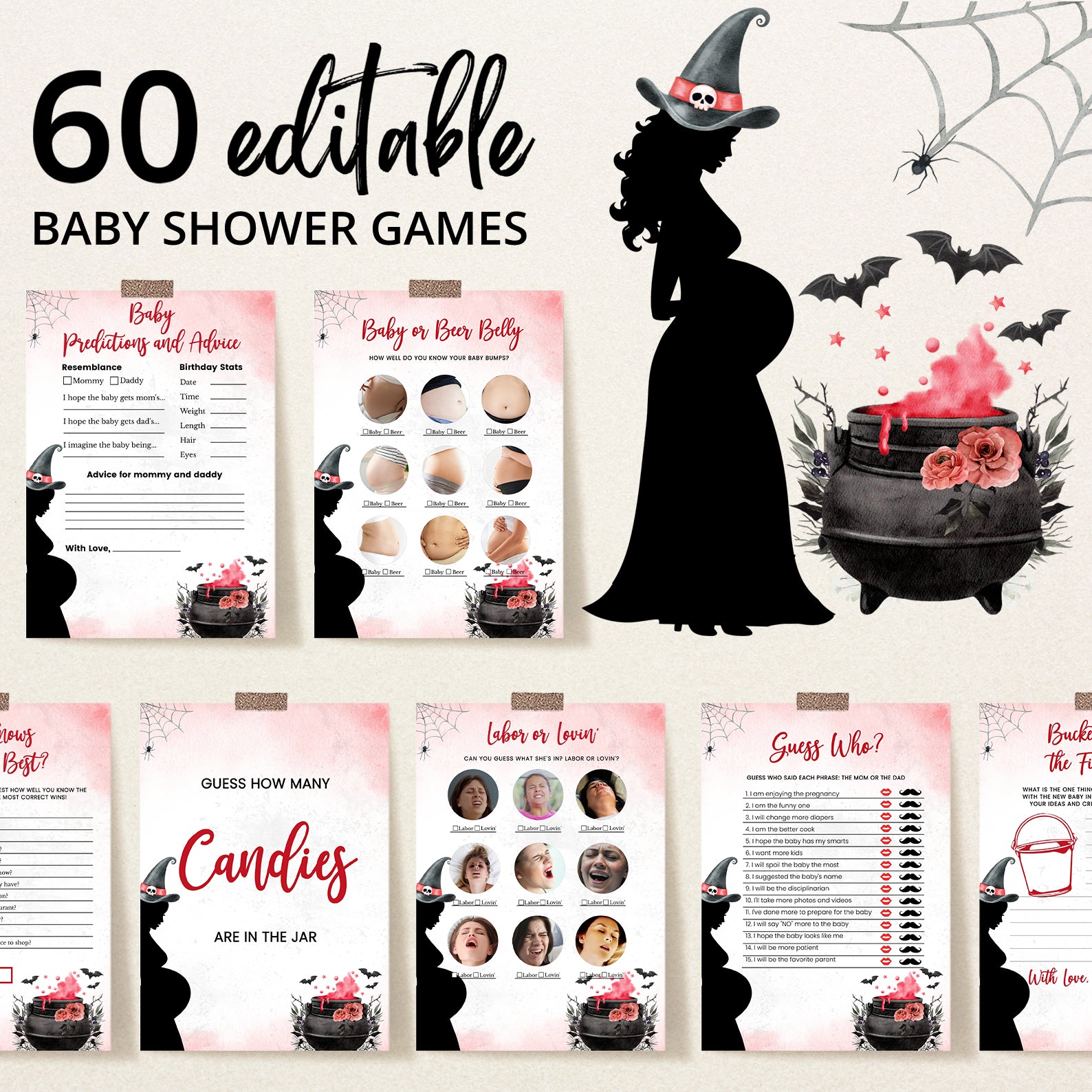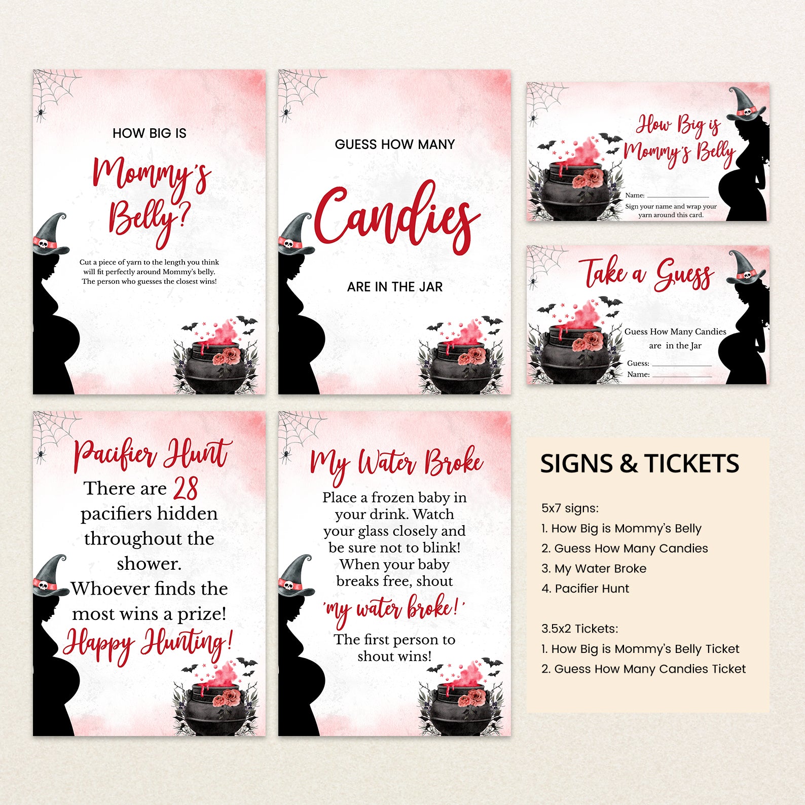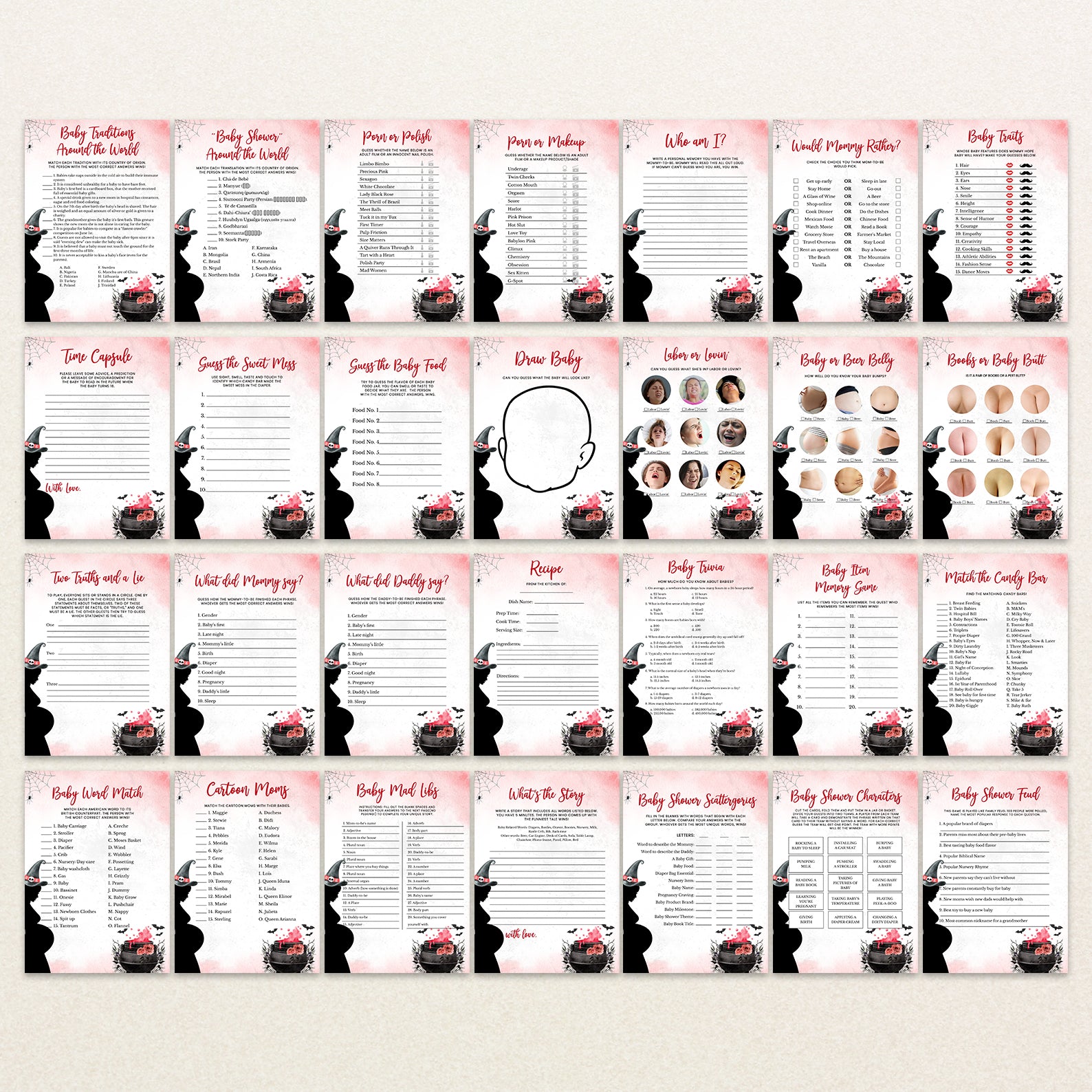 Get ready to conjure up some fun with our “Baby is Brewing” Game Bundle! This enchanting set includes editable games, perfect for adding a touch of Halloween magic to your baby shower. Each game features a whimsical design with a charming pregnant witch brewing a potion in her cauldron, surrounded by vibrant roses, playful spiders, and flying bats. Available in a range of colors like red, green, purple, orange, blue, and pink, these games create a spellbinding atmosphere for your celebration. Perfect for setting a fun and festive tone, this bundle ensures your event is filled with magical moments and delightful surprises!