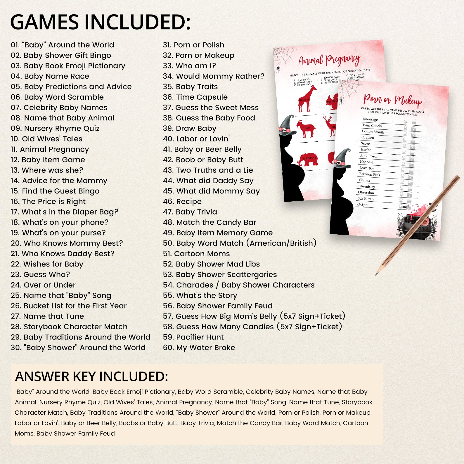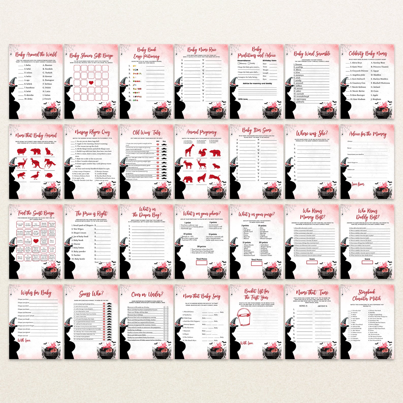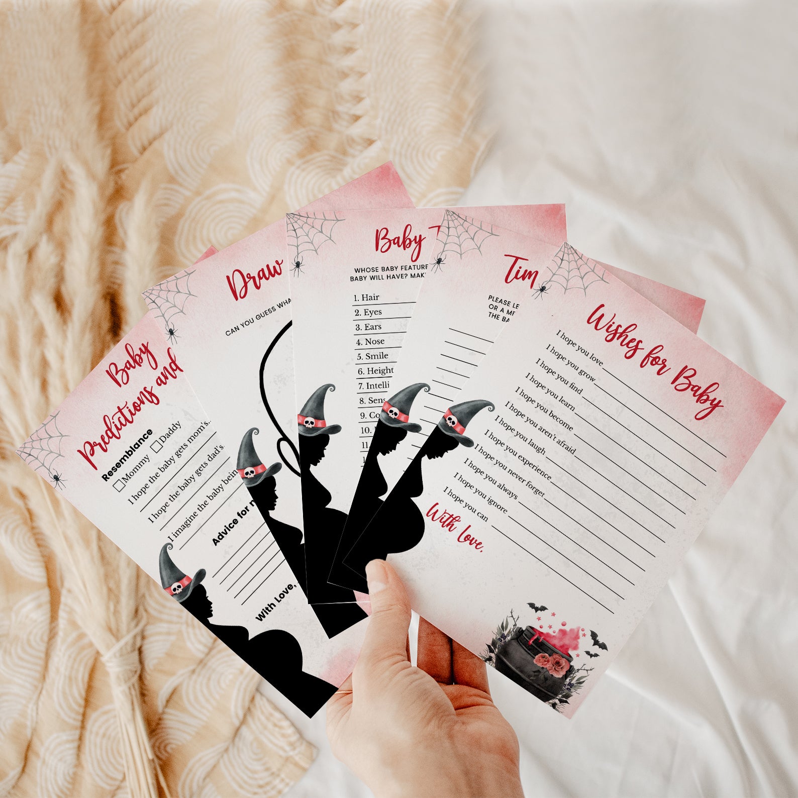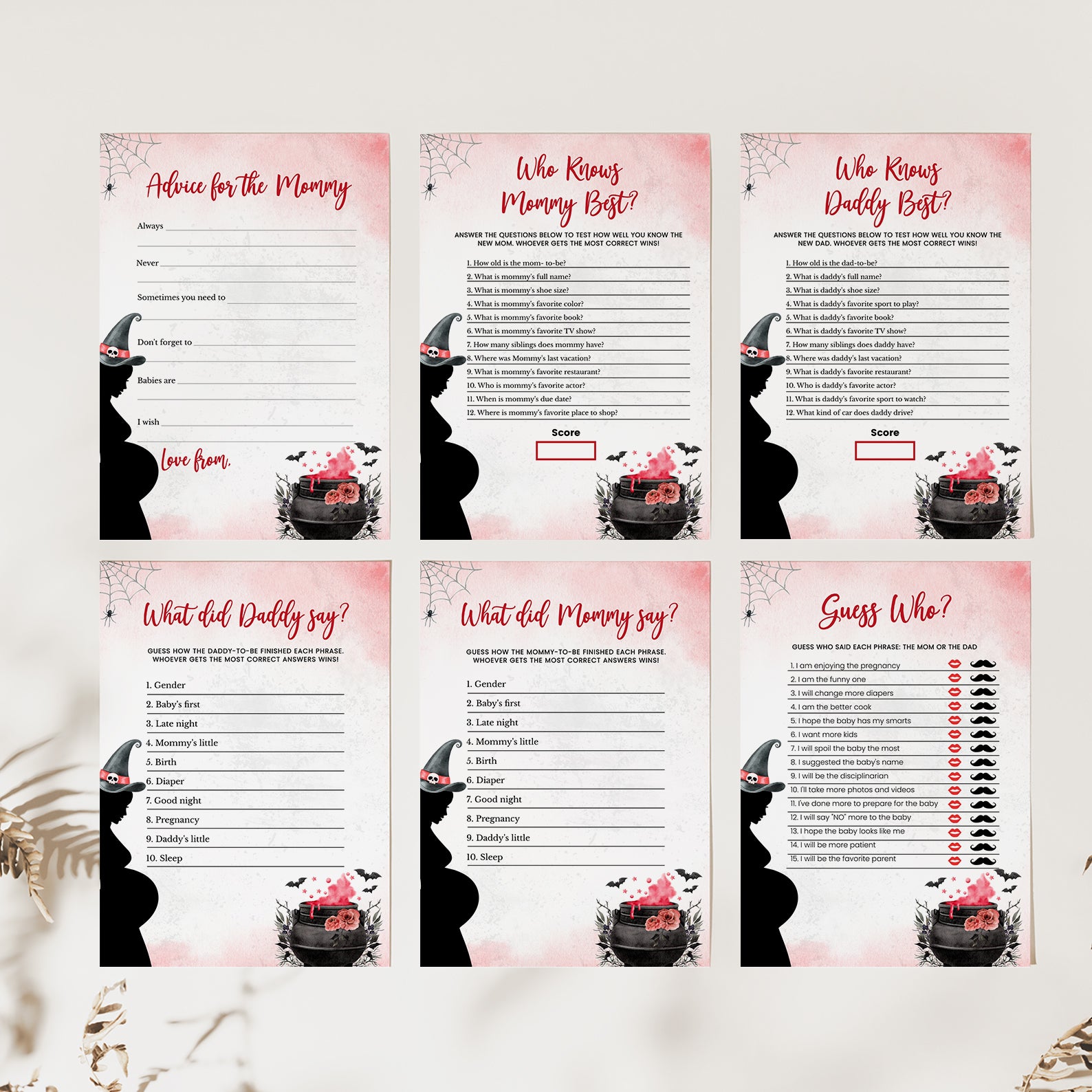 Get ready to conjure up some fun with our “Baby is Brewing” Game Bundle! This enchanting set includes editable games, perfect for adding a touch of Halloween magic to your baby shower. Each game features a whimsical design with a charming pregnant witch brewing a potion in her cauldron, surrounded by vibrant roses, playful spiders, and flying bats. Available in a range of colors like red, green, purple, orange, blue, and pink, these games create a spellbinding atmosphere for your celebration. Perfect for setting a fun and festive tone, this bundle ensures your event is filled with magical moments and delightful surprises!