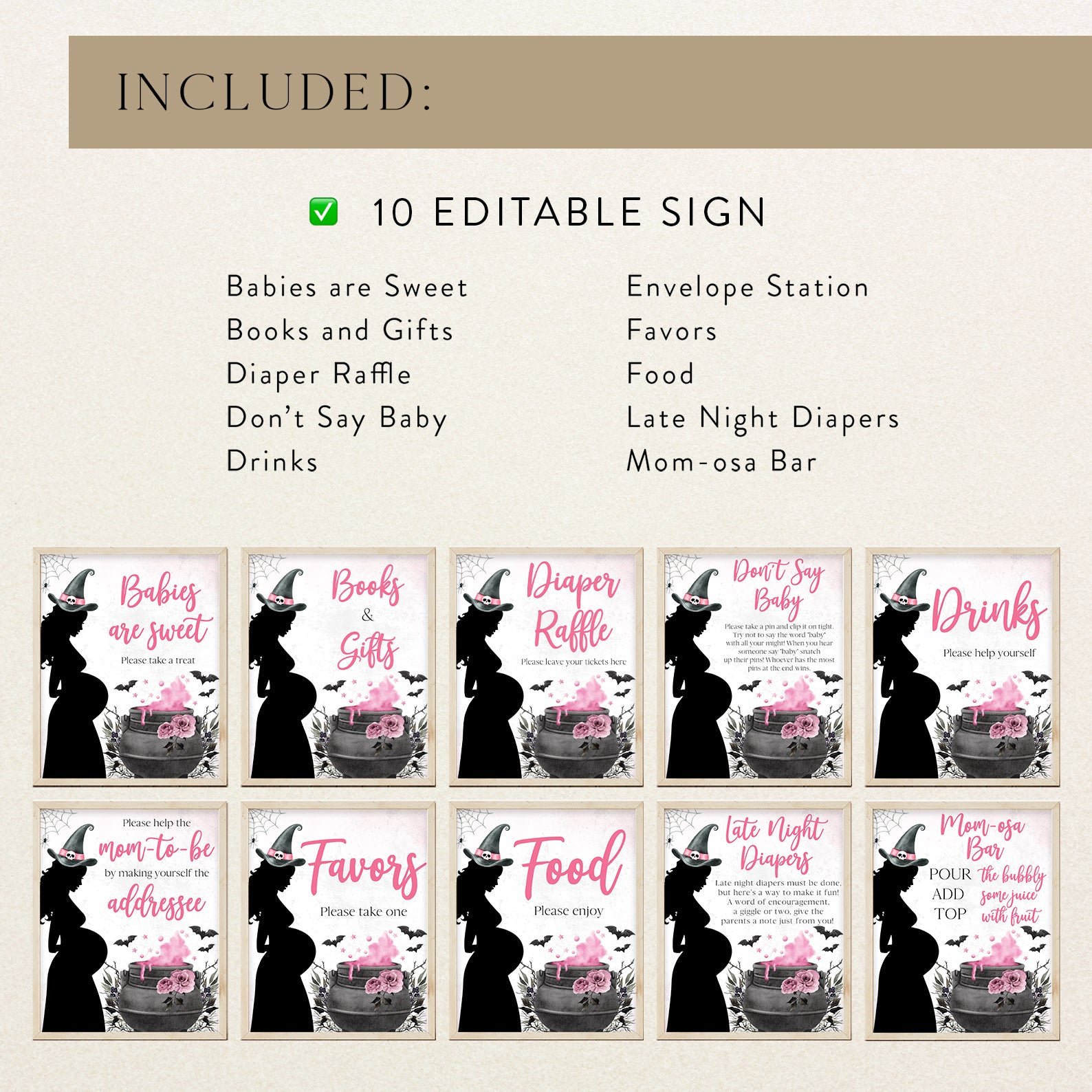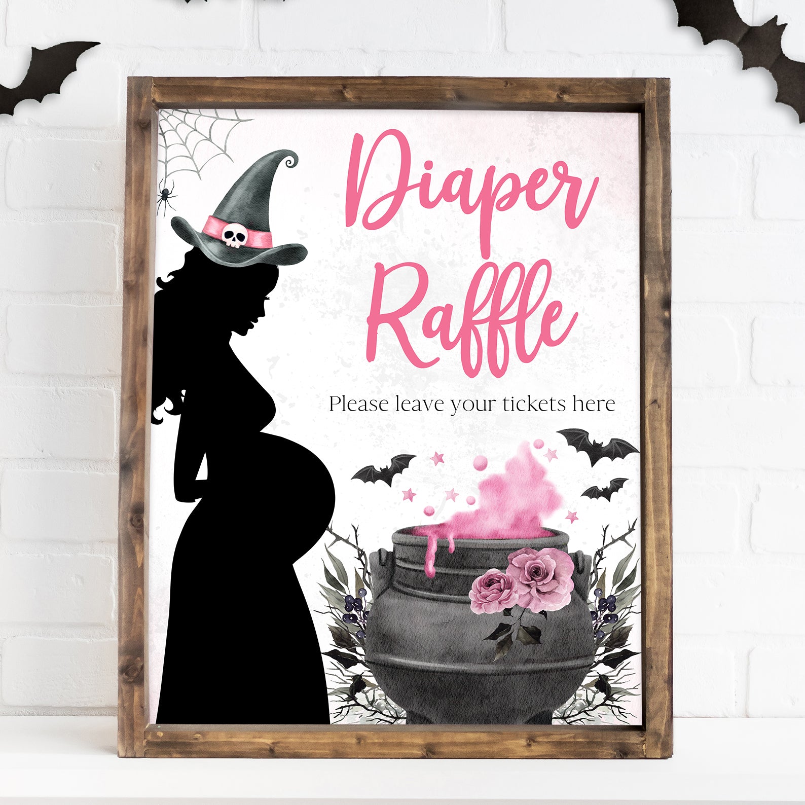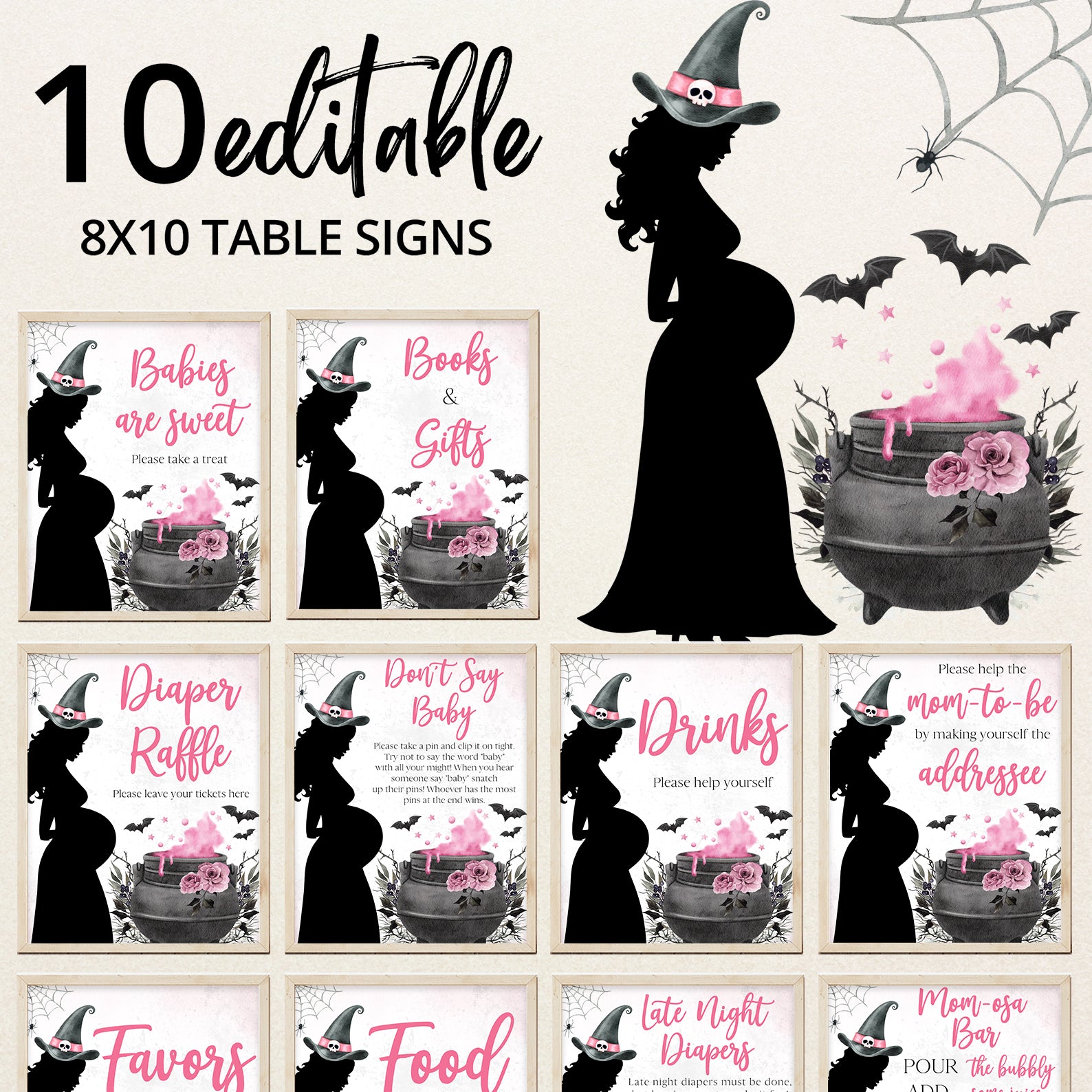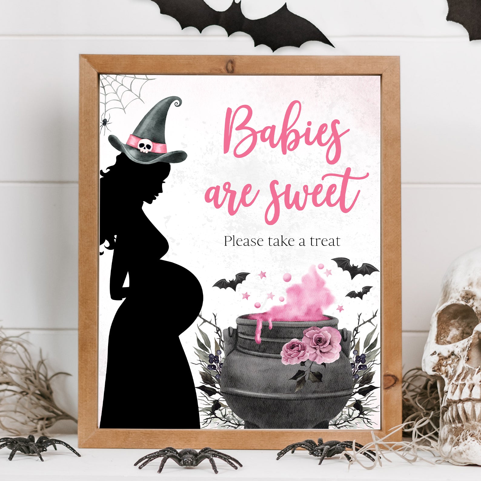 - Purchase this Spellbinding Pink Baby Shower Table Sign: Pregnant Witch & Cauldron template