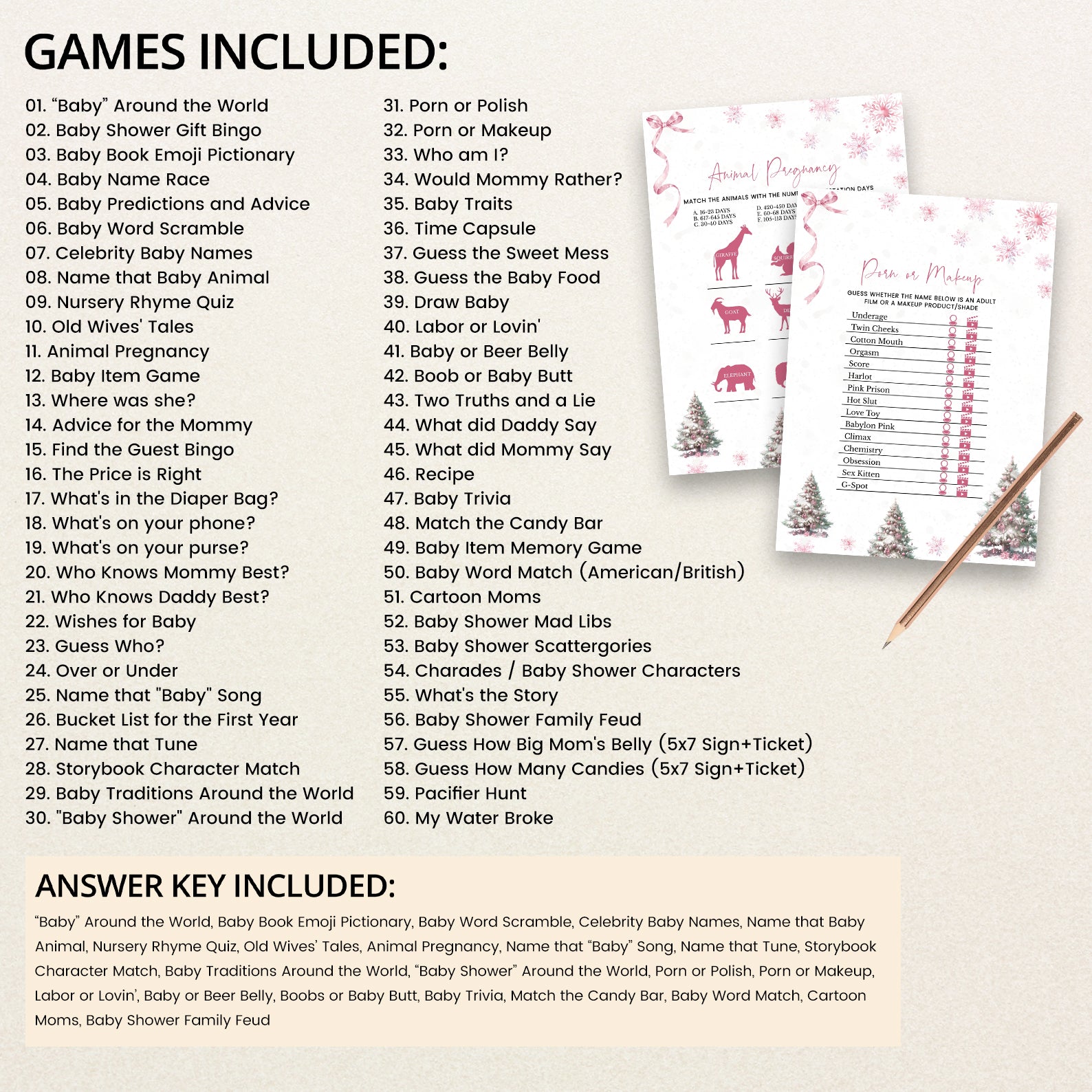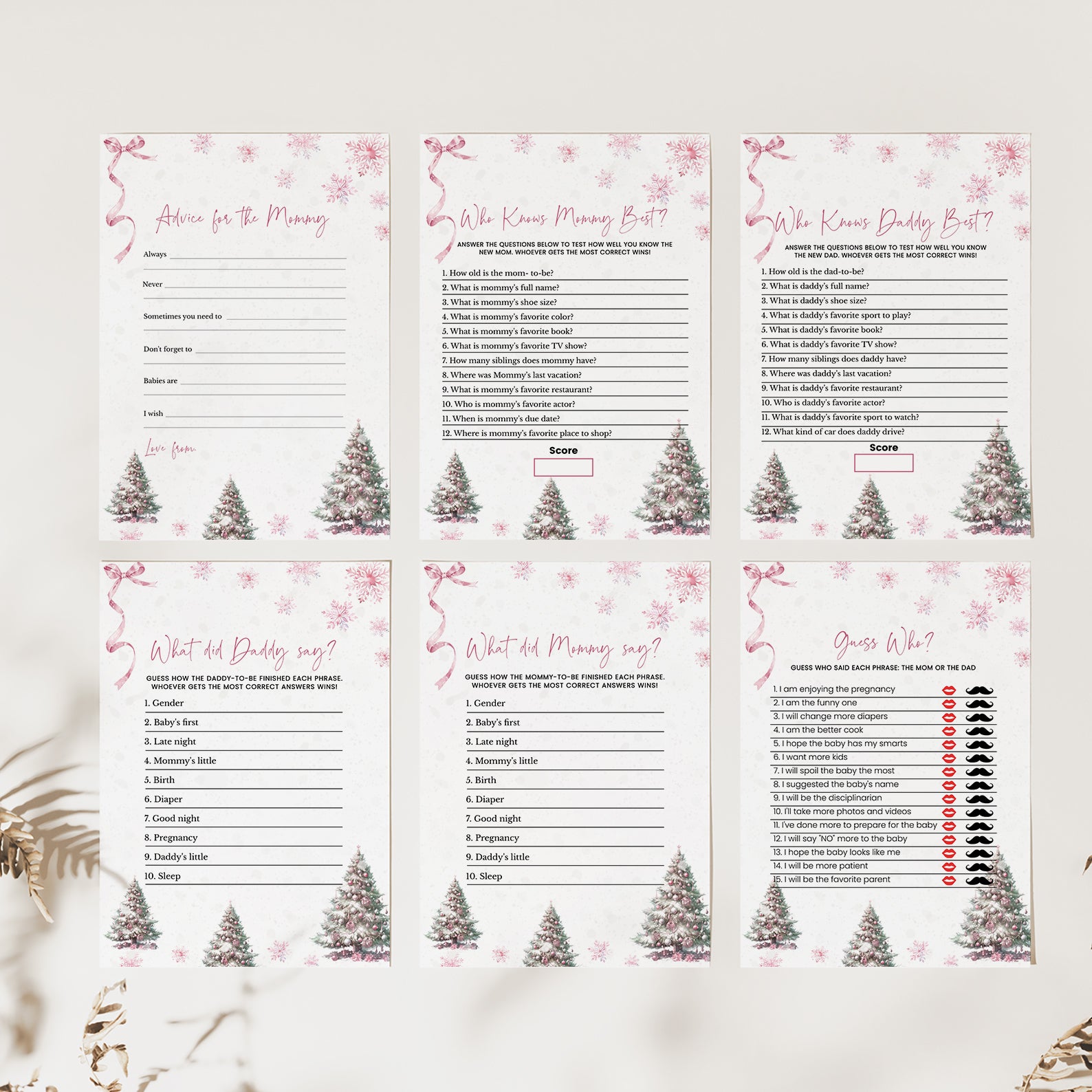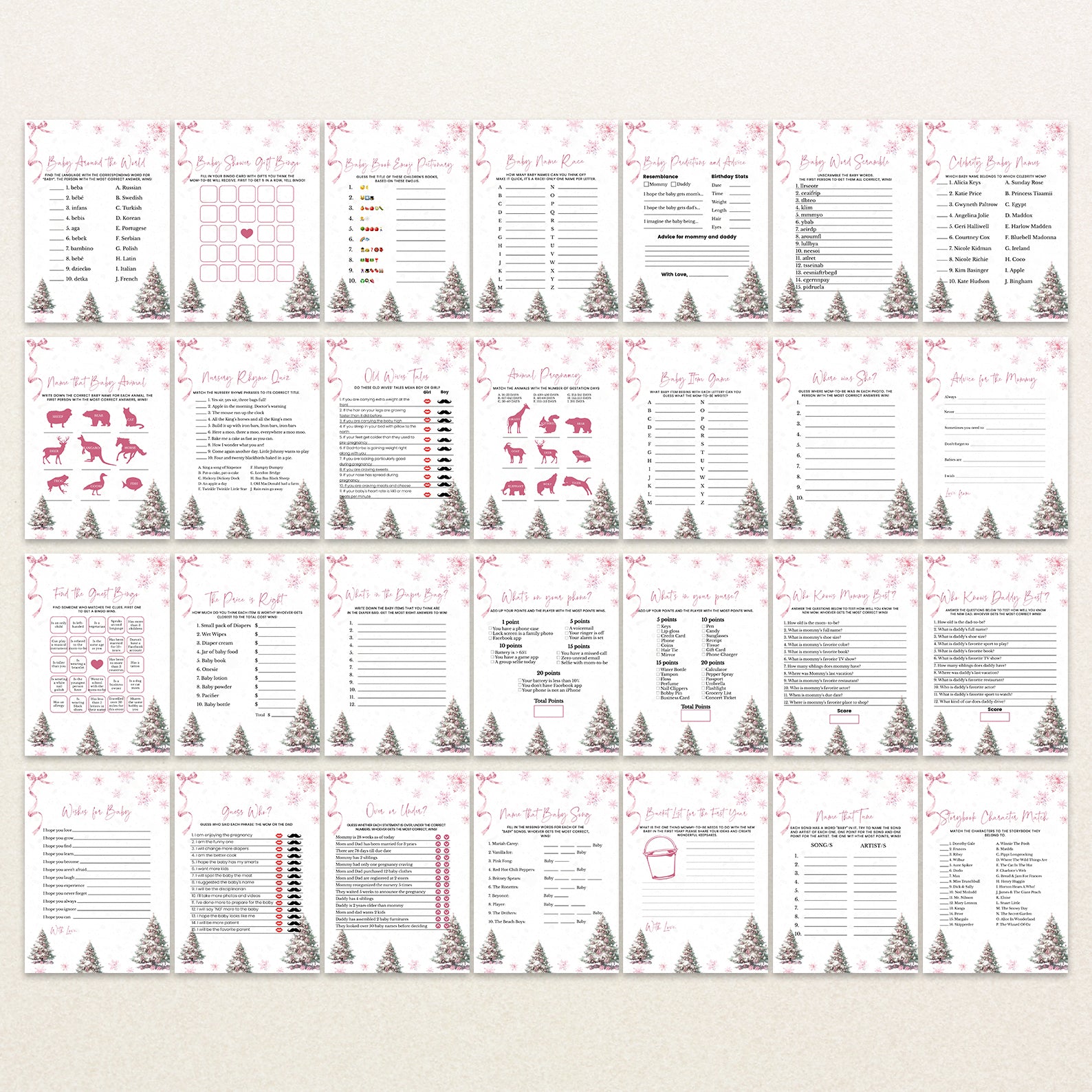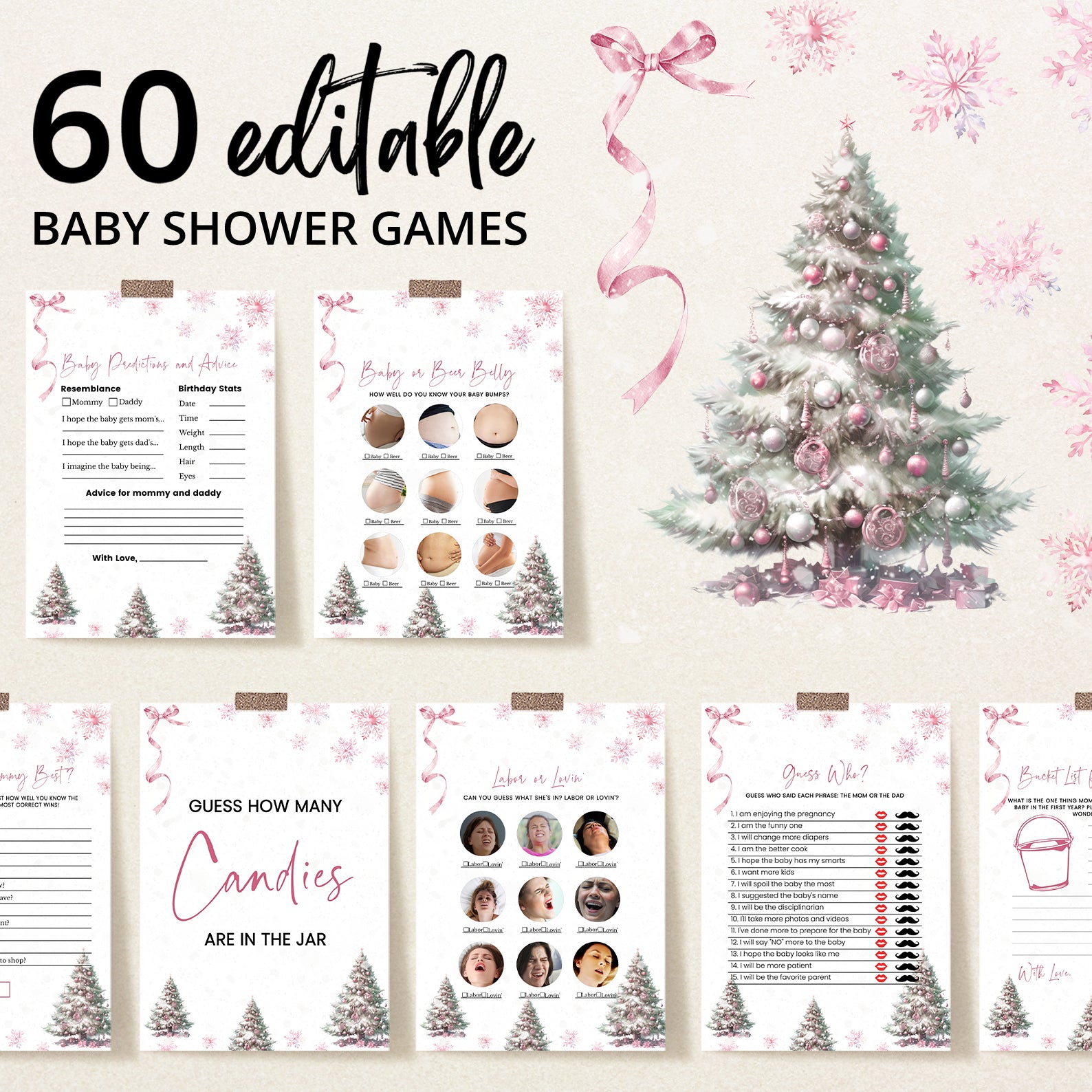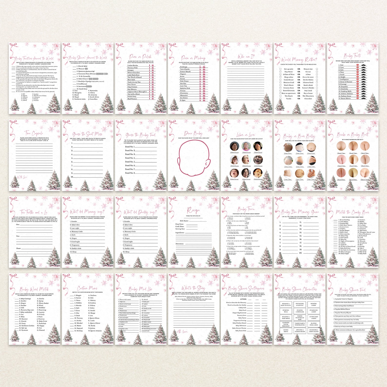 Keep your guests entertained with this 60-game editable baby shower bundle, designed with a charming pink winter theme. Delicate pink snowflakes, festive Christmas trees, and glittering ornaments create a cheerful yet elegant look. Each game is customizable and easy to print, offering a mix of fun challenges and icebreakers to make your pink-themed winter baby shower lively and memorable.