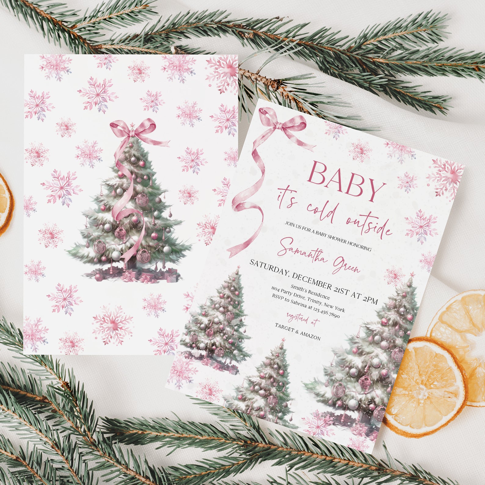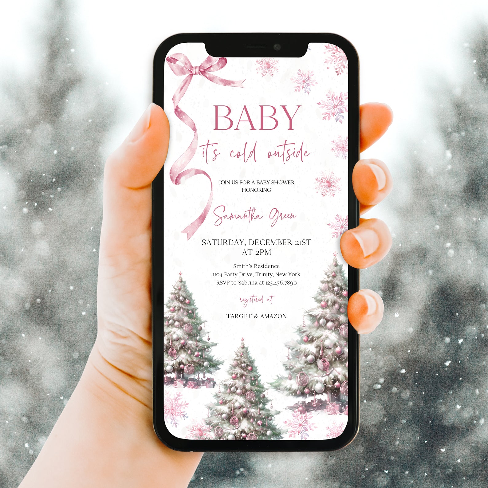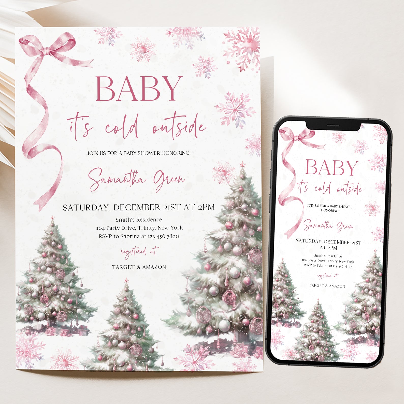 Embrace the magic of winter with our enchanting digital invitation for your baby shower! This charming design features a delightful pink theme, highlighted by a delicate pink ribbon at the top left and whimsical pink snowflakes dancing across the background. At the bottom, festive Christmas trees are adorned with pink ornaments and sparkling Christmas balls, while gentle snowflakes fall gracefully, creating a warm and inviting atmosphere for your celebration. Perfect for welcoming your little one in style!