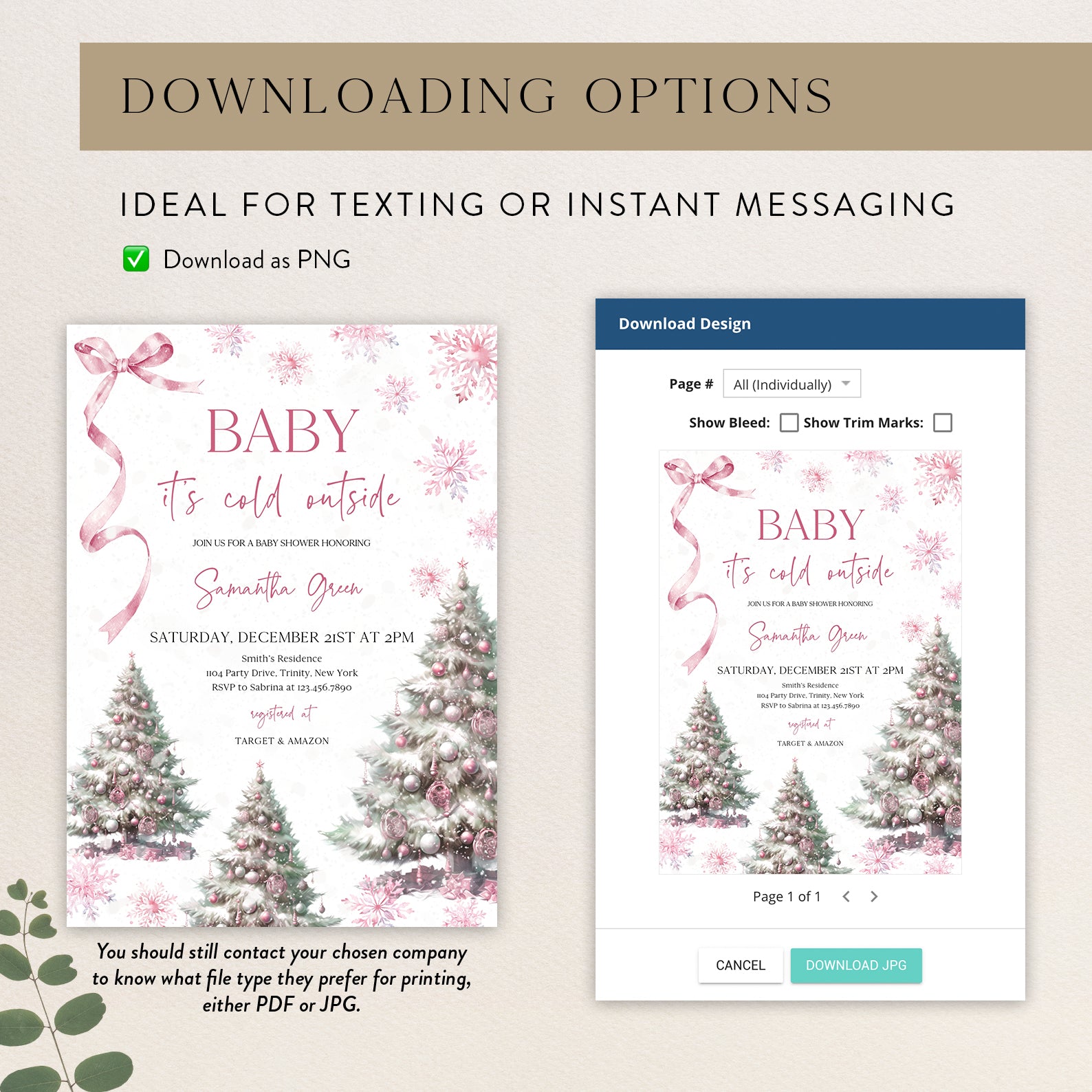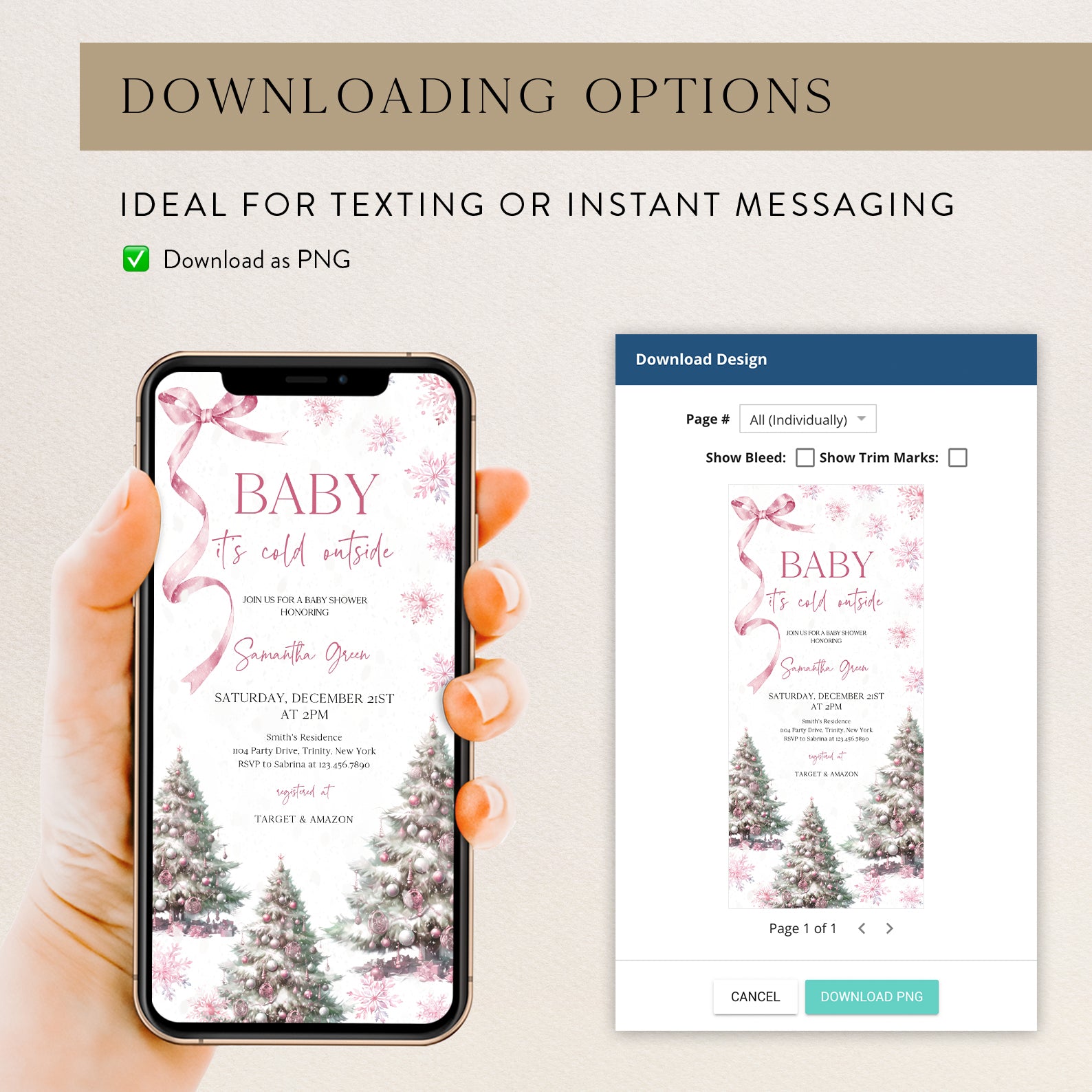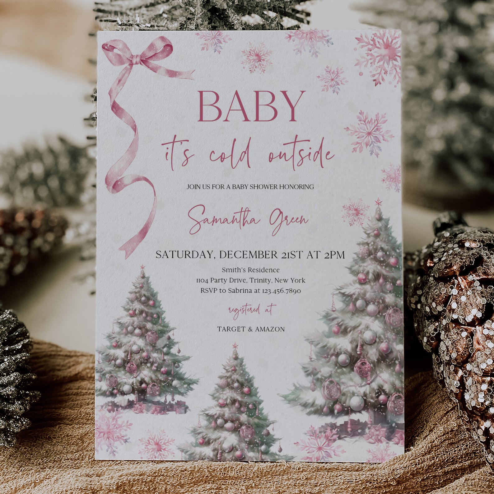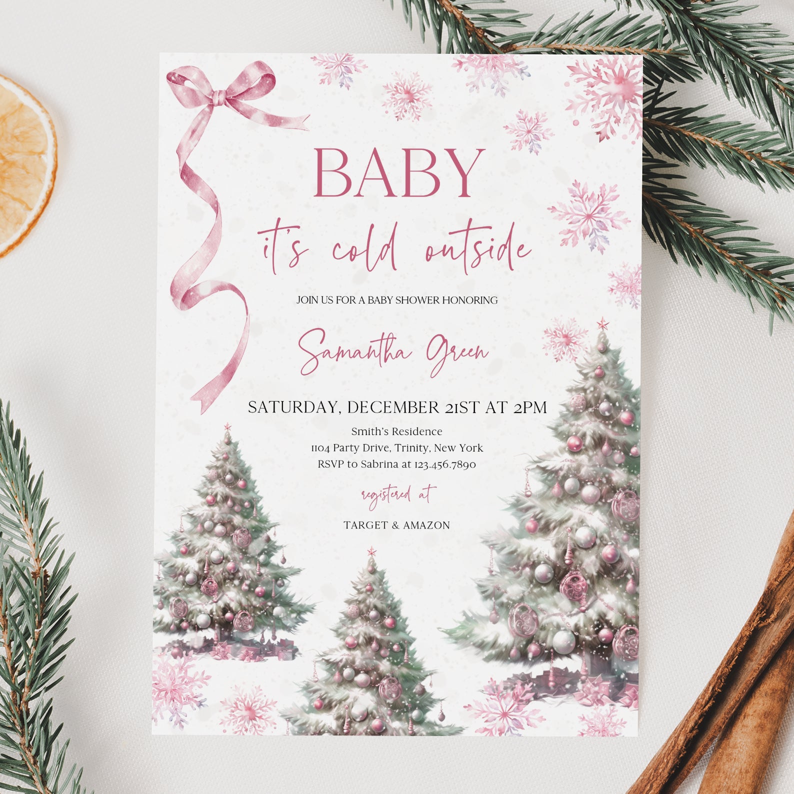 Embrace the magic of winter with our enchanting digital invitation for your baby shower! This charming design features a delightful pink theme, highlighted by a delicate pink ribbon at the top left and whimsical pink snowflakes dancing across the background. At the bottom, festive Christmas trees are adorned with pink ornaments and sparkling Christmas balls, while gentle snowflakes fall gracefully, creating a warm and inviting atmosphere for your celebration. Perfect for welcoming your little one in style!