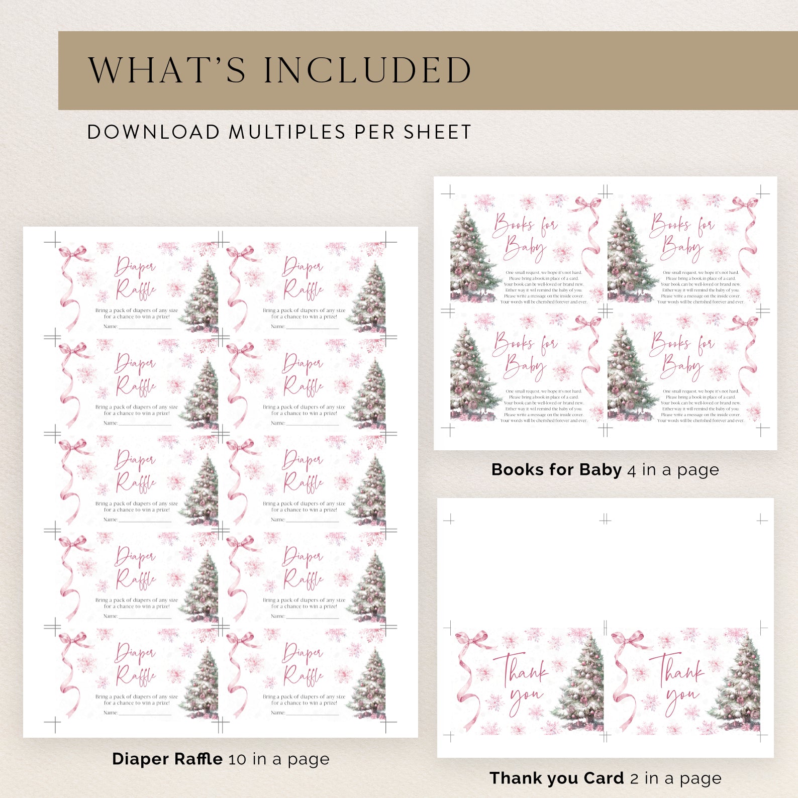 Welcome the joy of your little one with our delightful winter baby shower invitation bundle! This charming collection includes an invitation, mobile invite, diaper raffle, books for baby cards, and thank you cards, all featuring a lovely pink theme. Adorned with a delicate pink ribbon, whimsical snowflakes, and festive Christmas trees decorated with pink ornaments, this set captures the warmth and excitement of your special celebration. Instantly downloadable and easy to customize, it’s the perfect way to invite loved ones to join in the festivities!