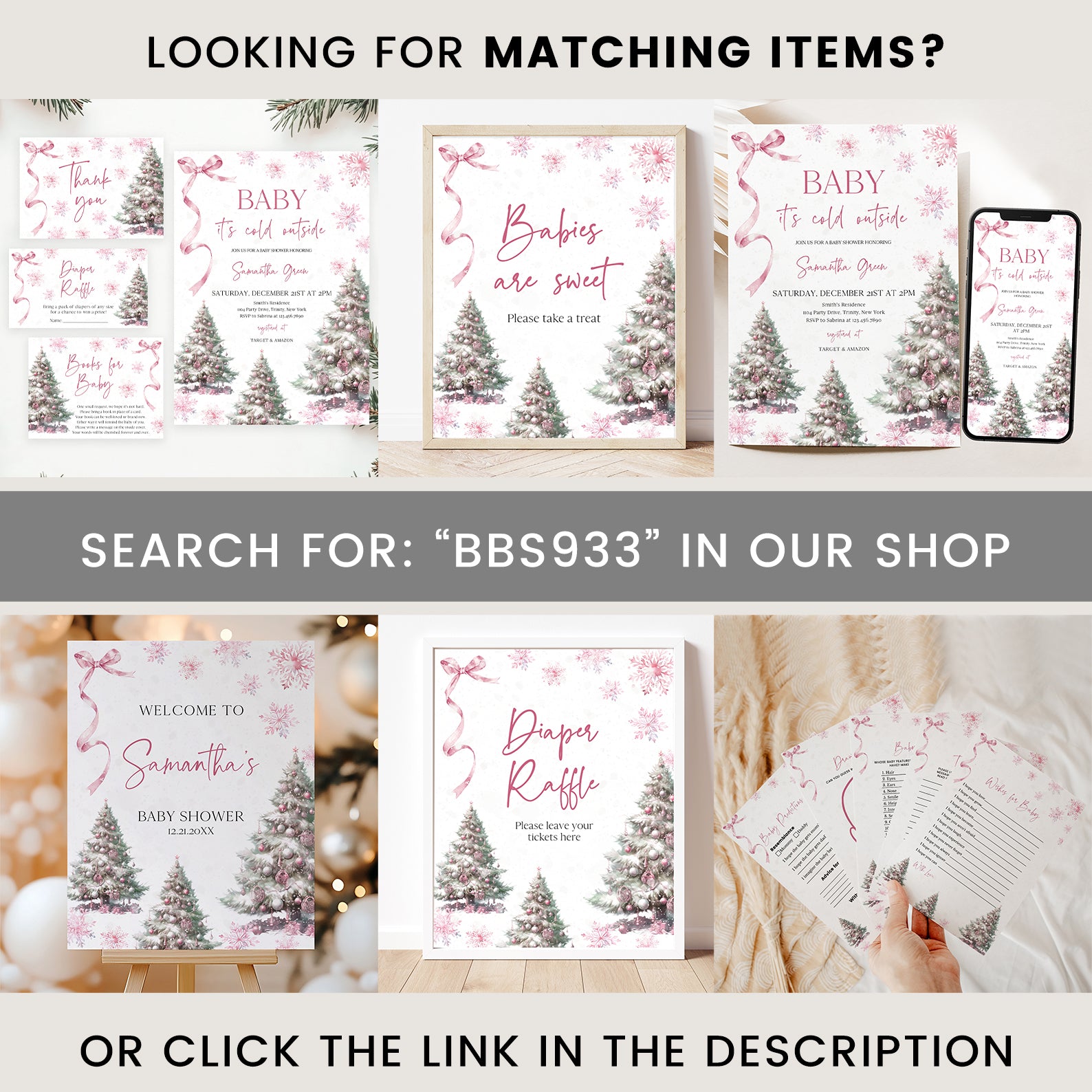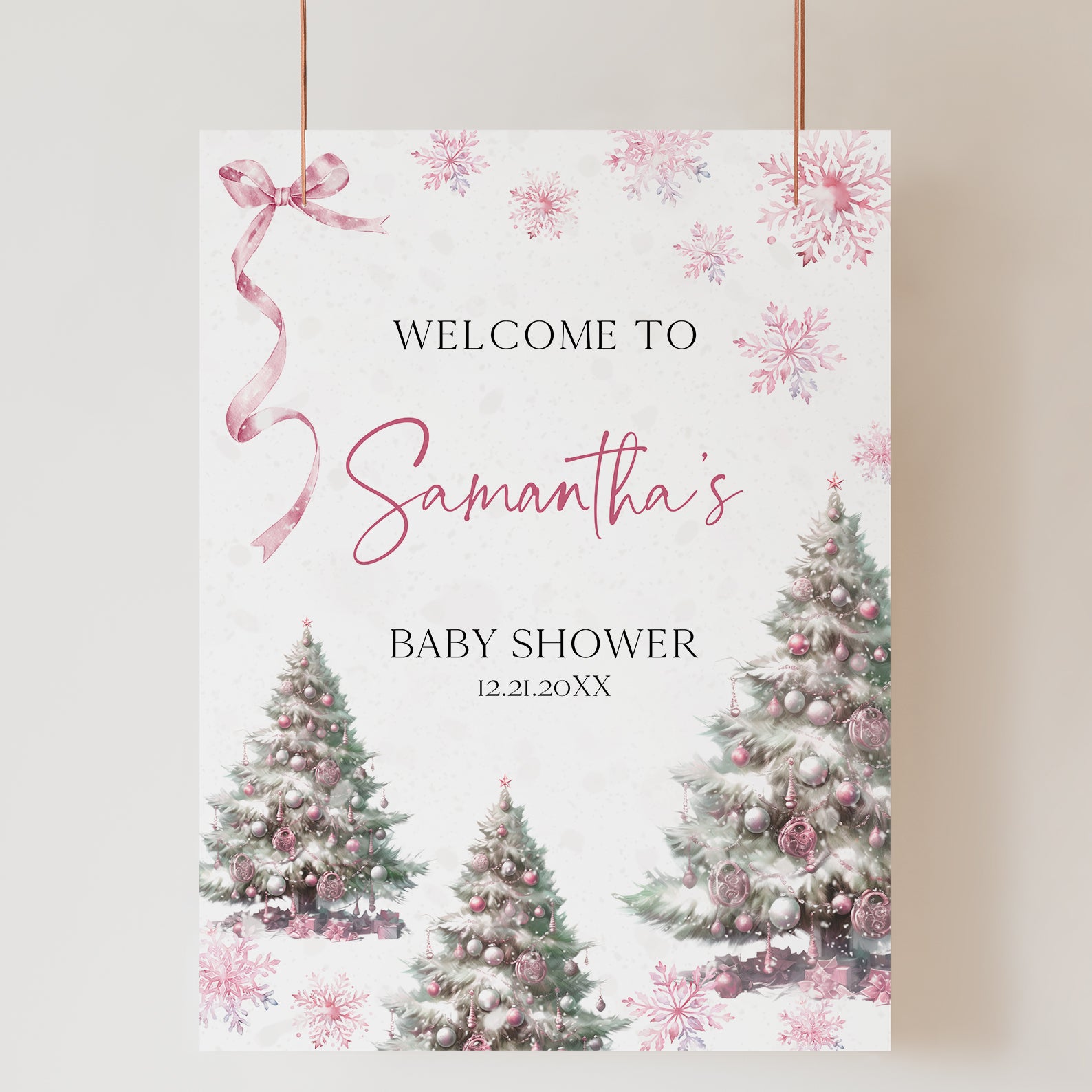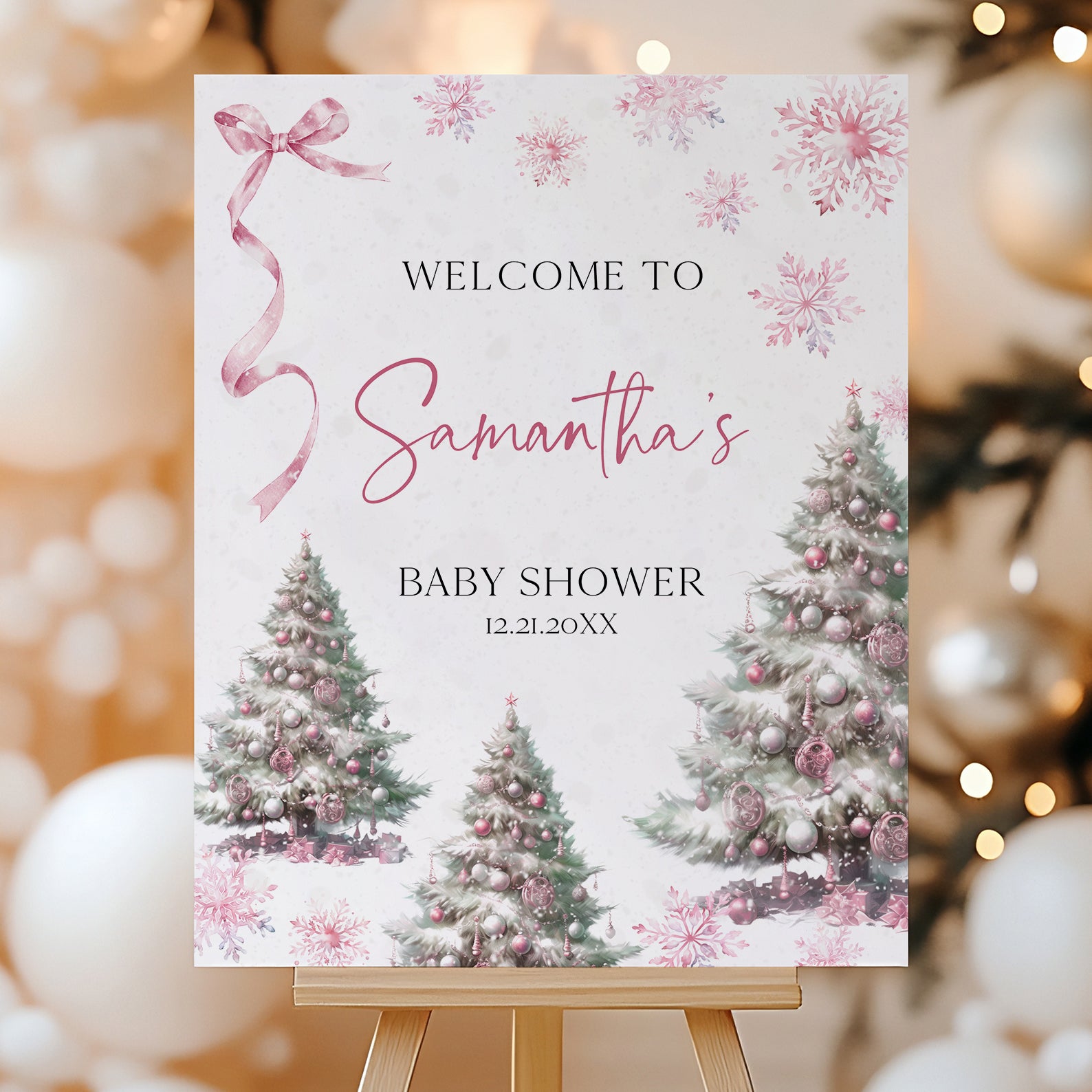 Greet your guests in style with our enchanting winter baby shower welcome sign! Featuring a lovely pink theme, this sign is adorned with delicate snowflakes and festive Christmas trees embellished with pink ornaments. Perfectly designed to create a warm and inviting atmosphere, it’s a beautiful addition to your celebration, welcoming friends and family as they arrive to share in the joy of your little one's upcoming arrival!
