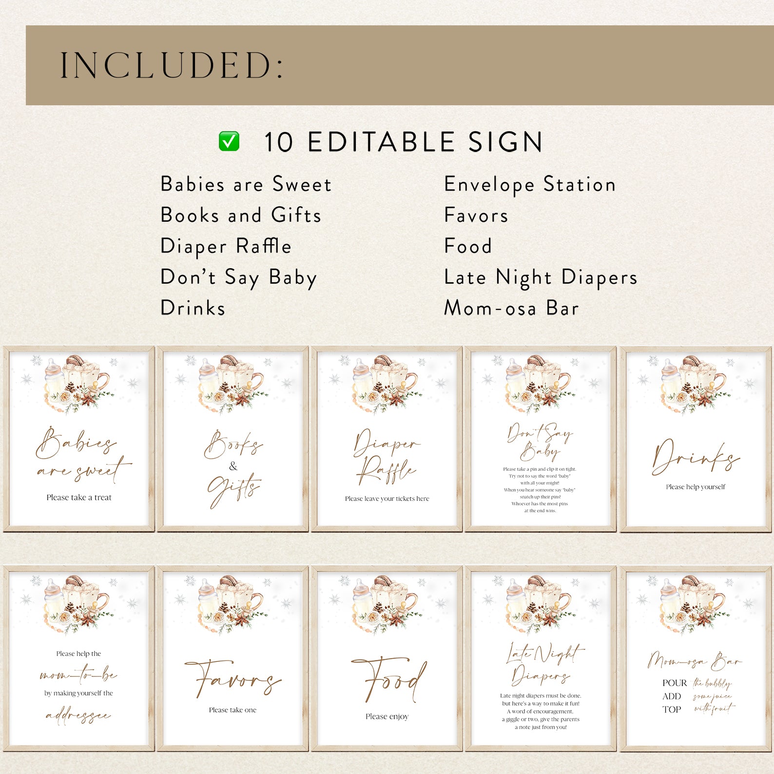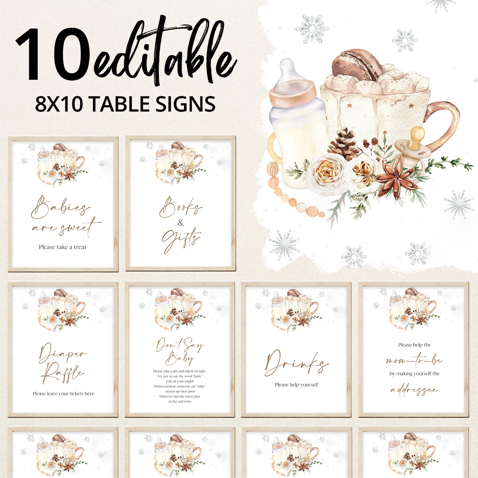 Add charm to your setup with our Baby It’s Cold Outside Winter Baby Shower Table Sign Bundle. This set includes 10 editable signs: Babies Are Sweet, Books and Gifts, Diaper Raffle, Don’t Say Baby, Drinks, Envelope Station, Favors, Food, Late Night Diapers, and Mom-osa Bar. Designed with cozy winter accents like pinecones, roses, and silver snowflakes, these signs beautifully complement your seasonal baby shower theme.