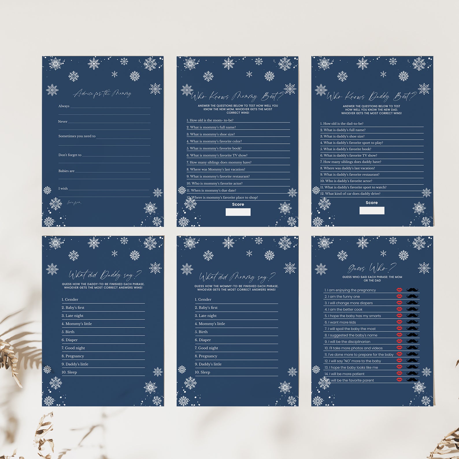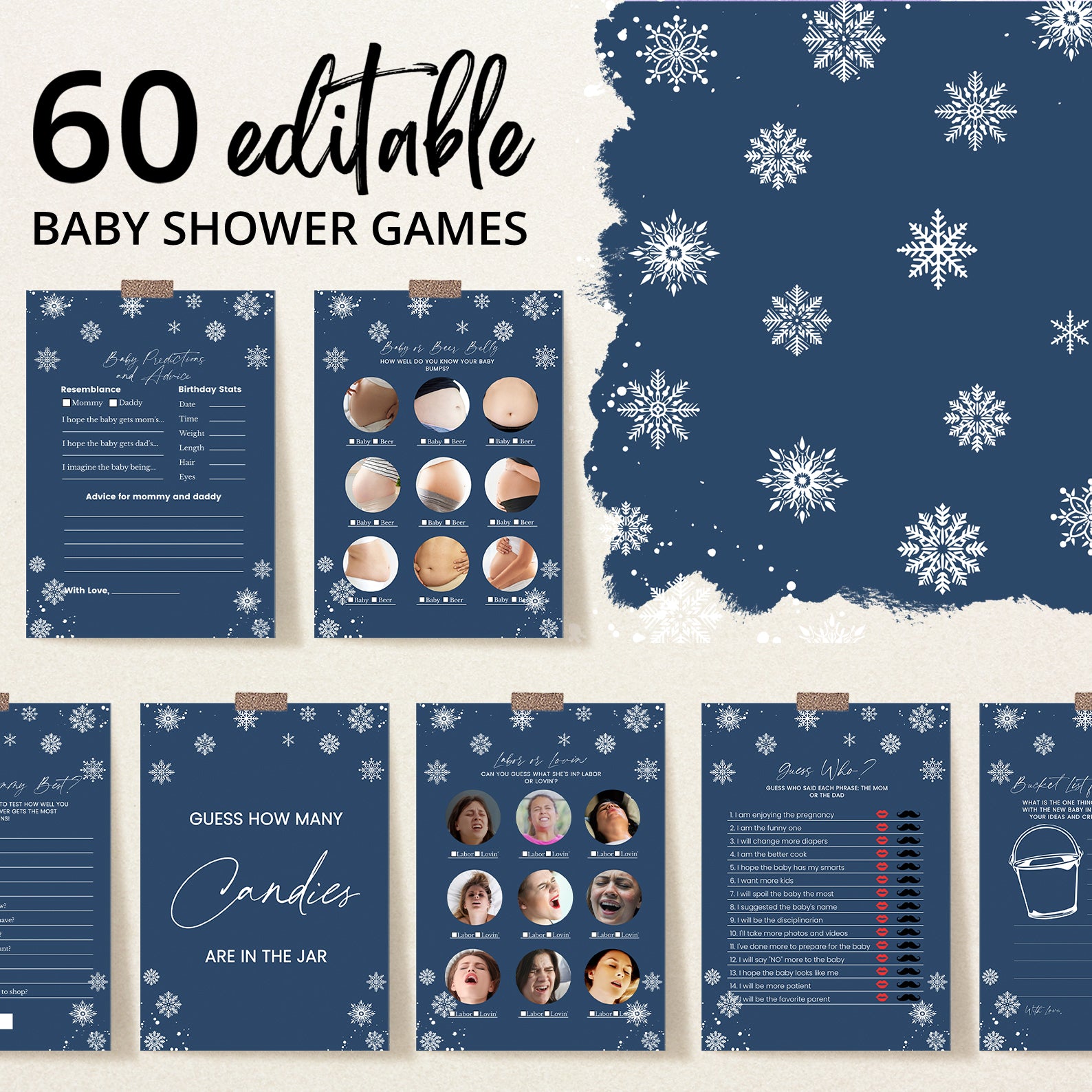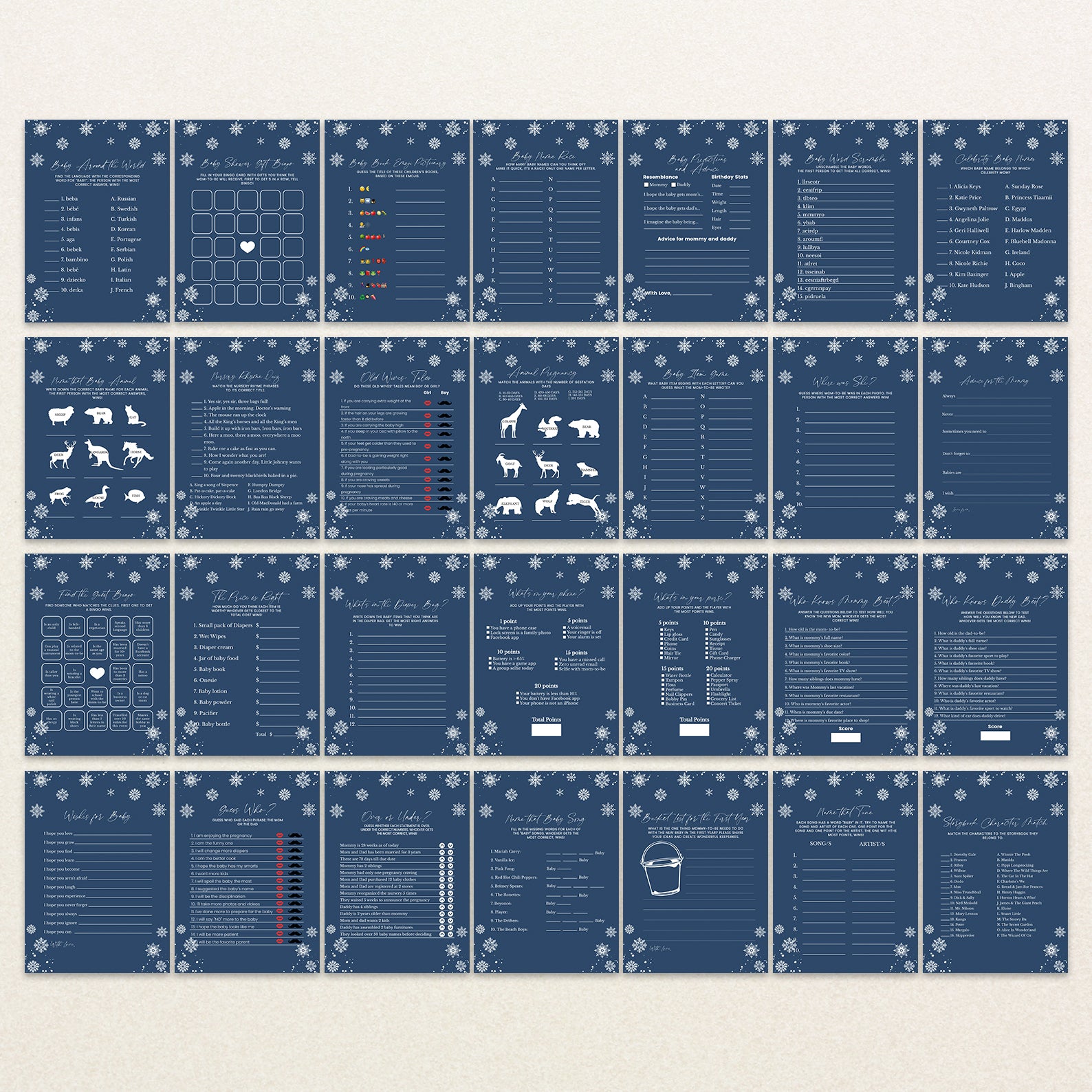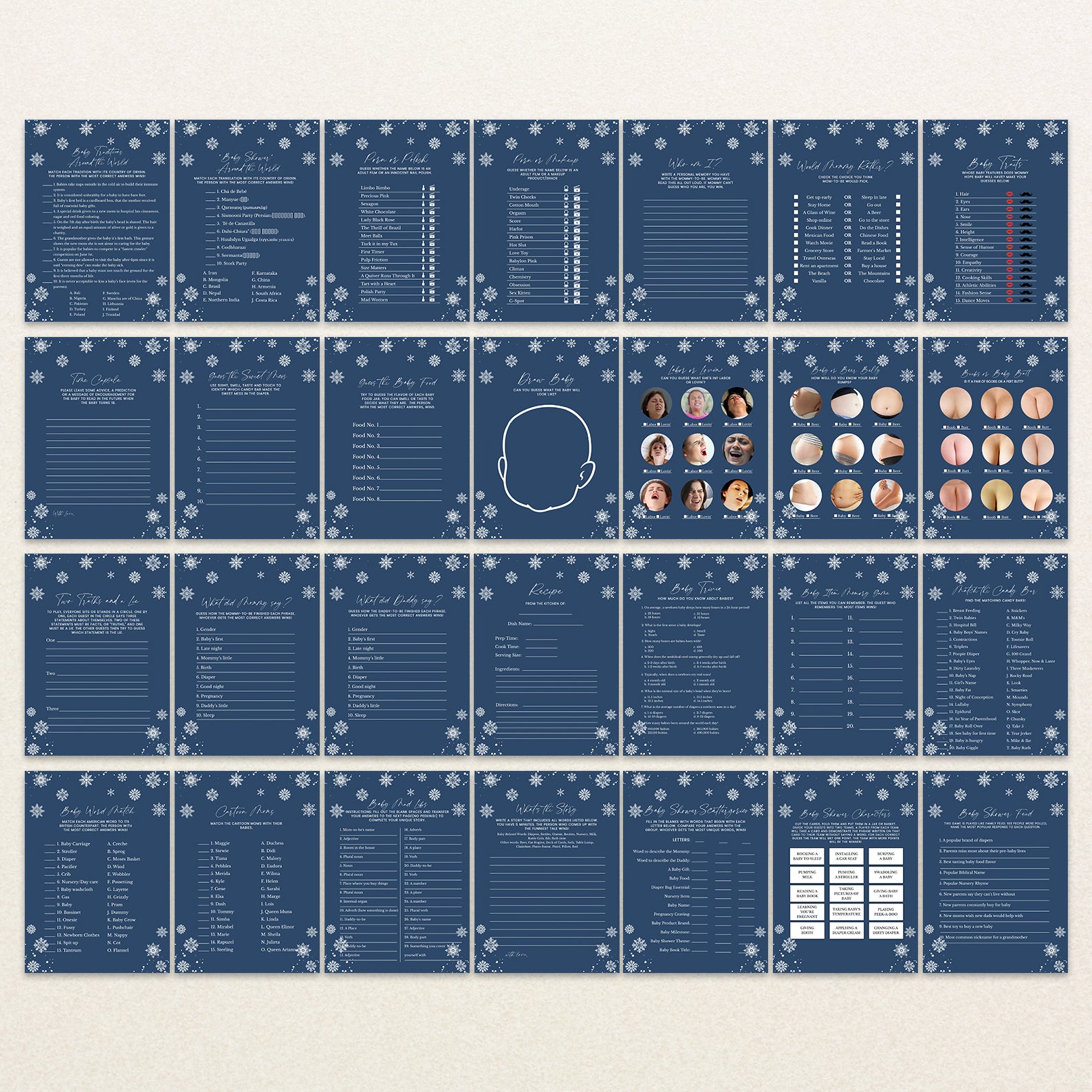 Entertain guests in style with our 60 editable winter baby shower games. Featuring a chic minimalist design with delicate snowflakes in calming blue or beige, these printable games perfectly complement your “Baby, It’s Cold Outside” theme. Ideal for keeping the party lively while maintaining a coordinated and elegant seasonal look.