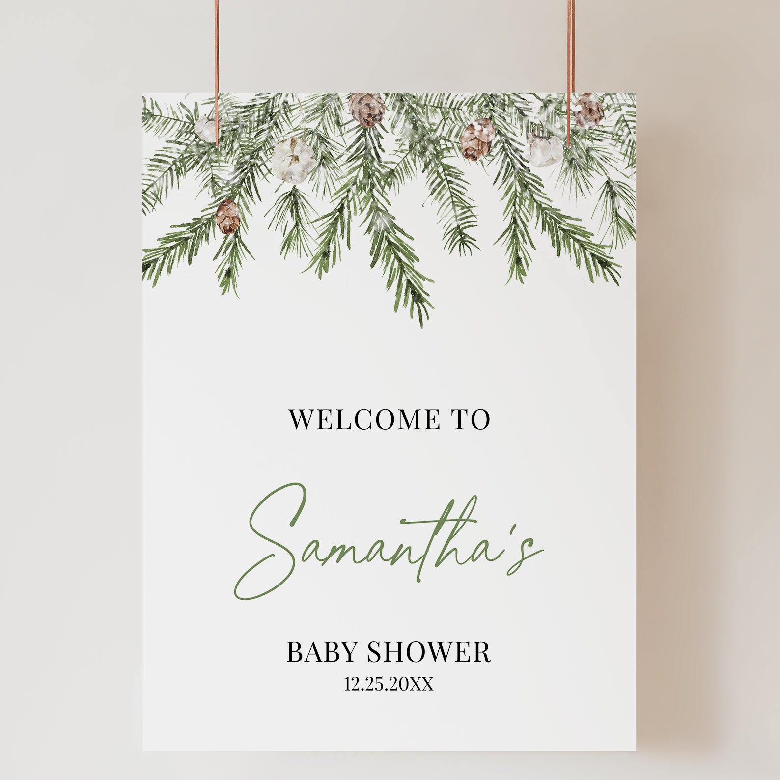Minimalist Winter Baby Shower Welcome Sign: Green Christmas Theme