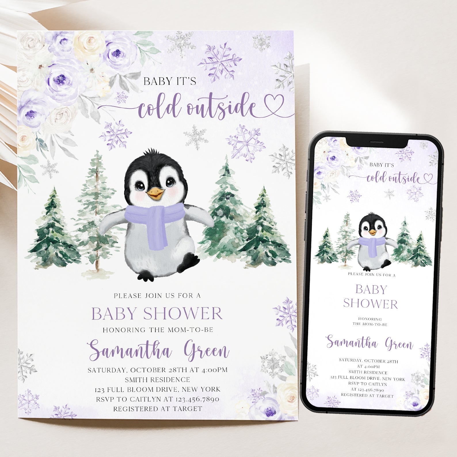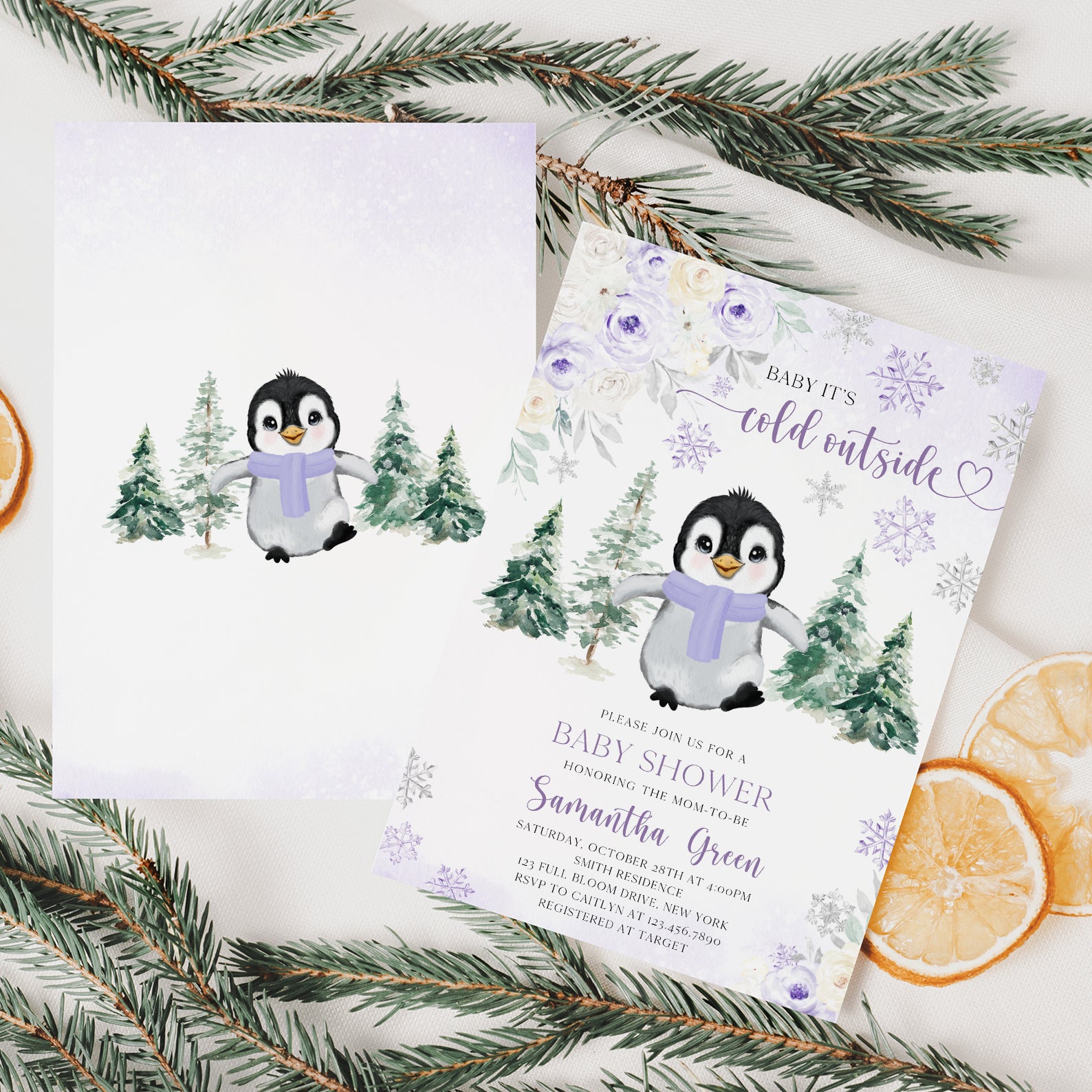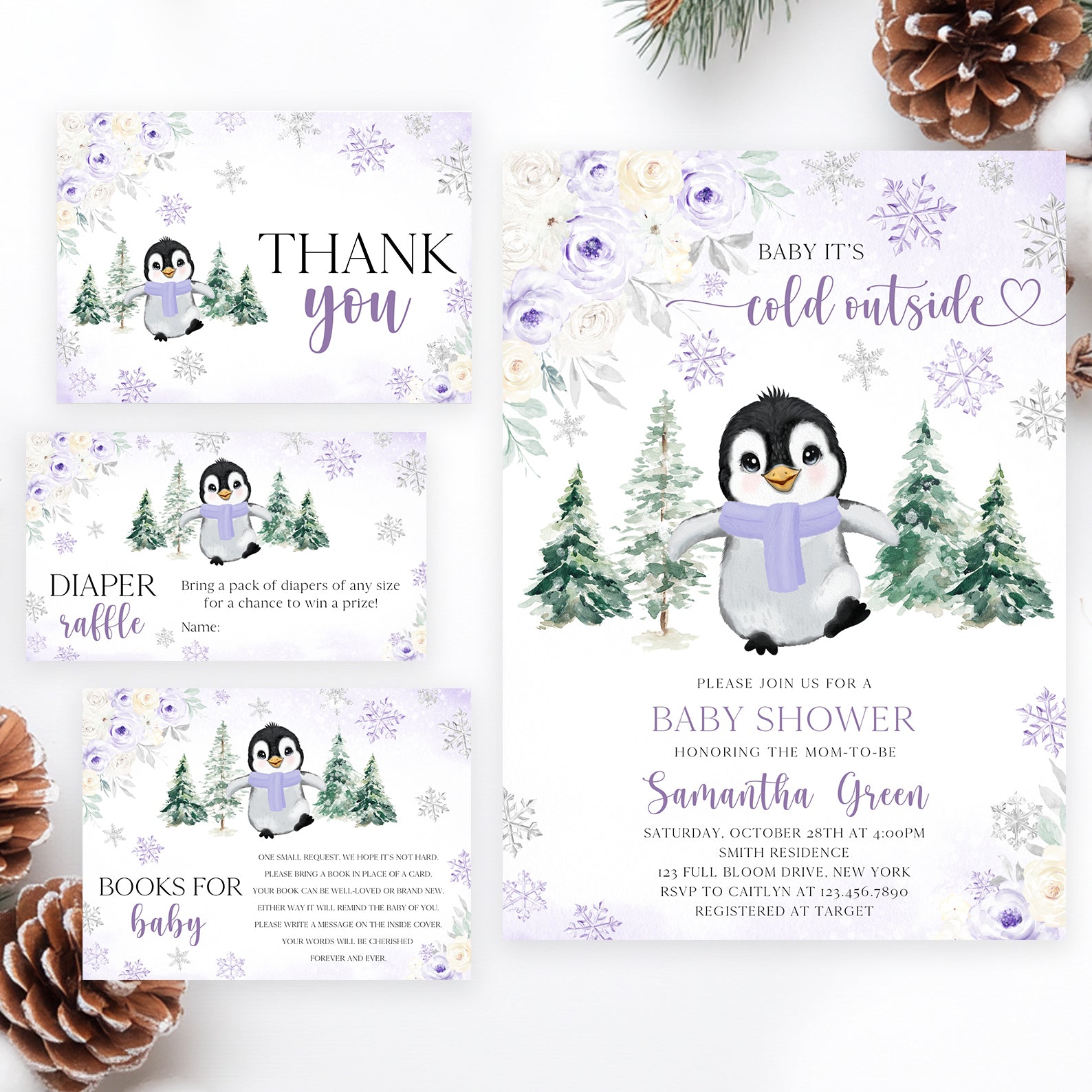 Penguin Baby It's Cold Outside: Winter Baby Shower Purple Invite Bundle