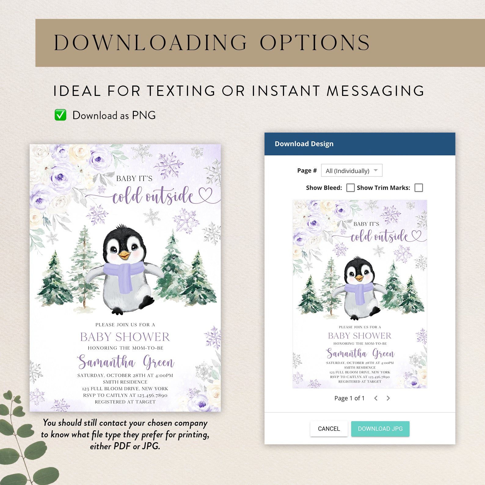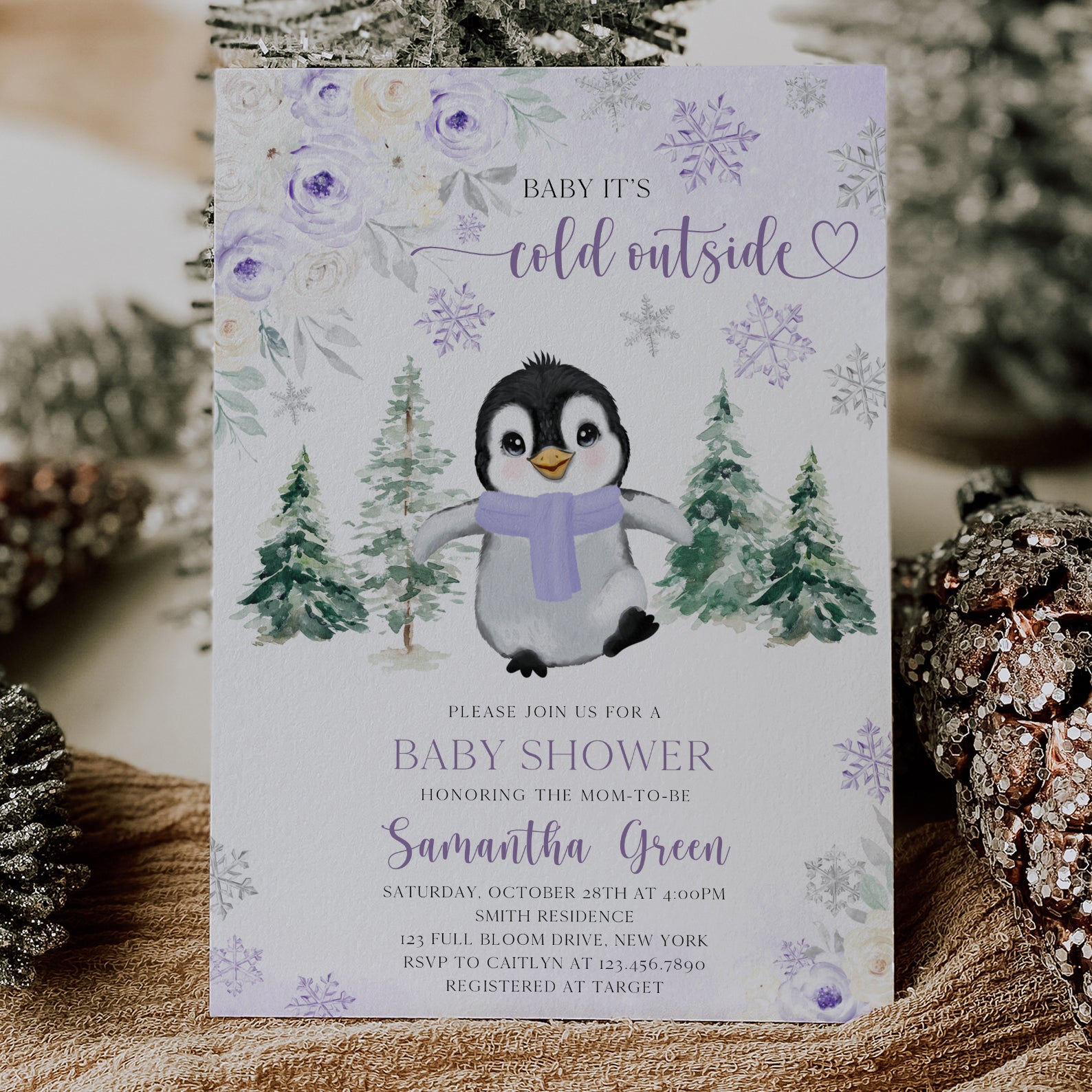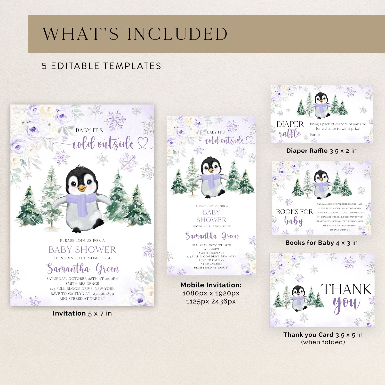 1. Purchase this Penguin Baby It's Cold Outside: Winter Baby Shower Purple Invite Bundle template